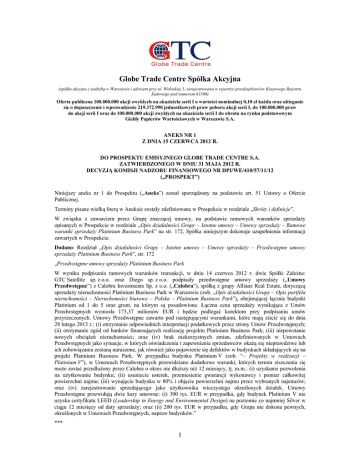 Globe Trade Centre Spółka Akcyjna (spółka akcyjna z siedzibą w Warszawie i adresem przy ul. Wołoskiej 5, zarejestrowana w rejestrze przedsiębiorców Krajowego Rejestru Sadowego pod numerem 61500) Oferta publiczna 100.000.000 akcji zwykłych na okaziciela serii I o wartości nominalnej 0,10 zł każda oraz ubieganie się o dopuszczenie i wprowadzenie 219.372.990 jednostkowych praw poboru akcji serii I, do 100.000.000 praw do akcji serii I oraz do 100.000.000 akcji zwykłych na okaziciela serii I do obrotu na rynku podstawowym Giełdy Papierów Wartościowych w Warszawie S.A. ANEKS NR 1 Z DNIA 15 CZERWCA 2012 R. DO PROSPEKTU EMISYJNEGO GLOBE TRADE CENTRE S.A. ZATWIERDZONEGO W DNIU 31 MAJA 2012 R. DECYZJĄ KOMISJI NADZORU FINANSOWEGO NR DPI/WE/410/57/11/12 („PROSPEKT”) Niniejszy aneks nr 1 do Prospektu („Aneks”) został sporządzony na podstawie art. 51 Ustawy o Ofercie Publicznej. Terminy pisane wielką literą w Aneksie zostały zdefiniowane w Prospekcie w rozdziale „Skróty i definicje”. W związku z zawarciem przez Grupę znaczącej umowy, na podstawie ramowych warunków sprzedaży opisanych w Prospekcie w rozdziale „Opis działalności Grupy – Istotne umowy – Umowy sprzedaży – Ramowe warunki sprzedaży Platinium Business Park” na str. 172, Spółka niniejszym dokonuje uzupełnienia informacji zawartych w Prospekcie. Dodano: Rozdział „Opis działalności Grupy – Istotne umowy – Umowy sprzedaży – Przedwstępne umowy sprzedaży Platinium Business Park”, str. 172 „Przedwstępne umowy sprzedaży Platinium Business Park W wyniku podpisania ramowych warunków transakcji, w dniu 14 czerwca 2012 r. dwie Spółki Zależne: GTC Satellite sp. z o.o. oraz Diego sp. z o.o. podpisały przedwstępne umowy sprzedaży („Umowy Przedwstępne”) z Calobra Investments Sp. z o.o. („Calobra”), spółką z grupy Allianz Real Estate, dotyczącą sprzedaży nieruchomości Platinium Business Park w Warszawie (zob. „Opis działalności Grupy – Opis portfela nieruchomości – Nieruchomości biurowe – Polska – Platinium Business Park”), obejmującej łącznie budynki Platinium od 1 do 5 oraz grunt, na którym są posadowione. Łączna cena sprzedaży wynikająca z Umów Przedwstępnych wyniosła 173,37 milionów EUR i będzie podlegać korektom przy podpisaniu umów przyrzeczonych. Umowy Przedwstępne zawarto pod następującymi warunkami, które mają ziścić się do dnia 28 lutego 2013 r.: (i) otrzymanie odpowiednich interpretacji podatkowych przez strony Umów Przedwstępnych; (ii) otrzymanie zgód od banków finansujących realizację projektu Platinium Business Park; (iii) niepowstanie nowych obciążeń nieruchomości; oraz (iv) brak niekorzystnych zmian, zdefiniowanych w Umowach Przedwstępnych jako sytuacje, w których oświadczenia i zapewnienia sprzedawców okażą się nieprawdziwe lub ich zobowiązania zostaną naruszone, jak również jako pojawienie się defektów w budynkach składających się na projekt Platinium Business Park. W przypadku budynku Platinium V (zob. “– Projekty w realizacji – Platinium V”), w Umowach Przedwstępnych przewidziano dodatkowe warunki, których termin ziszczenia się może zostać przedłużony przez Calobra o okres nie dłuższy niż 12 miesięcy, tj. m.in.: (i) uzyskanie pozwolenia na użytkowanie budynku; (ii) usuniecie usterek, przeniesienie gwarancji wykonawcy i pomiar całkowitej powierzchni najmu; (iii) wynajęcie budynku w 80% i objęcie powierzchni najmu przez wybranych najemców; oraz (iv) zarejestrowanie sprzedającego jako użytkownika wieczystego określonych działek. Umowy Przedwstępne przewidują dwie kary umowne: (i) 300 tys. EUR w przypadku, gdy budynek Platinium V nie uzyska certyfikatu LEED (Leadership in Energy and Environmental Design) na poziomie co najmniej Silver w ciągu 12 miesięcy od daty sprzedaży; oraz (ii) 200 tys. EUR w przypadku, gdy Grupa nie dokona pewnych, określonych w Umowach Przedwstępnych, napraw budynków.” *** 1 Było: Rozdział „Przegląd sytuacji operacyjnej i finansowej – Szczególne zdarzenia wpływające na wyniki operacyjne i finansowe – Zbycie istotnych aktywów”, str. 75: „W październiku 2011 r. Spółka uzgodniła ramowe warunki transakcji z Grupą Allianz dotyczące sprzedaży Platinium Business Park w Warszawie. Realizacja ostatecznej umowy zależy od pozytywnego wyniku badania due diligence i uzyskania zgód ze strony organów statutowych kupującego i sprzedającego (zob. „Opis działalności Grupy – Istotne umowy – Umowy sprzedaży – Ramowe warunki sprzedaży Platinium Business Park”). W wyniku podpisania ramowych warunków transakcji budynki biurowe Platinium Business Park (o wartości 134,1 mln EUR na dzień 31 grudnia 2011 r.), wcześniej wykazywane jako nieruchomości inwestycyjne, zostały wykazane jako aktywa przeznaczone do sprzedaży, a związane z nimi kredyty zostały przekwalifikowane do zobowiązań krótkoterminowych, zaś stosowne zabezpieczenia zostały rozpoznane w rachunku zysków i strat.” Jest: Rozdział „Przegląd sytuacji operacyjnej i finansowej – Szczególne zdarzenia wpływające na wyniki operacyjne i finansowe – Zbycie istotnych aktywów”, str. 75: „W październiku 2011 r. Spółka uzgodniła ramowe warunki transakcji z Grupą Allianz dotyczące sprzedaży Platinium Business Park w Warszawie (zob. „Opis działalności Grupy – Istotne umowy – Umowy sprzedaży – Ramowe warunki sprzedaży Platinium Business Park”). W wyniku podpisania ramowych warunków transakcji budynki biurowe Platinium Business Park (o wartości 134,1 mln EUR na dzień 31 grudnia 2011 r.), wcześniej wykazywane jako nieruchomości inwestycyjne, zostały wykazane jako aktywa przeznaczone do sprzedaży, a związane z nimi kredyty zostały przekwalifikowane do zobowiązań krótkoterminowych, zaś stosowne zabezpieczenia zostały rozpoznane w rachunku zysków i strat. W dniu 14 czerwca 2012 r. Grupa zawarła