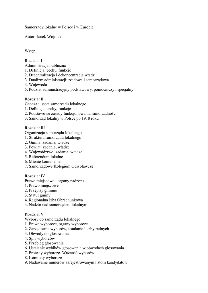 Samorządy lokalne w Polsce i w Europie. Autor: Jacek Wojnicki Wstęp Rozdział I Administracja publiczna 1. Definicja, cechy, funkcje 2. Decentralizacja i dekoncentracja władz 3. Dualizm administracji: rządowa i samorządowa 4. Wojewoda 5. Podział administracyjny podstawowy, pomocniczy i specjalny Rozdział II Geneza i istota samorządu lokalnego 1. Definicja, cechy, funkcje 2. Podstawowe zasady funkcjonowania samorządności 3. Samorząd lokalny w Polsce po 1918 roku Rozdział III Organizacja samorządu lokalnego 1. Struktura samorządu lokalnego 2. Gmina: zadania, władze 3. Powiat: zadania, władze 4. Województwo: zadania, władze 5. Referendum lokalne 6. Mienie komunalne 7. Samorządowe Kolegium Odwoławcze Rozdział IV Prawo miejscowe i organy nadzoru 1. Prawo miejscowe 2. Przepisy gminne 3. Statut gminy 4. Regionalna Izba Obrachunkowa 4. Nadzór nad samorządem lokalnym Rozdział V Wybory do samorządu lokalnego 1. Prawa wyborcze, organy wyborcze 2. Zarządzanie wyborów, ustalanie liczby radnych 3. Obwody do głosowania 4. Spis wyborców 5. Przebieg głosowania 6. Ustalanie wybików głosowania w obwodach głosowania 7. Protesty wyborcze. Ważność wyborów 8. Komitety wyborcze 9. Nadawanie numerów zarejestrowanym listom kandydatów 1O. Kampania wyborcza 11. Finansowanie wyborów 12. Finansowanie kampanii wyborczej 13. Wybory do rad gmin 14. Wybory do rad powiatów 15. Wybory do sejmików województw 16. Wygaśnięcia mandatu radnego 17. Wybory uzupełniające 18. Wybory bezpośrednie wójta (burmistrza, prezydenta miasta) Rozdział VI Finanse samorządu lokalnego Rozdział VII Samorząd lokalny a standardy europejskie 1. Europejska Karta Samorządu Terytorialnego 2. Współpraca transgraniczna 3. Europejskie instytucje samorządowe 4. Konwencje międzynarodowe Rozdział VIII System władzy lokalnej w Europie Zachodniej 1. Francja 2. Wielka Brytania 3. Niemcy 4. Austria 5. Hiszpania 6. Belgia 7. Holandia 8. Szwajcaria Rozdział IX System władzy lokalnej w Europie Środkowo-Wschodniej Bibliografia