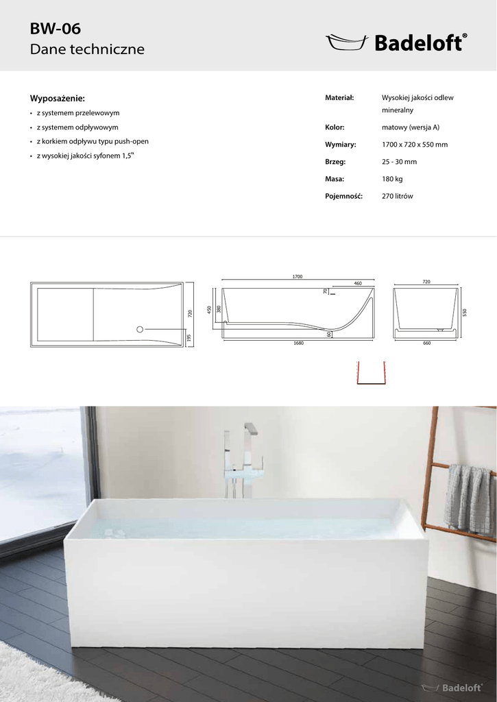 BW-06 Dane techniczne Wyposażenie: Materiał: • z systemem przelewowym mineralny • z systemem odpływowym Kolor: matowy (wersja A) • z korkiem odpływu typu push-open Wymiary: 1700 x 720 x 550 mm Brzeg: 25 - 30 mm Masa: 180 kg Pojemność: 270 litrów • z wysokiej jakości syfonem 1,5“ 1700 720 550 450 380 60 195 720 70 460 Wysokiej jakości odlew 1680 660 Badeloft®