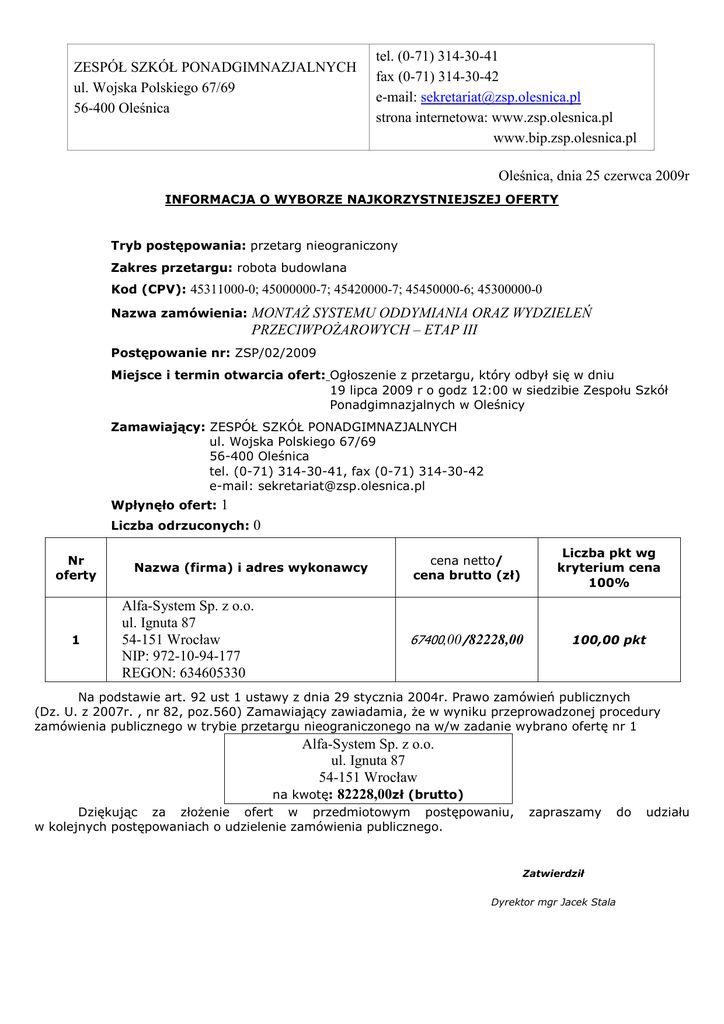 ZESPÓŁ SZKÓŁ PONADGIMNAZJALNYCH ul. Wojska Polskiego 67/69 56-400 Oleśnica tel. (0-71) 314-30-41 fax (0-71) 314-30-42 e-mail: [email protected] strona internetowa: www.zsp.olesnica.pl www.bip.zsp.olesnica.pl Oleśnica, dnia 25 czerwca 2009r INFORMACJA O WYBORZE NAJKORZYSTNIEJSZEJ OFERTY Tryb postępowania: przetarg nieograniczony Zakres przetargu: robota budowlana Kod (CPV): 45311000-0; 45000000-7; 45420000-7; 45450000-6; 45300000-0 Nazwa zamówienia: MONTAŻ SYSTEMU ODDYMIANIA ORAZ WYDZIELEŃ PRZECIWPOŻAROWYCH – ETAP III Postępowanie nr: ZSP/02/2009 Miejsce i termin otwarcia ofert: Ogłoszenie z przetargu, który odbył się w dniu 19 lipca 2009 r o godz 12:00 w siedzibie Zespołu Szkół Ponadgimnazjalnych w Oleśnicy Zamawiający: ZESPÓŁ SZKÓŁ PONADGIMNAZJALNYCH ul. Wojska Polskiego 67/69 56-400 Oleśnica tel. (0-71) 314-30-41, fax (0-71) 314-30-42 e-mail: [email protected] Wpłynęło ofert: 1 Liczba odrzuconych: Nr oferty 1 0 Nazwa (firma) i adres wykonawcy Alfa-System Sp. z o.o. ul. Ignuta 87 54-151 Wrocław NIP: 972-10-94-177 REGON: 634605330 cena netto/ cena brutto (zł) Liczba pkt wg kryterium cena 100% 67400,00/82228,00 100,00 pkt Na podstawie art. 92 ust 1 ustawy z dnia 29 stycznia 2004r. Prawo zamówień publicznych (Dz. U. z 2007r. , nr 82, poz.560) Zamawiający zawiadamia, że w wyniku przeprowadzonej procedury zamówienia publicznego w trybie przetargu nieograniczonego na w/w zadanie wybrano ofertę nr 1 Alfa-System Sp. z o.o. ul. Ignuta 87 54-151 Wrocław na kwotę: 82228,00zł (brutto) Dziękując za złożenie ofert w przedmiotowym postępowaniu, w kolejnych postępowaniach o udzielenie zamówienia publicznego. zapraszamy Zatwierdził Dyrektor mgr Jacek Stala do udziału