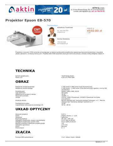 Projektor Epson EB-570 Twój konsultant NOWOŚĆ W OFERCIE Arkadiusz Trzebiński tel. 503 030 555 [email protected] 4598.97 zł 4550.00 zł z VAT Karina Gładecka 796 603 606 [email protected] Projektory o jasności 2700 lumenów od wiodącego na świecie producenta projektorów zapewniają tworzenie prezentacji z wysokiej jakości obrazami i mniejszą ilością cieni. Projektor EB-575W wyświetla duże panoramiczne obrazy z bardzo małej odległości dzięki m TECHNIKA System projekcyjny Panel LCD Technologia 3LCD 0,59 cal z MLA (D8) OBRAZ Natężenie światła barwnego Natężenie światła białego Rozdzielczość High Definition Współczynnik proporcji obrazu Stosunek kontrastu Lampa Korekcja obrazu Przetwarzanie wideo Częstotliwość odświeżania pionowego 2D 2.700 lumen-1.500 lumen (tryb ekonomiczny) 2.700 lumen - 1.500 lumen (tryb ekonomiczny) zgodne z normą ISO 21118:2012 WXGA, 1280 x 800, 16:10 HD ready 16:10 10.000 : 1 215 W, 5.000 h Żywotność, 10.000 h Żywotność (w trybie oszczędnym) Ręczna obsługa (lub "Instrukcja obsługi") pionowo: ± 3 °, Ręczna obsługa (lub "Instrukcja obsługi") poziomo ± 3 ° 10 Bit 50 Hz - 85 Hz UKŁAD OPTYCZNY Stosunek projekcji Zoom Obiektyw Rozmiar projekcji Odległość projekcyjna, system szerokokątny Odległość projekcyjna, system Tele Wartość przesłony obiektywu projekcyjnego Odległość ogniskowa Fokus Przesunięcie 0,27:1 Digital, Factor: 1 - 1,35 Optyczny 60 cale - 100 cale 0,4 m (60 cal ekran) 0,6 m (100 cal ekran) 1,8 3,71 mm Ręcznie 6:1 ZŁĄCZA Funkcja USB wyświetlacza 3 w 1: obraz / mysz / dźwięk Strona 1 / 2 Przyłącza Połączenie ze smartfonem Wejście S-Video, RS-232C, MHL, Interfejs Ethernet (100 Base-TX / 10 Base-T), wejście mikrofonu, Wejście VGA (2x), Stereofoniczne wyjście audio mini-jack, Złącze USB 2.0 typu A, Bezprzewodowa sieć LAN IEEE 802.11b/g/n (opcja), Wyjście VGA, Stereofoniczne wejście audio mini-jack (3x), Wejście HDMI (2x), Złącze USB 2.0 typu B Ad-hoc/Infrastruktura ZAAWANSOWANE FUNKCJE Bezpieczeństwo Funkcje Tryby kolorów Zamek Kensington, Drążek zabezpieczający, Blokada modułu bezprzewodowej sieci LAN, Bezpieczeństwo bezprzewodowej sieci LAN, Ochrona hasłem Automatyczna regulacja jasności, Automatyczny wybór wejścia, Wbudowany głośnik, Logo użytkownika z możliwością personalizacji, Powiększenie cyfrowe, Włączanie/wyłączanie bezpośrednie, Kompatybilny ze skanerem dokumentów, Dynamiczna kontrola lampy, Proste wstępne ustawianie menu ekranowego, Możliwość połączenia z bezprzewodową siecią LAN Tablica, Dynamiczny, Prezentacja, Sport, sRGB, Teatr, Biała tablica INFORMACJE OGÓLNE Zużycie energii Napięcie zasilania Wymiary produktu Waga produktu Poziom hałasu Temperatura Wilgotność powietrza Załączone oprogramowanie Opcje Kompatybilne systemy operacyjne Głośniki Zawartość zestawu 318 W, 230 W (tryb ekonomiczny), 0,33 W (w trybie czuwania) AC 220 V - 240 V,50 Hz - 60 Hz 367 x 375 x 155 mm (Szerokość x Głębokość x Wysokość) 5,3 kg Tryb normalny: 35 dB (A) - Tryb ekonomiczny: 28 dB (A) Praca 5°C - 35°C, Składowanie -10°C - 60°C Praca 20% - 80%, Składowanie 10% - 90% EasyMP Monitor, EasyMP Multi PC Projection, EasyMP Network Projection Skrzynka przyłączeniowo-sterownicza, Aparat do dokumentów, Klucz USB szybkiego połączenia bezprzewodowego, Przedłużacz USB, Moduł bezprzewodowej sieci LAN Linux, Mac OS X, Windows 7, Windows 8 16 W Instrukcja na płycie CD, Urządzenie podstawowe, Kabel zasilający, Pilot z bateriami, Uchwyt naścienny INNE Gwarancja 24 miesiące/miesięcy Klient zanosi do serwisu, Lampa: 12 miesiące/miesięcy lub 1.000 h Strona 2 / 2 Powered by TCPDF (www.tcpdf.org)