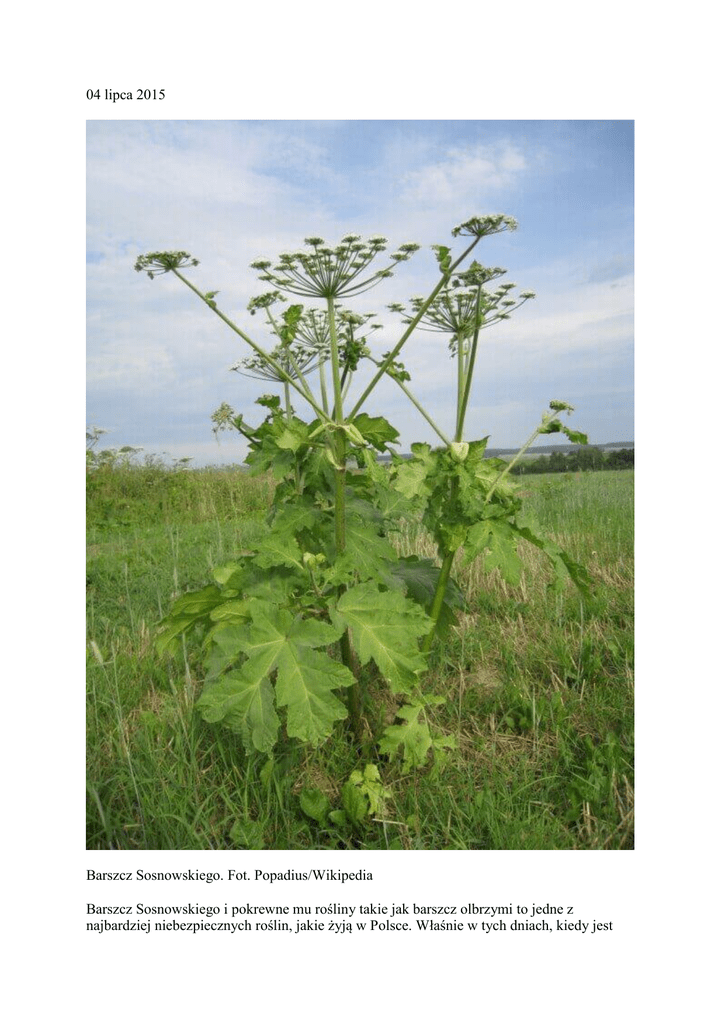 04 lipca 2015 Barszcz Sosnowskiego. Fot. Popadius/Wikipedia Barszcz Sosnowskiego i pokrewne mu rośliny takie jak barszcz olbrzymi to jedne z najbardziej niebezpiecznych roślin, jakie żyją w Polsce. Właśnie w tych dniach, kiedy jest gorąco a czasami też wilgotno, staje się tak niebezpieczny, że nawet przejście koło niego może wywołać poważne rany. W tym tekście skupiamy się na barszczu Sosnowskiego, ale – jak mówi dr hab. Marcin Zych z Ogrodu Botanicznego Uniwersytetu Warszawskiego – w Polsce występuje co najmniej kilka spokrewnionych gatunków mających podobne właściwości. Co więcej podejrzewa się, że krzyżują się one ze sobą, więc hasło „barszcz Sosnowskiego” należy traktować nieco umownie. Jak działa barszcz Sosnowskiego? To jedna z najsilniej toksycznych roślin w Polsce. W jego soku występuje szereg związków, jednak tymi, które stwarzają poważne zagrożenie dla człowieka są furanokumaryny. Ich szczególną właściwością jest duża łatwość łączenia się z DNA. W kontakcie ze skórą łączą się z DNA komórek i powodują ich obumieranie. Ten proces zachodzi szczególnie szybko gdy na skórę działają promienie ultrafioletowe – takie, jak te pochodzące ze światła słonecznego. Pierwszym objawem, łatwym do zlekceważenia, jest zaczerwienienie i szczypanie. Potem pojawiają się na skórze bąble naciekające płynem surowiczym, a w ciężkich przypadkach mogą pojawić się głębokie i trudnogojące się rany. Furanokumaryny działają nawet po zagojeniu się oparzeń. Zmieniają działanie komórek skóry tak, że produkują one więcej melaniny. Powoduje to powstawanie na skórze ciemnych plam, które utrzymywać się mogą nawet przez kilka lat. Poparzenia wywołane kontaktem z barszczem Sosnowskiego. Fot. Ivo Kruusamägi Wiązanie się furanokumaryn z DNA może powodować działanie rakotwórcze i uszkadzające płód. Furanokumaryny działają nie tylko w bezpośrednim kontakcie ze skórą, ale – szczególnie w upalne i wilgotne dni – unoszą się w powietrzu i osadzają na wilgotnym podłożu takim jak ludzka skóra. Dlatego wystarczy przechodzić koło stanowiska barszczu Sosnowskiego by doznać oparzeń. Furanokumaryny mogą wywoływać również uszkodzenia dróg oddechowych i oczu oraz powodować ból i zawroty głowy. Jak rozpoznać barszcz Sosnowskiego? Przede wszystkim jest ogromny – dorasta do 4-5 metrów, u nasady jego łodyga może mieć średnicę 10-12 cm. Do takich rozmiarów barszcz Sosnowskiego dorasta w czasie jednego sezonu. Barszcz Sosnowskiego należy do rodziny baldaszkowatych albo inaczej selerowatych. To ta sama rodzina, w której jest m.in. marchew, pietruszka czy koper. I właśnie koper może nam ułatwić rozpoznanie barszczu Sosnowskiego. Wygląda on bowiem jak gigantyczny koper z charakterystycznymi kwiatami zebranymi w potężny baldach. Kwiaty barszczu Sosnowskiego. Fot. Hugo.arg Liście podzielone są pierzasto, co wyraźnie odróżnia barszcz Sosnowskiego od innych dużych roślin takich jak na przykład łopian. Mogą mieć średnicę 1,5 metra. Łodyga jest w środku pusta. Zdarzało się, że dzieci bawiły się używając jej jako lunety – to bardzo zły pomysł kończący się poważnymi oparzeniami rąk i twarzy. Liście barszczu Sosnowskiego. Fot. Krzysztof Ziarnek, Kenraiz Obecnie barszcz Sosnowskiego rośnie na wielu stanowiskach w całej Polsce. Szczególnie upodobał sobie południe, ale pojawia się praktycznie wszędzie, również w lasach. Co zrobić w razie poparzenia barszczem Sosnowskiego? Przede wszystkim, nawet w razie podejrzenia kontaktu z barszczem Sosnowskiego, trzeba zmyć skórę bardzo dużą ilością letniej wody z mydłem. Koniecznie unikać słońca przez nie mniej niż 48 godzin. To bardzo ważne, bo promieniowanie słoneczne przyspiesza i intensyfikuje proces łączenia się furanokumaryn z ludzkim DNA. Jeśli pojawią się objawy oparzeń trzeba niezwłocznie iść do lekarza. Dotyczy to wszystkich, bo rany mogą być głębokie i źle się goić. Co więcej szczególnie zagrożone są dzieci i osoby cierpiące na przewlekłe choroby. U nich oparzenia barszczem Sosnowskiego mogą stać się nawet przyczyną śmierci – tak stało się niedawno w przypadku 67-letniej kobiety. Skąd wziął się w Polsce barszcz Sosnowskiego? Barszcz Sosnowskiego został sprowadzony ze Związku Radzieckiego na początku lat 50. Jego bardzo szybki wzrost i wysoka zawartość substancji odżywczych sprawiły, że radzieccy uczeni uznali go za doskonałą roślinę uprawną nadającą się na paszę i kiszonki dla bydła. Trudno dziś dojść do tego, dlaczego udało im się pominąć tak „drobny szczegół” jak fakt, że barszcz Sosnowskiego jest niezwykle niebezpieczny dla człowieka. Jedna z teorii głosi, że na swoich pierwotnych stanowiskach czyli nad strumieniami na Kaukazie barszcz Sosnowskiego nie miał aż tak niebezpiecznych właściwości. Tu przeczytasz o innym wyczynie radzieckich naukowców. Roślina doskonale nadaje się też dla pszczół, była więc sprowadzana do PGR-ów i rozsiewana na własną rękę. Niestety poza tym, że jest niebezpieczna ma również wszystkie cechy gatunku bardzo silnie inwazyjnego. Wypiera rodzime gatunki, błyskawiczni się rozsiewa, jest bardzo trudna do wyplenienia, tworzy trwałe banki nasion w glebie.