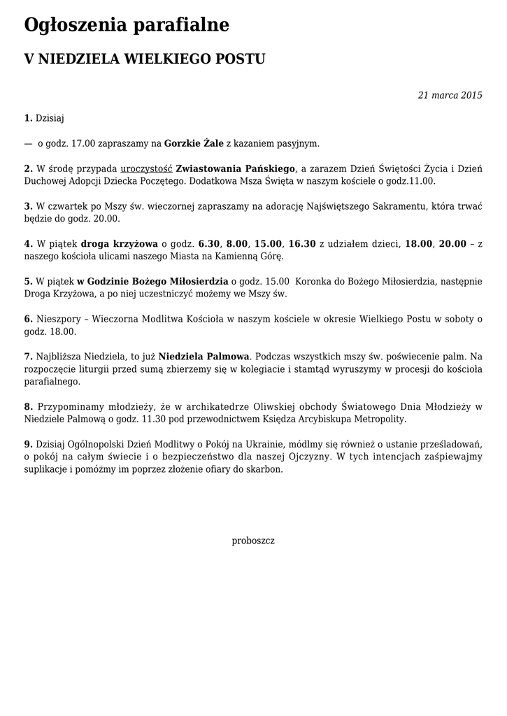 Ogłoszenia parafialne V NIEDZIELA WIELKIEGO POSTU 21 marca 2015 1. Dzisiaj — o godz. 17.00 zapraszamy na Gorzkie Żale z kazaniem pasyjnym. 2. W środę przypada uroczystość Zwiastowania Pańskiego, a zarazem Dzień Świętości Życia i Dzień Duchowej Adopcji Dziecka Poczętego. Dodatkowa Msza Święta w naszym kościele o godz.11.00. 3. W czwartek po Mszy św. wieczornej zapraszamy na adorację Najświętszego Sakramentu, która trwać będzie do godz. 20.00. 4. W piątek droga krzyżowa o godz. 6.30, 8.00, 15.00, 16.30 z udziałem dzieci, 18.00, 20.00 – z naszego kościoła ulicami naszego Miasta na Kamienną Górę. 5. W piątek w Godzinie Bożego Miłosierdzia o godz. 15.00 Koronka do Bożego Miłosierdzia, następnie Droga Krzyżowa, a po niej uczestniczyć możemy we Mszy św. 6. Nieszpory – Wieczorna Modlitwa Kościoła w naszym kościele w okresie Wielkiego Postu w soboty o godz. 18.00. 7. Najbliższa Niedziela, to już Niedziela Palmowa. Podczas wszystkich mszy św. poświecenie palm. Na rozpoczęcie liturgii przed sumą zbierzemy się w kolegiacie i stamtąd wyruszymy w procesji do kościoła parafialnego. 8. Przypominamy młodzieży, że w archikatedrze Oliwskiej obchody Światowego Dnia Młodzieży w Niedziele Palmową o godz. 11.30 pod przewodnictwem Księdza Arcybiskupa Metropolity. 9. Dzisiaj Ogólnopolski Dzień Modlitwy o Pokój na Ukrainie, módlmy się również o ustanie prześladowań, o pokój na całym świecie i o bezpieczeństwo dla naszej Ojczyzny. W tych intencjach zaśpiewajmy suplikacje i pomóżmy im poprzez złożenie ofiary do skarbon. proboszcz