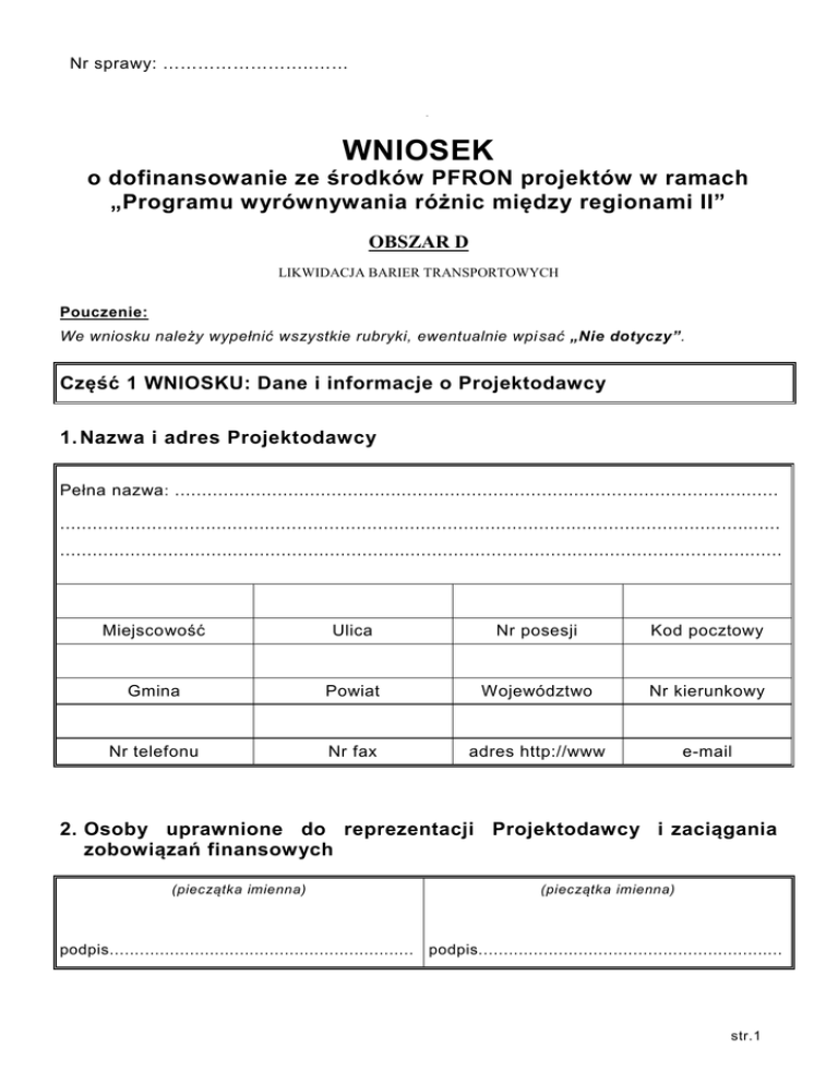 Nr sprawy: ……………………..…… WNIOSEK o dofinansowanie ze środków PFRON projektów w ramach „Programu wyrównywania różnic między regionami II” OBSZAR D LIKWIDACJA BARIER TRANSPORTOWYCH Pouczenie: We wniosku należy wypełnić wszystkie rubryki, ewentualnie wpi sać „Nie dotyczy”. Część 1 WNIOSKU: Dane i informacje o Projektodawcy 1. Nazwa i adres Projektodawcy Pełna nazwa : ................................................................................................................ ...................................................................................................................................... ...................................................................................................................................... Miejscowość Ulica Nr posesji Kod pocztowy Gmina Powiat Województwo Nr kierunkowy Nr telefonu Nr fax adres http://www e-mail 2. Osoby uprawnione do reprezentacji Projektodawcy i zaciągania zobowiązań finansowych (pieczątka imienna) (pieczątka imienna) podpis............................................................. podpis............................................................. str.1 3. Informacje o realizacji obowiązku wpłat na rzecz PFRON Czy Projektodawca jest zobowiązany do wpłat na rzec z PFRON tak: nie: tak: nie: Podstawa zwolnienia z wpłat na rzecz PFRON Czy Projektodawca zalega z wpłatami na rzecz PFRON Numer identyfikacyjny PFRON Kwota zaległości z tytułu wpłat, których termin płatności upłynął w miesiącu poprzedzającym miesiąc złożenia wniosku .................................zł 4. Informacje o Projektodawcy REGON Nr identyfikacyjny NIP Nazwa banku Nr rachunku bankowego Czy Projektodawca jest podatnikiem VAT: tak: nie: podstawa prawna zwolnienia z podatku VAT ................................................................... Wnioskodawca jest podatnikiem VAT, lecz w ramach wnioskowanych do dofinansowania kosztów nie może obniżyć kwoty podatku należnego o podatek naliczony tak: nie: podstawa prawna:..................................................................................................... 5. Informacja o korzystaniu ze środków PFRON (za okres ostatnich 3 lat) Czy Projektodawca korzystał ze środków PFRON Cel (nazwa zadania ustawowego oraz /lub nazwa programu, w ramach którego przyznana została pomoc) Nr i data zawarcia umowy Razem kwota przyznana: Kwota przyznana tak Termin rozliczenia nie Kwota rozliczona Razem kwota rozliczona: str.2 6. Informacje dotyczące pomocy publicznej Projektodawca podlega przepisom ustawy z dnia 30 kwietnia 2004 r. o postępowaniu w sprawach dotyczących pomocy publicznej (j.t. Dz. U. z 2007 r. Nr 59 poz. 404 z późn. zm.) tak nie Projektodawca prowadzi działalność gospodarczą tak nie ; Wsparcie ze środków PFRON zostanie przeznaczone na finansowanie prowadzonej działalności gospodarczej tak nie ; Wsparcie projektodawcy ze środków PFRON grozi zakłóceniem lub z akłóca konkurencję oraz wpływa na wymianę handlową między krajami członkowskimi UE Planowana pomoc jest pomocą de minimis tak nie ; tak ; nie Część 2 WNIOSKU: Informacje o projekcie 1. Opis projektu Nazwa projektu : …………………………………………………………………………………………………………………….. ....................................................................................................................................... Cel projektu: (w przypadku obszernego opisu – w załączeniu) ....................................................................................................................................... ....................................................................................................................................... ....................................................................................................................................... ....................................................................................................................................... ....................................................................................................................................... ....................................................................................................................................... ....................................................................................................................................... ....................................................................................................................................... ....................................................................................................................................... ....................................................................................................................................... Projekt dotyczy terenu: miejskiego ; wiejskiego ; miejsko-wiejskiego ; str.3 Nazwa obiektu, w którym projektowana jest likwidacja barier oraz nazwa i adres jednostki organizacyjnej projektodawcy prowadzącej obiekt ..................................... ....................................................................................................................................... ....................................................................................................................................... Dokładna lokalizacja obiektu (miejscowość, ulica, nr posesji, kod pocztowy, gmina, powiat, województwo): ................................................................................................................... ....................................................................................................................................... NIP.....................; REGON ......................; Nr identyfikacyjny PFRO N * ....................; * należy wypełnić jeżeli posiada 2. Uzasadnienie potrzeby zakupu pojazdu (pojazdów)