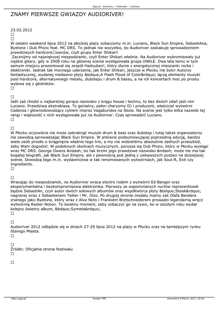 Gigs.pl - Koncerty :: Festiwale :: Imprezy ZNAMY PIERWSZE GWIAZDY AUDIORIVER! 23.02.2012 W ostatni weekend lipca 2012 na płockiej plaży zobaczymy m.in. Luciano, Black Sun Empire, SebastiAna, Byetone i Dub Phizix feat. MC DRS. To jednak nie wszystko, bo Audioriver zaskakuje sprowadzeniem prawdziwych hardcoreowców, czyli grupy Enter Shikari! Zacznijmy od największej niespodzianki, czyli Enter Shikari właśnie. Na Audioriver wybrzmiewały już ciężkie gitary, gdy w 2008 roku na głównej scenie występowała grupa UNKLE. Dwa lata temu w tym samym miejscu prezentował się zespół Hadouken!, który słynie z energetycznej mieszanki rocka i elektroniki. Jednak tak mocnego uderzenia, jak Enter Shikari, jeszcze w Płocku nie było! Autorzy fantastycznej, wydanej niedawno płyty „A Flash Flood of Color” łączą elementy muzyki post-hardcore, alternatywnego metalu, dubstepu i drum & bassu, a na ich koncertach moc po prostu wylewa się z głośników. Jeśli zaś chodzi o najbardziej gorące nazwisko z kręgu house i techno, to bez dwóch zdań jest nim Luciano. Prawdziwa ekstraklasa. To genialny, pełen charyzmy DJ i producent, właściciel wytwórni Cadenza i głównodowodzący cyklem imprez Vagabundos na Ibizie. Na scenie jest tylko kilka nazwisk tej rangi i większość z nich występowała już na Audioriver. Czas sprowadzić Luciano. W Płocku oczywiście nie może zabraknąć muzyki drum & bass oraz dubstep i tutaj także organizatorzy nie zawodzą sprowadzając Black Sun Empire. W ankiecie podsumowującej poprzednią edycję, bardzo wiele osób prosiło o ściągnięcie właśnie tego trio, a my nie widzieliśmy absolutnie żadnych przeszkód, żeby Wam dogodzić. W podobnych okolicach muzycznych, porusza się Dub Phizix, który w Płocku wystąpi wraz MC DRS. George Owens – bo tak brzmi jego prawdziwe nazwisko – może nie ma tak bogatej biografii, jak Black Sun Empire, ale z pewnością jest jedną z ciekawszych postaci na dzisiejszej scenie. Dowodzą tego m.in. wydawnictwa w tak renomowanych wytwórniach, jak Soul:R, Exit czy Ingredients. Wracając do niespodzianek, na Audioriver wraca electro rodem z wytwórni Ed Banger oraz eksperymentalna i bezkompromisowa elektronika. Pierwszy ze wspomnianych nurtów reprezentował będzie SebastiAn, czyli autor dwóch solowych albumów oraz współtwórca płyty „Steak” nagranej wraz z Sebastienem Tellier i Mr. Oizo. Po drugiej stronie medalu mamy zaś Olafa Bendera znanego jako Byetone, który wraz z Alva Noto i Frankiem Bretschneiderem prowadzi legendarną wręcz wytwórnię Raster-Noton. To świetny moment, żeby zobaczyć go na żywo, bo w zeszłym roku wydał kolejny świetny album, „Symeta”. Audioriver 2012 odbędzie się w dniach 27-29 lipca 2012 na plaży w Płocku oraz na tamtejszym rynku Starego Miasta. Źródło: Oficjalna strona festiwalu http://gigs.pl Kreator PDF Utworzono 8 March, 2017, 22:00