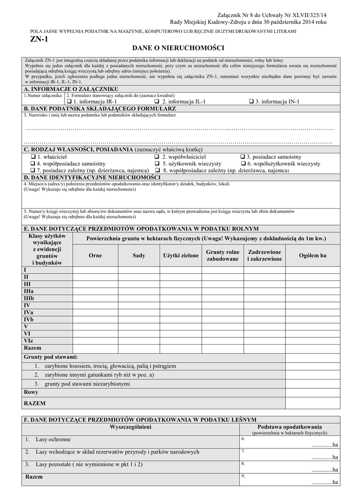 Załącznik Nr 8 do Uchwały Nr XLVII/325/14 Rady Miejskiej Kudowy-Zdroju z dnia 30 października 2014 roku POLA JASNE WYPEŁNIA PODATNIK NA MASZYNIE, KOMPUTEROWO LUB RĘCZNIE DUZYMI DRUKOWANYMI LITERAMI ZN-1 DANE O NIERUCHOMOŚCI Załącznik ZN-1 jest integralną częścią składanej przez podatnika informacji lub deklaracji na podatek od nieruchomości, rolny lub leśny. Wypełnia się jeden załącznik dla każdej z posiadanych nieruchomość, przy czym za nieruchomość dla celów niniejszego formularza uważa się nieruchomość posiadającą odrębną księgę wieczystą lub odrębny adres (miejsce położenia). W przypadku, jeżeli zgłoszeniu podlega jedna nieruchomość, nie wypełnia się załącznika ZN-1, natomiast wszystkie niezbędne dane powinny być zawarte w informacji IR-1, IL-1, IN-1. A. INFORMACJE O ZAŁĄCZNIKU 1.Numer załącznika 2. Formularz stanowiący załącznik do (zaznacz kwadrat): 1. informacja IR-1 2. informacja IL-1 B. DANE PODATNIKA SKŁADAJĄCEGO FORMULARZ 3. informacja IN-1 3. Nazwisko i imię lub nazwa podatnika lub podatników składających formularz ………………………………………………………………………………………….……………………………………………… …………………………………………………………………………………………………………………………………………. C. RODZAJ WŁASNOŚCI, POSIADANIA (zaznaczyć właściwą kratkę) 1. właściciel 2. współwłaściciel 3. posiadacz samoistny 4. współposiadacz samoistny 5. użytkownik wieczysty 6. współużytkownik wieczysty 7. posiadacz zależny (np. dzierżawca, najemca) 8. współposiadacz zależny (np. dzierżawca, najemca) D. DANE IDENTYFIKACYJNE NIERUCHOMOŚCI 4. Miejsce/a (adres/y) położenia przedmiotów opodatkowania oraz identyfikator/y działek, budynków, lokali (Uwaga! Wykazuje się odrębnie dla każdej nieruchomości) 5. Numer/y księgi wieczystej lub zbioru/ów dokumentów oraz nazwa sądu, w którym prowadzona jest księga wieczysta lub zbiór dokumentów (Uwaga! Wykazuje się odrębnie dla każdej nieruchomości) E. DANE DOTYCZĄCE PRZEDMIOTÓW OPODATKOWANIA W PODATKU ROLNYM Klasy użytków Powierzchnia gruntu w hektarach fizycznych (Uwaga! Wykazujemy z dokładnością do 1m kw.) wynikające z ewidencji Grunty rolne Zadrzewione Orne Sady Użytki zielone Ogółem ha gruntów zabudowane i zakrzewione i budynków I II III IIIa IIIb IV IVa IVb V VI VIz Razem Grunty pod stawami: 1. zarybione łososiem, trocią, głowacicą, palią i pstrągiem 2. zarybione innymi gatunkami ryb niż w poz. a) 3. grunty pod stawami niezarybionymi Rowy RAZEM F. DANE DOTYCZĄCE PRZEDMIOTÓW OPODATKOWANIA W PODATKU LEŚNYM Wyszczególnieni Podstawa opodatkowania (powierzchnia w hektarach fizycznych) 1. Lasy ochronne 6. 2. Lasy wchodzące w skład rezerwatów przyrody i parków narodowych 7. 3. Lasy pozostałe ( nie wymienione w pkt 1 i 2) 8. ..............ha ..............ha ..............ha Razem 9. ..............ha G. DANE DOTYCZĄCE PRZEDMIOTÓW OPODATKOWANIA W PODATKU OD NIERUCHOMOŚCI G.1 GRUNT 9. 1. związanych z prowadzeniem działalności gospodarczej, bez względu na sposób zakwalifikowania w ewidencji gruntów ............................................................. m2 i budynków 2. pod jeziorami, zajętych na zbiorniki wodne retencyjne lub elektrownie wodne 10. 3. pozostałych, w tym zajętych na prowadzenie odpłatnej statutowej działalności pożytku publicznego przez organizacje pożytku publicznego dzierżawionych na ogródki przydomowe 11. 4. ............................................................. ha ............................................................. m2 12. ............................................................. m2 G.2 BUDYNI LUB ICH CZĘŚCI (*) * Do powierzchni użytkowej budynku lub jego części należy zaliczyć powierzchnię mierzoną, po wewnętrznej długości ścian na wszystkich kondygnacjach, z wyjątkiem powierzchni klatek schodowych oraz szybów dźwigowych. Za kondygnację uważa się również garaże podziemne, piwnice, sutereny i poddasza użytkowe. Powierzchnię pomieszczeń lub ich części oraz część kondygnacji o wysokości w świetle od 1,40 m do 2,20 m zalicza się do powierzchni użytkowej budynku w 50%, a jeżeli wysokość jest mniejsza niż 1,40m powierzchnię tę pomija się. 13. 1. mieszkalnych ..............................................................m2 związanych z prowadzeniem działalności gospodarczej oraz od budynków mieszkalnych lub ich części zajętych na prowadzenie działalności gospodarczej zajętych na prowadzenie działalności gospodarczej w zakresie udzielania usług weterynaryjnych 14. zajętych na prowadzenie działalności gospodarczej w zakresie obrotu kwalifikowanym materiałem siewnym 16. związanych z udzielaniem świadczeń zdrowotnych w rozumieniu przepisów o działalności leczniczej, zajętych przez podmioty udzielające tych świadczeń 6. pozostałych w tym zajętych na prowadzenie odpłatnej statutowej działalności pożytku publicznego przez organizacje pożytku publicznego G.3 BUDOWLE 1. budowle (wartość, o której mowa w przepisach o podatkach dochodowych - 17. 2. 3. 4. 5. w zaokrągleniu do pełnych złotych) .............................................................m2 15. .............................................................m2 .............................................................m2 ............................................................m2 18. ........................................................... m2 19. ........................................................................zł* H. INFORMACJA O PRZEDMIOTACH ZWOLNIONYCH (podać powierzchnię, bądź wartość budowli przedmiotów zwolnionych oraz przepis prawa – z jakiego tytułu występuje zwolnienie)