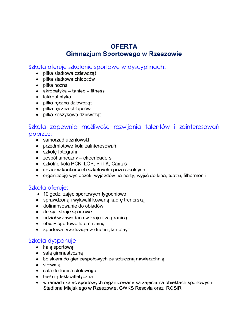 OFERTA Gimnazjum Sportowego w Rzeszowie Szkoła oferuje szkolenie sportowe w dyscyplinach: piłka siatkowa dziewcząt piłka siatkowa chłopców piłka nożna akrobatyka – taniec – fitness lekkoatletyka piłka ręczna dziewcząt piłka ręczna chłopców piłka koszykowa dziewcząt Szkoła zapewnia możliwość rozwijania talentów i zainteresowań poprzez: samorząd uczniowski przedmiotowe koła zainteresowań szkołę fotografii zespół taneczny – cheerleaders szkolne koła PCK, LOP, PTTK, Caritas udział w konkursach szkolnych i pozaszkolnych organizację wycieczek, wyjazdów na narty, wyjść do kina, teatru, filharmonii Szkoła oferuje: 10 godz. zajęć sportowych tygodniowo sprawdzoną i wykwalifikowaną kadrę trenerską dofinansowanie do obiadów dresy i stroje sportowe udział w zawodach w kraju i za granicą obozy sportowe latem i zimą sportową rywalizację w duchu „fair play” Szkoła dysponuje: halą sportową salą gimnastyczną boiskiem do gier zespołowych ze sztuczną nawierzchnią siłownią salą do tenisa stołowego bieżnią lekkoatletyczną w ramach zajęć sportowych organizowane są zajęcia na obiektach sportowych Stadionu Miejskiego w Rzeszowie, CWKS Resovia oraz ROSiR Sport to nie wszystko. Szkoła zapewnia: zajęcia lekcyjne w 20-25 osobowych klasach obowiązkowy język angielski – kontynuacja ze szkoły podstawowej język niemiecki lub język francuski jako drugi język obcy nauczany od podstaw wysoki poziom nauczania ze wszystkich przedmiotów nowocześnie wyposażone pracownie przedmiotowe świetnie wyposażoną bibliotekę, czytelnię i centrum multimedialne Szkoła wolna od patologii, bezpieczna i przyjazna uczniowi dzięki: życzliwej atmosferze pomocy w rozwiązywaniu problemów partnerskiej współpracy z rodzicami stałemu 24-godzinnemu monitoringowi stałej współpracy z poradnią psychologiczno-pedagogiczną, psychologiem i pedagogiem szkolnym Do dyspozycji uczniów: gabinet lekarski – codzienny dyżur higienistki stołówka szkolna oferująca smaczne obiady sklepik szkolny indywidualna szafka w szatni dla każdego ucznia bezprzewodowa sieć wi-fi dla wszystkich uczniów Internat: uczniowie zamieszkali poza Rzeszowem mogą ubiegać się o miejsce w internatach na terenie Rzeszowa, podanie o przyjęcie do internatu należy złożyć w sekretariacie szkoły w czerwcu 2016 r. Po ukończeniu Gimnazjum Sportowego w Rzeszowie: absolwenci będą mogli kontynuować naukę w V Liceum Ogólnokształcącym im. K.K. Baczyńskiego Szkole Mistrzostwa Sportowego w klasach sportowych również z 10 lub 16 godzinami wychowania fizycznego