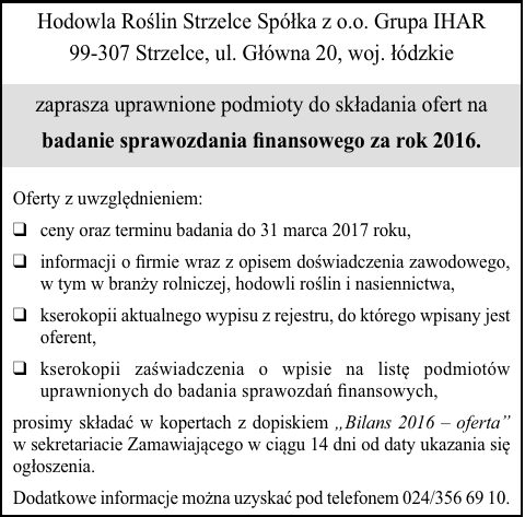 Hodowla Roślin Strzelce Spółka z o.o. Grupa IHAR 99-307 Strzelce, ul. Główna 20, woj. łódzkie zaprasza uprawnione podmioty do składania ofert na badanie sprawozdania finansowego za rok 2016. Oferty z uwzględnieniem: ❑ ceny oraz terminu badania do 31 marca 2017 roku, ❑ informacji o firmie wraz z opisem doświadczenia zawodowego, w tym w branży rolniczej, hodowli roślin i nasiennictwa, ❑ kserokopii aktualnego wypisu z rejestru, do którego wpisany jest oferent, ❑ kserokopii zaświadczenia o wpisie na listę podmiotów uprawnionych do badania sprawozdań finansowych, prosimy składać w kopertach z dopiskiem „Bilans 2016 – oferta” w sekretariacie Zamawiającego w ciągu 14 dni od daty ukazania się ogłoszenia. Dodatkowe informacje można uzyskać pod telefonem 024/356 69 10.