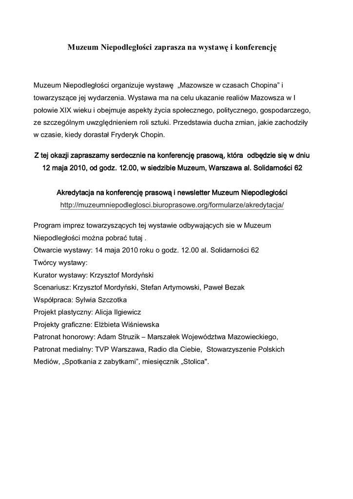 Muzeum Niepodległości zaprasza na wystawę i konferencję Muzeum Niepodległości organizuje wystawę „Mazowsze w czasach Chopina” i towarzyszące jej wydarzenia. Wystawa ma na celu ukazanie realiów Mazowsza w I połowie XIX wieku i obejmuje aspekty życia społecznego, politycznego, gospodarczego, ze szczególnym uwzględnieniem roli sztuki. Przedstawia ducha zmian, jakie zachodziły w czasie, kiedy dorastał Fryderyk Chopin. Z tej okazji zapraszamy serdecznie na konferencję prasową, która odbędzie się w dniu 12 maja 2010, od godz. 12.00, w siedzibie Muzeum, Warszawa al. Solidarności 62 Akredytacja na konferencję prasową i newsletter Muzeum Niepodległości http://muzeumniepodleglosci.biuroprasowe.org/formularze/akredytacja/ Program imprez towarzyszących tej wystawie odbywających sie w Muzeum Niepodległości można pobrać tutaj . Otwarcie wystawy: 14 maja 2010 roku o godz. 12.00 al. Solidarności 62 Twórcy wystawy: Kurator wystawy: Krzysztof Mordyński Scenariusz: Krzysztof Mordyński, Stefan Artymowski, Paweł Bezak Współpraca: Sylwia Szczotka Projekt plastyczny: Alicja Ilgiewicz Projekty graficzne: Elżbieta Wiśniewska Patronat honorowy: Adam Struzik – Marszałek Województwa Mazowieckiego, Patronat medialny: TVP Warszawa, Radio dla Ciebie, Stowarzyszenie Polskich Mediów, „Spotkania z zabytkami”, miesięcznik „Stolica".