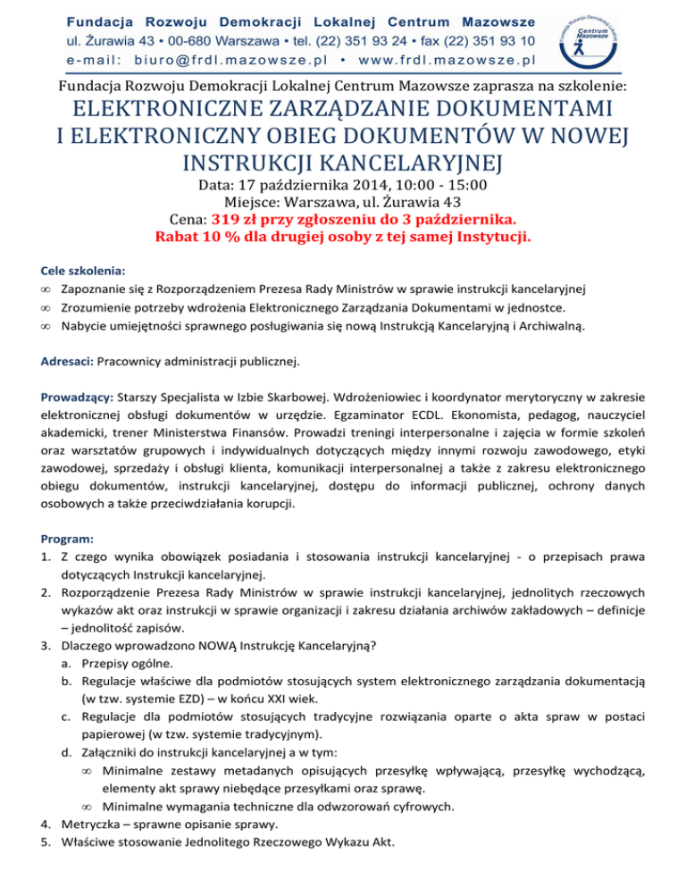 Fundacja Rozwoju Demokracji Lokalnej Centrum Mazowsze zaprasza na szkolenie: ELEKTRONICZNE ZARZĄDZANIE DOKUMENTAMI I ELEKTRONICZNY OBIEG DOKUMENTÓW W NOWEJ INSTRUKCJI KANCELARYJNEJ Data: 17 października 2014, 10:00 - 15:00 Miejsce: Warszawa, ul. Żurawia 43 Cena: 319 zł przy zgłoszeniu do 3 października. Rabat 10 % dla drugiej osoby z tej samej Instytucji. Cele szkolenia: • Zapoznanie się z Rozporządzeniem Prezesa Rady Ministrów w sprawie instrukcji kancelaryjnej • Zrozumienie potrzeby wdrożenia Elektronicznego Zarządzania Dokumentami w jednostce. • Nabycie umiejętności sprawnego posługiwania się nową Instrukcją Kancelaryjną i Archiwalną. Adresaci: Pracownicy administracji publicznej. Prowadzący: Starszy Specjalista w Izbie Skarbowej. Wdrożeniowiec i koordynator merytoryczny w zakresie elektronicznej obsługi dokumentów w urzędzie. Egzaminator ECDL. Ekonomista, pedagog, nauczyciel akademicki, trener Ministerstwa Finansów. Prowadzi treningi interpersonalne i zajęcia w formie szkoleń oraz warsztatów grupowych i indywidualnych dotyczących między innymi rozwoju zawodowego, etyki zawodowej, sprzedaży i obsługi klienta, komunikacji interpersonalnej a także z zakresu elektronicznego obiegu dokumentów, instrukcji kancelaryjnej, dostępu do informacji publicznej, ochrony danych osobowych a także przeciwdziałania korupcji. Program: 1. Z czego wynika obowiązek posiadania i stosowania instrukcji kancelaryjnej - o przepisach prawa dotyczących Instrukcji kancelaryjnej. 2. Rozporządzenie Prezesa Rady Ministrów w sprawie instrukcji kancelaryjnej, jednolitych rzeczowych wykazów akt oraz instrukcji w sprawie organizacji i zakresu działania archiwów zakładowych – definicje – jednolitość zapisów. 3. Dlaczego wprowadzono NOWĄ Instrukcję Kancelaryjną? a. Przepisy ogólne. b. Regulacje właściwe dla podmiotów stosujących system elektronicznego zarządzania dokumentacją (w tzw. systemie EZD) – w końcu XXI wiek. c. Regulacje dla podmiotów stosujących tradycyjne rozwiązania oparte o akta spraw w postaci papierowej (w tzw. systemie tradycyjnym). d. Załączniki do instrukcji kancelaryjnej a w tym: • Minimalne zestawy metadanych opisujących przesyłkę wpływającą, przesyłkę wychodzącą, elementy akt sprawy niebędące przesyłkami oraz sprawę. • Minimalne wymagania techniczne dla odwzorowań cyfrowych. 4. Metryczka – sprawne opisanie sprawy. 5. Właściwe stosowanie Jednolitego Rzeczowego Wykazu Akt. a. Klasyfikacja dokumentów w organizacji. b. Budowanie, stosowanie, rozszerzanie klasyfikacja archiwalna. 6. Zasady odpowiedzialności pracodawcy za całość wytwarzanej dokumentacji (w wersjach pisemnych i elektronicznych). Odpowiedzialność pracowników za wytwarzaną dokumentację a odpowiedzialność pracodawcy na podstawie: a. Ustawy o narodowym zasobie archiwalnym, w tym: na podstawie kodeksu karnego. b. Ochrony danych osobowych, (jako administratora danych osobowych). c. Kodeksu postępowania administracyjnego (m.in. za wydanie nieważnych decyzji administracyjnych). 7. Archiwizacja – czy to jest trudne? ZGŁOSZENIE ELEKTRONICZNE ZARZĄDZANIE DOKUMENTAMI I ELEKTRONICZNY OBIEG DOKUMENTÓW W NOWEJ INSTRUKCJI KANCELARYJNEJ Data: 17 października 2014, 10:00 - 15:00 Miejsce: Warszawa, ul. Żurawia 43 Cena: 319 zł przy zgłoszeniu do 3 października. Rabat 10 % dla drugiej osoby z tej samej Instytucji. Instytucja: ................................................................................................................................ Adres:....................................................................................................................................... NIP: .......................................................................................................................................... L.p. Imię i nazwisko Wydział e-mail tel. 1............................................................................................................................................... 2............................................................................................................................................... 3............................................................................................................................................... ........................................................... podpis i pieczątka osoby delegującej Zgłoszenie na szkolenie Zgłoszenia prosimy przesyłać do 10 października 2014 r. fax: (22) 351 93 10, e-mail: [email protected] lub wybrać opcje zapisu przez stronę www.frdl.mazowsze.pl Przy zgłoszeniu w ramach Forów prosimy o wpisanie w uwagach: „Zgłoszenie w ramach Forum (nazwa odpowiedniego Forum)”. Ewentualną rezygnację ze szkolenia można zgłosić najpóźniej na dwa dni robocze przed szkoleniem. W przypadku niewykorzystania zgłoszonego uczestnictwa Urząd będzie zobowiązany do sfinansowania 60% odpłatności za uczestnictwo i materiały. FRDL zastrzega sobie prawo odwołania szkolenia. Miejsce szkolenia: Warszawa, ul. Żurawia 43, Sala Konferencyjna FRDL. Lokalizacja 300 metrów od Metra Centrum. Cena: 319 zł netto przy zgłoszeniu do 3 października. Cena po 3 października to 369 zł. Rabat 10 % dla drugiej osoby z tej samej Instytucji. Zwolnienie z VAT w przypadku finansowania ze środków publicznych. W cenie materiały szkoleniowe, zaświadczenie, lunch oraz przerwy kawowe. Płatność przelewem, na podstawie faktury wystawionej w dniu szkolenia.