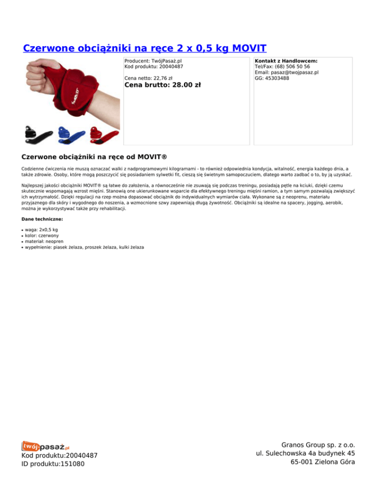 Czerwone obciążniki na ręce 2 x 0,5 kg MOVIT Producent: TwójPasaż.pl Kod produktu: 20040487 Cena netto: 22,76 zł Kontakt z Handlowcem: Tel/Fax: (68) 506 50 56 Email: [email protected] GG: 45303488 Cena brutto: 28.00 zł Czerwone obciążniki na ręce od MOVIT® Codzienne ćwiczenia nie muszą oznaczać walki z nadprogramowymi kilogramami - to również odpowiednia kondycja, witalność, energia każdego dnia, a także zdrowie. Osoby, które mogą poszczycić się posiadaniem sylwetki fit, cieszą się świetnym samopoczuciem, dlatego warto zadbać o to, by ją uzyskać. Najlepszej jakości obciążniki MOVIT® są łatwe do założenia, a równocześnie nie zsuwają się podczas treningu, posiadają pętle na kciuki, dzięki czemu skutecznie wspomagają wzrost mięśni. Stanowią one ukierunkowane wsparcie dla efektywnego treningu mięśni ramion, a tym samym pozwalają zwiększyć ich wytrzymałość. Dzięki regulacji na rzep można dopasować obciążnik do indywidualnych wymiarów ciała. Wykonane są z neoprenu, materiału przyjaznego dla skóry i wygodnego do noszenia, a wzmocnione szwy zapewniają długą żywotność. Obciążniki są idealne na spacery, jogging, aerobik, można je wykorzystywać także przy rehabilitacji. Dane techniczne: ● ● ● ● waga: 2x0,5 kg kolor: czerwony materiał: neopren wypełnienie: piasek żelaza, proszek żelaza, kulki żelaza Kod produktu:20040487 ID produktu:151080 Granos Group sp. z o.o. ul. Sulechowska 4a budynek 45 65-001 Zielona Góra