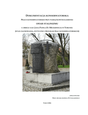 DOKUMENTACJA KONSERWATORSKA PRACE KONSERWATORSKIE PRZY PAMIĄTKOWYM KAMIENIU OFIAR STALINIZMU U ZBIEGU ULIC JANA PAWŁA II I MICKIEWICZA W TORUNIU (STAN ZACHOWANIA, WYTYCZNE I PROGRAM PRAC KONSERWATORSKICH) OPRACOWANIE: PROF. DR HAB. JADWIGA W. ŁUKASZEWICZ TORUŃ 2016 Toruńska Pracownia Badań i Konserwacji Zabytków Kamień pamiątkowy Ofiar Stalinizmu w Toruniu __________________________________________________________________________________ SPIS TREŚCI _______________________________________________________ I. II. INFORMACJE WSTĘPNE WSTĘP III. STAN ZACHOWANIA IV. WYTYCZNE KONSERWATORSKIE V. VI. VII. VIII. PROGRAM PRAC KONSERWATORSKICH LITERATURA OBMIAR KOSZTORYS 2 __________________________________________________________________________________ Praca chroniona prawem autorskim Toruńska Pracownia Badań i Konserwacji Zabytków Kamień pamiątkowy Ofiar Stalinizmu w Toruniu __________________________________________________________________________________ I. INFORMACJE WSTĘPNE _______________________________________________________________________________ 1. RODZAJ OBIEKTU: pomnik Ofiar Stalinizmu, czerwony granitowy głaz z dwoma tablicami wykonanymi z brązu oraz stalowym krzyżem. 2. LOKALIZACJA: 87-100 Toruń, plac Artylerii Polskiej, u zbiegu al. Jana Pawła II i ul. Mickiewicza 3. NUMER REJESTRU ZABYTKÓW: brak, pomnik usytuowany na terenie pasa ochronnego wokół obszaru staromiejskiego wpisanego na listę Światowego Dziedzictwa UNESCO 4. INFORMACJE DOTYCZĄCE OPRACOWANIA: 4.1. ZAMAWIAJĄCY: Gmina Miasta Toruń 4.2. PODSTAWA OPRACOWANIA - umowa nr 1/Pom-dk/2016 z dnia 31.03.2016 r. na opracowanie zaleceń konserwatorskich dla wybranych pomników i obiektów w Toruniu - wizja lokalna w dniu 1.04.2016 – 20.04.2016 r. - dokumentacja fotograficzna 4.3. PRZEDMIOT OPRACOWANIA Przedmiotem opracowania jest pomnik Ofiar Stalinizmu w Toruniu 4.4. ZAKRES OPRACOWANIA Opracowanie dotyczy przeprowadzenia analizy stanu zachowania pomnika, podania przyczyn występujących zniszczeń, z przygotowaniem wytycznych do dalszych prac badawczo-konserwatorskich wraz z ich kosztorysem. 5. AUTOR OPRACOWANIA: Jadwiga W. Łukaszewicz 6. AUTORZY FOTOGRAFII: Jadwiga W. Łukaszewicz 3 __________________________________________________________________________________ Praca chroniona prawem autorskim Toruńska Pracownia Badań i Konserwacji Zabytków Kamień pamiątkowy Ofiar Stalinizmu w Toruniu __________________________________________________________________________________ II. WSTĘP __________________________________________________________________________________________ Pomnik Ofiar Stalinizmu w Toruniu powstał z inicjatywy Związku Więźniów Politycznych Okresu Stalinowskiego i dzięki pomocy społeczeństwa ziemi toruńskiej. Granitowy głaz narzutowy przywieziono spod Rypina, a tablice odlano w Toruńskiej Fabryce Wodomierzy i Zegarów METRON (fot. 1). 1. AUTOR Pomnik wzniesiono według projektu grudziądzkiego rzeźbiarza Ryszarda Kaczora. 2. CZAS POWSTANIA Uroczyście odsłonięto 11 listopada 1991 r. 3. OPIS Pomnik stanowi duży głaz narzutowy ustawiony na pierwotnie betonowym niskim postumencie (wymiary: 161,5 x 165 cm), obecnie pokrytym płytami granitowymi po bokach z granitu płomieniowanego o wymiarach 80 x 40,4 x 3cm,n a na powierzchni z polerowanego o wym. 20 x 39,5 x 2 cm. Na głazie zamontowano dwie brązowe płyty inskrypcyjne oraz stalowy krzyż. Na górnej umieszczono orła ze szponami spętanymi kajdanami oraz inskrypcję, na dolnej tylko inskrypcję. 4. INSKRYPCJE Górna płyta (fot. 2): ODEBRANO WAM ŻYCIE BY NIE ODŻYŁA MYŚL NIEPODLEGŁA. KNEBLOWANO NAM USTA BYŚMY NIE DALI ŚWIADECTWA. CIENIOM WASZYM MELDUJEMY NIE ZGINĘŁA Dolna płyta (fot.3): W HOŁDZIE OFIAROM STALINOWSKIEGO LUDOBÓJSTWA 1939-1956 ZAMĘCZONYCH I POMORDOWANYCH PRZEZ OBCYCH I RODZIMYCH AGENTÓW NKWD I UBP ZWIĄZEK WIĘŹNIÓW POLITYCZNYCH ORAZ 4 __________________________________________________________________________________ Praca chroniona prawem autorskim Toruńska Pracownia Badań i Konserwacji Zabytków Kamień pamiątkowy Ofiar Stalinizmu w Toruniu __________________________________________________________________________________ SPOŁECZEŃSTWO ZIEMI TORUŃSKIEJ 5. MATERIAŁY PIERWOTNE Pomnik zbudowano z następujących materiałów: Jasnoczerwony, granitowy głaz narzutowy, Odlane z brązu płyty inskrypcyjne, prawdopodobnie pierwotnie również krzyż, Stalowy, malowany farbą antykorozyjną oraz czarną farbą nawierzchniową krzyż, montowany stalowe śruby z nakrętkami (fot. 4). Betonowy postument, obłożony płytami granitowymi. III. STAN ZACHOWANIA ___________________________________________________________________________ Pomnik Ofiar Stalinizmu usytuowany na niewielkim skwerze u zbiegu ulic Mickiewicza i Al. Jana Pawła II, w sąsiedztwie bardzo ruchliwej arterii komunikacyjnej, narażony jest na działanie typowych warunków zewnętrznych, ale również na ciągły kontakt ze spalinami samochodowymi oraz poddawany jest silnym drganiom wywołanym ruchem kołowym. 1. POSTUMENT Postument wykonany z polerowanych (na powierzchni) i płomieniowanych (w pionie) płyt granitowych w kolorze szarym (fot. 1). Płyty granitowe spoinowano zaprawą cementową, która w wielu miejscach się wykruszyła. Okładzina postumentu dobrze się zachowała, nie stwierdzono ubytków, wykruszeń ani utraty poleru. Występują tylko miejscowe zabrudzenia (fot. 1). 2. POMNIK Pomnik a właściwie kamień pamiątkowy to duży głaz narzutowy, o barwie jasno 5 __________________________________________________________________________________ Praca chroniona prawem autorskim Toruńska Pracownia Badań i Konserwacji Zabytków Kamień pamiątkowy Ofiar Stalinizmu w Toruniu __________________________________________________________________________________ czerwonej. Stan zachowania kamienia nie jest zadowalający. W kamieniu stwierdzono występowanie licznych włosowatych spękań (fot. 5), jedno z nich przech