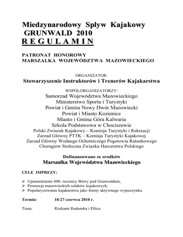 Miedzynarodowy Splyw Kajakowy GRUNWALD 2010 REGULAMIN PATRONAT HONOROWY MARSZALKA WOJEWÓDZTWA MAZOWIECKIEGO ORGANIZATOR: Stowarzyszenie Instruktorów i Trenerów Kajakarstwa WSPÓLORGANIZATORZY: Samorzad Województwa Mazowieckiego Ministerstwo Sportu i Turystyki Powiat i Gmina Nowy Dwór Mazowiecki Powiat i Miasto Kozienice Miasto i Gmina Góra Kalwaria Szkola Podstawowa w Chociszewie Polski Zwiazek Kajakowy – Komisja Turystyki i Rekreacji Zarzad Glówny PTTK – Komisja Turystyki Kajakowej Zarzad Glówny Wodnego Ochotniczego Pogotowia Ratunkowego Choragiew Stoleczna Zwiazku Harcerstwa Polskiego Dofinansowano ze srodków Marszalka Województwa Mazowieckiego CELE IMPREZY: Ø Upamietnienie 600. rocznicy Bitwy pod Grunwaldem, Ø Promocja mazowieckich szlaków kajakowych, Ø Popularyzowanie kajakarstwa jako formy aktywnego wypoczynku. Termin: 18-27 czerwca 2010 r. Trasa: Rzekami Radomka i Pilica PROGRAM: 12.00 – 22.00 15.00 – 18.00 18.00 – 18.30 18.30 – 19.30 21.00 7.00 – 09.30 9.30 9.45 10.00 – 14.00 14.00 – 16.00 16.00 – 21.30 Piatek 18.06.2010 r. weryfikacja uczestników w Biurze Splywu na campingu Kozienickiego Centrum Kultury Rekreacji i Sportu (ul. Bohaterów Studzianek 30), treningi i eliminacje do zawodów smoczych lodzi oraz zawodów kajakowych. pokazy freestyle’u, finaly zawodów smoczych lodzi oraz zawodów kajakowych, ognisko. Sobota 19.06.2010 r. weryfikacja uczestników – c.d., odprawa z kierownikami druzyn, uroczyste otwarcie splywu (camping), zawody rekreacyjno-sportowe, posilek (camping), uroczystosci i imprezy rekreacyjno-sportowe oraz kulturalne zwiazane z obchodami 600-lecia Bitwy pod Grunwaldem. 9.00 10.00 – 10.30 14.00 – 15.30 15.30 – 16.00 16.00 – 18.00 19.00 – 21.00 21.30 Niedziela 20.06.2010 r. Etap I Goryn – Brzóza – 16 km wyjazd uczestników na start do Gorynia, start do etapu na Radomce, meta etapu w Brzózie, przewóz uczestników na camping w Kozienicach, posilek, wyjscie na basen, ognisko. 9.30 10.00 – 10.30 14.00 – 15.30 15.30 – 16.00 16.00 – 18.00 20.00 – 21.00 21.30 Poniedzialek 21.06.2010 r. Etap II Brzóza – Ryczywól – 17 km wyjazd uczestników na start do Brzózy, start do etapu na Radomce, meta etapu w Ryczywole, przewóz uczestników na camping w Kozienicach, posilek, wyjscie na basen, ognisko. 9.00 10.30 – 11.00 15.00 – 16.30 16.00 – 19.30 19.30 – 20.30 Wtorek 22.06.2010 r. Etap III Górki – Bialobrzegi – 19 km wyjazd uczestników na start etapu, start do etapu na Pilicy, meta etapu w Bialobrzegach (osrodek Olszynka), posilek na mecie, ognisko, przejazd na camping w Kozienicach. 8.00 9.00 – 10.00 10.30 – 11.30 12.00 – 14.00 14.00 –14.30 15.00 – 17.00 17.00- 19.00 19.00-21.00 Sroda 23.06.2010 r. wyjazd do Czerska, zwiedzanie ruin zamku w Czersku, wyjazd do Warszawy, zwiedzanie Muzeum Powstania Warszawskiego, posilek, zwiedzanie Starego Miasta i Traktu Królewskiego, czas wolny, przejazd do Kozienic. 8.30 – 9.30 10.00 – 10.30 15.00 – 16.30 16.30 – 17.30 18.00 – 19.00 20.00 Czwartek 24.06.2010 r. Etap IV Bialobrzegi – Warka – 26 km przejazd do Bialobrzegów, start do etapu na Pilicy, meta etapu w Warce, przewóz uczestników do Kozienic, posilek, ognisko. 9.00 – 10.00 10.00 – 10.30 14.00 – 15.30 15.30 – 16.30 16.30 – 18.00 19.00 – 21.00 21.00 Piatek 25.06.2010 r. Etap V Warka – Ostrówek – 19 km przewóz uczestników na start, start do etapu na Pilicy, meta etapu w Ostrówku, przewóz osób do Kozienic, posilek, zawody rekreacyjno-sportowe, dyskoteka. Sobota 26.06.2010 r. Etap VI Zawody Grand Prix (Jezioro Kozienickie), 09.00 – 11.00 wyscigi Grand Prix PZKaj na dystansie 0,1410 Mili Grunwaldzkiej (1 Mila = 1410 m) 11.00 – 14.00 wyscigi Grand Prix PZKaj na dystansie 5 Mil Grunwaldzkich 14.00 – 16.00 20.00 – 24.00 9.00 –10.00 10.00 posilek, uroczyste ogloszenie wyników – wreczenie nagród i wyróznien itp., biesiada kajakowa. Niedziela 27.06.2010 r. zwijanie obozowiska, pozegnanie uczestników. Kierownictwo splywu: Komandor splywu Vice Komandor Vice Komandor Vice Komandor Kierownik Biura Kwatermistrz/Szkutnik Sedzia Glówny Tomasz Malinowski Witold Batte Dariusz Cybula Zbigniew Kubik Aleksandra Oliwiak Zdzislaw Kos Elzbieta Jaworska Warunki uczestnictwa: § Posiadanie dobrego stanu zdrowia i umiejetnosci plywania. § Ukonczone 18 lat. Osoby niepelnoletnie moga startowac za pisemna zgoda rodziców lub opiekunów prawnych pod opieka osoby doroslej, tylko w kajakach 2-osobowych. § Dokonanie oplaty kosztów uczestnictwa. § Uzyskanie potwierdzenia od Organizatora o zakwalifikowaniu na splyw. § Uczestnicy biora udzial w imprezie na wlasnym, zabezpieczonym przed zatonieciem sprzecie (w tym kamizelki asekuracyjne). Istnieje mozliwosc odplatnego wypozyczenia kajaków z pelnym wyposazeniem (wiosla, kamizelki). § Podporzadkowanie sie poleceniom organizatorów, Policji i ratowników WOPR oraz postepowanie zgodnie z niniejszym regulaminem. § Przeslanie wypelnionej Karty zgloszenia-deklaracji czlonkowskiej SITK. Zgloszenia: Zgloszenia nalezy dokonac na zalaczonej „Karcie zgloszenia”, która wraz z kopia dowodu wplaty wpisowego nalezy przeslac pod adresem: Stowarzyszenie Instruktorów i Trenerów Kajakarstwa, ul. Goplanska 29/132, 02-954 Warszawa tel. 503 365 640, e-mail [email protected] U W A G A ! • Ze wzgledu na limit miejsc o przyjeciu na impreze decyduje kolejnosc nadsylanych zgloszen. • Po wczesniejszym uzgodnieniu z Organizatorem dopuszcza sie mozliwosc wziecia udzialu w wybranych etapach Splywu. Koszty uczestnictwa: § 219 zl od osoby pelnoletniej § 169 zl od osoby niepelnoletniej, W ww. kosztach uwzgledniono 20 zl. skladki czlonkowskiej SIiTK, § 99 zl (za caly splyw) od osoby za miejsce w kajaku organizatora, § w przypadku wziecia udzialu w wybranych etapach splywu koszt uczestnictwa wynosi 37 zl dziennie od osoby pelnoletniej i 29 zl dziennie od osoby niepelnoletniej + 15 zl dziennie za miejsce w kajaku organizatora. § oplaty na