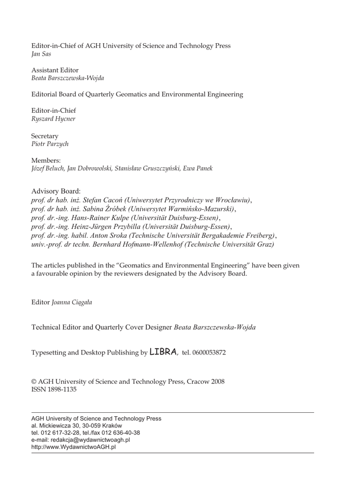 Editor-in-Chief of AGH University of Science and Technology Press Jan Sas Assistant Editor Beata Barszczewska-Wojda Editorial Board of Quarterly Geomatics and Environmental Engineering Editor-in-Chief Ryszard Hycner Secretary Piotr Parzych Members: Józef Beluch, Jan Dobrowolski, Stanis³aw Gruszczyñski, Ewa Panek Advisory Board: prof. dr hab. in¿. Stefan Cacoñ (Uniwersytet Przyrodniczy we Wroc³awiu), prof. dr hab. in¿. Sabina róbek (Uniwersytet Warmiñsko-Mazurski), prof. dr.-ing. Hans-Rainer Kulpe (Universität Duisburg-Essen), prof. dr.-ing. Heinz-Jürgen Przybilla (Universität Duisburg-Essen), prof. dr.-ing. habil. Anton Sroka (Technische Universität Bergakademie Freiberg), univ.-prof. dr techn. Bernhard Hofmann-Wellenhof (Technische Universität Graz) The articles published in the “Geomatics and Environmental Engineering” have been given a favourable opinion by the reviewers designated by the Advisory Board. Editor Joanna Ci¹ga³a Technical Editor and Quarterly Cover Designer Beata Barszczewska-Wojda Typesetting and Desktop Publishing by LIBRA, tel. 0600053872 © AGH University of Science and Technology Press, Cracow 2008 ISSN 1898-1135 AGH University of Science and Technology Press al. Mickiewicza 30, 30-059 Kraków tel. 012 617-32-28, tel./fax 012 636-40-38 e-mail: [email protected] http://www.WydawnictwoAGH.pl