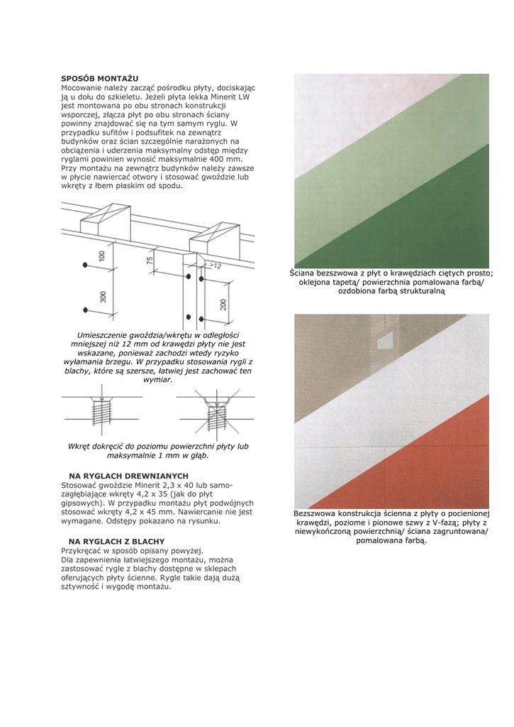 SPOSÓB MONTAŻU Mocowanie należy zacząć pośrodku płyty, dociskając ją u dołu do szkieletu. Jeżeli płyta lekka Minerit LW jest montowana po obu stronach konstrukcji wsporczej, złącza płyt po obu stronach ściany powinny znajdować się na tym samym ryglu. W przypadku sufitów i podsufitek na zewnątrz budynków oraz ścian szczególnie narażonych na obciążenia i uderzenia maksymalny odstęp między ryglami powinien wynosić maksymalnie 400 mm. Przy montażu na zewnątrz budynków należy zawsze w płycie nawiercać otwory i stosować gwoździe lub wkręty z łbem płaskim od spodu. Ściana bezszwowa z płyt o krawędziach ciętych prosto; oklejona tapetą/ powierzchnia pomalowana farbą/ ozdobiona farbą strukturalną Umieszczenie gwoździa/wkrętu w odległości mniejszej niż 12 mm od krawędzi płyty nie jest wskazane, ponieważ zachodzi wtedy ryzyko wyłamania brzegu. W przypadku stosowania rygli z blachy, które są szersze, łatwiej jest zachować ten wymiar. Wkręt dokręcić do poziomu powierzchni płyty lub maksymalnie 1 mm w głąb. NA RYGLACH DREWNIANYCH Stosować gwoździe Minerit 2,3 x 40 lub samozagłębiające wkręty 4,2 x 35 (jak do płyt gipsowych). W przypadku montażu płyt podwójnych stosować wkręty 4,2 x 45 mm. Nawiercanie nie jest wymagane. Odstępy pokazano na rysunku. NA RYGLACH Z BLACHY Przykręcać w sposób opisany powyżej. Dla zapewnienia łatwiejszego montażu, można zastosować rygle z blachy dostępne w sklepach oferujących płyty ścienne. Rygle takie dają dużą sztywność i wygodę montażu. Bezszwowa konstrukcja ścienna z płyty o pocienionej krawędzi, poziome i pionowe szwy z V-fazą; płyty z niewykończoną powierzchnią/ ściana zagruntowana/ pomalowana farbą. KLEJENIE Płyta lekka Minerit LW może być klejona wewnątrz budynków. Na podłożu drewnianym stosuje się tak zwany klej konstrukcyjny. Na podłożu gładkim z betonu, betonu lekkiego itp. zaleca się kleje firmy SIKA, SOUDAL lub podobny. Na podłożu ze stali lub tworzywa komórkowego płyty należy kleić klejem poliuretanowym. Należy ściśle przestrzegać instrukcji producenta kleju. WYKOŃCZENIE POWIERZCHNI PŁYTY MINERIT LW Zależnie od potrzeb łby wkrętów (gwoździ) można zaszpachlować lub pozostawić widoczne. Spoinę między płytami można zaszpachlować w przypadku zastosowania płyty typu "S" (z pocienioną krawędzią); w pozostałych przypadkach należy zostawić ją widoczną. W celu uzyskania estetycznego wyglądu powierzchni przed malowaniem należy usunąć wszystkie grady przy krawędziach i "kołnierze" wokół zamocowań. Dla zapewnienia odpowiedniej przyczepności powłok malarskich płytę należy dokładnie odkurzyć. Bezszwowa ściana z płyty o pocienionej krawędzi; płyty z niewykończoną powierzchnią/ ściana zagruntowana/ pomalowana farbą WYKOŃCZENIE POWIERZCHNI NA PŁYCIE TYPU "S" Spoiny pomiędzy płytami z pocieniona krawędzią należy wykończyć za pomocą zestawu do szpachlowania spoin (punkty 2 - 4 na rysunku). W przypadku stosowania tej metody możliwe jest malowanie powierzchni z ukrytymi spoinami a także tapetowanie zwykłą tapetą papierową. 1. 2. 3. 4. Płyta typu "S". Grunt. Taśma z włókna szklanego. Szpachlówka. Złącze ściany z płyt z V-fazą; niewykończona powierzchnia płyt/ ściana zagruntowana/ pomalowana farbą.
