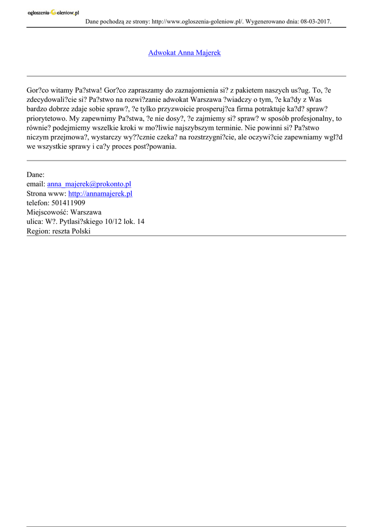 Dane pochodzą ze strony: http://www.ogloszenia-goleniow.pl/. Wygenerowano dnia: 08-03-2017. Adwokat Anna Majerek Gor?co witamy Pa?stwa! Gor?co zapraszamy do zaznajomienia si? z pakietem naszych us?ug. To, ?e zdecydowali?cie si? Pa?stwo na rozwi?zanie adwokat Warszawa ?wiadczy o tym, ?e ka?dy z Was bardzo dobrze zdaje sobie spraw?, ?e tylko przyzwoicie prosperuj?ca firma potraktuje ka?d? spraw? priorytetowo. My zapewnimy Pa?stwa, ?e nie dosy?, ?e zajmiemy si? spraw? w sposób profesjonalny, to równie? podejmiemy wszelkie kroki w mo?liwie najszybszym terminie. Nie powinni si? Pa?stwo niczym przejmowa?, wystarczy wy??cznie czeka? na rozstrzygni?cie, ale oczywi?cie zapewniamy wgl?d we wszystkie sprawy i ca?y proces post?powania. Dane: email: [email protected] Strona www: http://annamajerek.pl telefon: 501411909 Miejscowość: Warszawa ulica: W?. Pytlasi?skiego 10/12 lok. 14 Region: reszta Polski