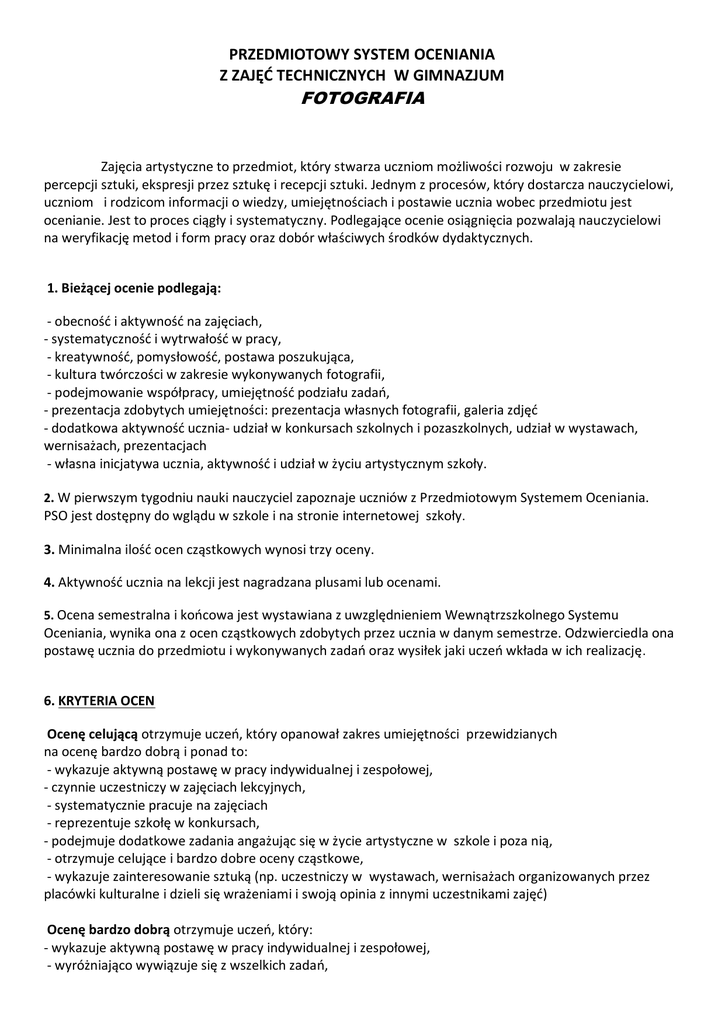PRZEDMIOTOWY SYSTEM OCENIANIA Z ZAJĘĆ TECHNICZNYCH W GIMNAZJUM FOTOGRAFIA Zajęcia artystyczne to przedmiot, który stwarza uczniom możliwości rozwoju w zakresie percepcji sztuki, ekspresji przez sztukę i recepcji sztuki. Jednym z procesów, który dostarcza nauczycielowi, uczniom i rodzicom informacji o wiedzy, umiejętnościach i postawie ucznia wobec przedmiotu jest ocenianie. Jest to proces ciągły i systematyczny. Podlegające ocenie osiągnięcia pozwalają nauczycielowi na weryfikację metod i form pracy oraz dobór właściwych środków dydaktycznych. 1. Bieżącej ocenie podlegają: - obecność i aktywność na zajęciach, - systematyczność i wytrwałość w pracy, - kreatywność, pomysłowość, postawa poszukująca, - kultura twórczości w zakresie wykonywanych fotografii, - podejmowanie współpracy, umiejętność podziału zadań, - prezentacja zdobytych umiejętności: prezentacja własnych fotografii, galeria zdjęć - dodatkowa aktywność ucznia- udział w konkursach szkolnych i pozaszkolnych, udział w wystawach, wernisażach, prezentacjach - własna inicjatywa ucznia, aktywność i udział w życiu artystycznym szkoły. 2. W pierwszym tygodniu nauki nauczyciel zapoznaje uczniów z Przedmiotowym Systemem Oceniania. PSO jest dostępny do wglądu w szkole i na stronie internetowej szkoły. 3. Minimalna ilość ocen cząstkowych wynosi trzy oceny. 4. Aktywność ucznia na lekcji jest nagradzana plusami lub ocenami. 5. Ocena semestralna i końcowa jest wystawiana z uwzględnieniem Wewnątrzszkolnego Systemu Oceniania, wynika ona z ocen cząstkowych zdobytych przez ucznia w danym semestrze. Odzwierciedla ona postawę ucznia do przedmiotu i wykonywanych zadań oraz wysiłek jaki uczeń wkłada w ich realizację . 6. KRYTERIA OCEN Ocenę celującą otrzymuje uczeń, który opanował zakres umiejętności przewidzianych na ocenę bardzo dobrą i ponad to: - wykazuje aktywną postawę w pracy indywidualnej i zespołowej, - czynnie uczestniczy w zajęciach lekcyjnych, - systematycznie pracuje na zajęciach - reprezentuje szkołę w konkursach, - podejmuje dodatkowe zadania angażując się w życie artystyczne w szkole i poza nią, - otrzymuje celujące i bardzo dobre oceny cząstkowe, - wykazuje zainteresowanie sztuką (np. uczestniczy w wystawach, wernisażach organizowanych przez placówki kulturalne i dzieli się wrażeniami i swoją opinia z innymi uczestnikami zajęć) Ocenę bardzo dobrą otrzymuje uczeń, który: - wykazuje aktywną postawę w pracy indywidualnej i zespołowej, - wyróżniająco wywiązuje się z wszelkich zadań, - otrzymuje bardzo dobre i dobre oceny cząstkowe, - wykonuje fotografie i prezentuje je na zajęciach, - zna zasady kompozycyjne fotografii - stosuje właściwie określone parametry i zasady dotyczące wykonywania zdjęć -potrafi analizować oglądane fotografie i wskazywać ich mocne strony oraz wskazywać popełnione błędy Ocenę dobrą otrzymuje uczeń, który: -zwykle pracuje systematycznie indywidualnie i w grupie, - odpowiednio wywiązuje się z części zadań i powierzonych ról, - najczęściej otrzymuje dobre oceny cząstkowe, - wykonuje i prezentuje swoje zdjęcia, - zwykle właściwie stosuje zasady dotyczące wykonywania zdjęć - dostrzega mocne strony oraz wskazuje popełnione błędy prezentowanych prac Ocenę dostateczną otrzymuje uczeń, który: - jego praca na zajęciach jest niesystematyczna, - niezbyt chętnie podejmuje działania, - najczęściej uzyskuje dostateczne oceny cząstkowe, - nie wykonuje własnych fotografii, - czasem stara się analizować zdjęcia wykonane przez innych, Ocenę dopuszczającą otrzymuje uczeń, który: - nie pracuje systematycznie, - niechętnie podejmuje wszelkie działania, - otrzymuje dopuszczające oceny cząstkowe, - wykazuje minimalne zainteresowanie fotografią. Ocenę niedostateczną otrzymuje uczeń, który: - nawet na poziomie elementarnym nie opanował umiejętności programowych - nie wykazuje zainteresowania przedmiotem, - nie bierze udziału w żadnych działaniach , 7. Wszystkie oceny jakie otrzymuje uczeń na lekcji są wpisane do dziennika lekcyjnego i są jawne. 8. O przewidywanej ocenie na semestr/koniec roku uczeń i jego rodzice są informowani miesiąc przed wystawianiem ocen. Prognozowana ocena zawsze może ulec zmianie na wyższą lub niższą. 9. Zajęcia artystyczne opierają się głównie na wykonywaniu przez uczniów zadań praktycznych – fotografowanie, prezentacja i analiza wykonanych zdjęć. /brak prac pisemnych/ 10. Zachowanie ucznia nie ma wpływu na ocenę z przedmiotu.
