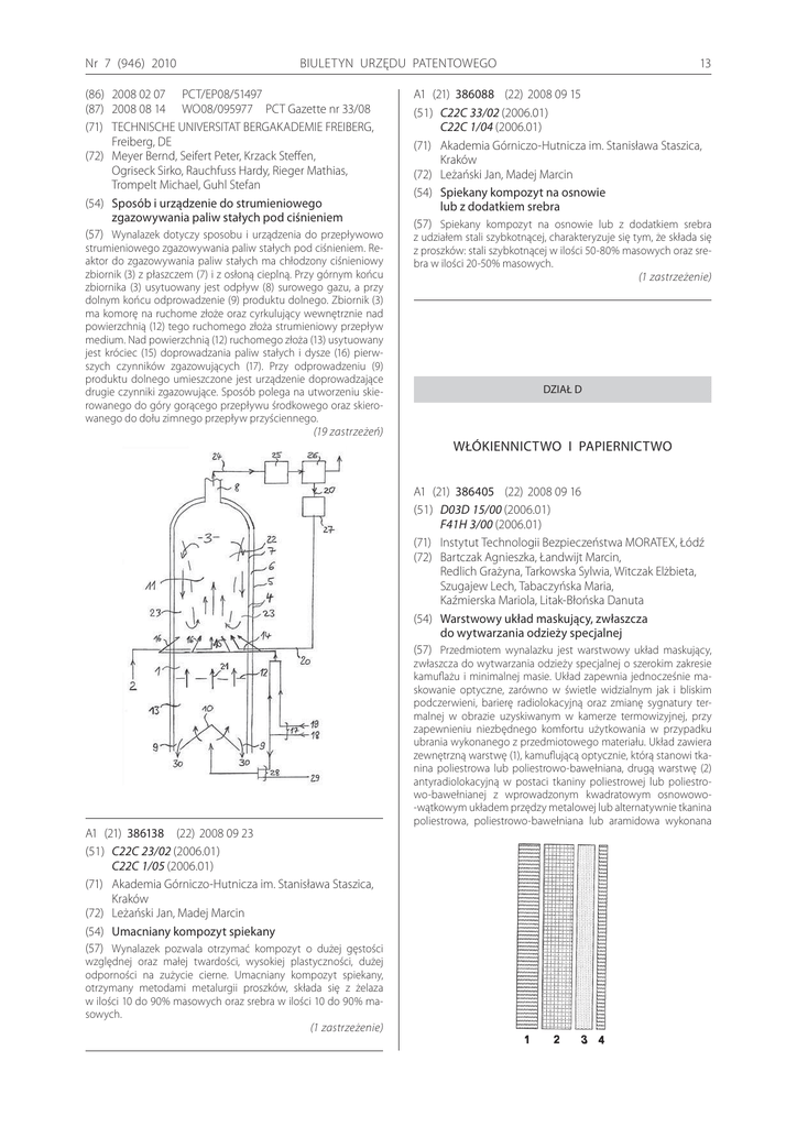 Nr 7 (946) 2010 BIULETYN URZĘDU PATENTOWEGO (86) 2008 02 07 PCT/EP08/51497 (87) 2008 08 14 WO08/095977 PCT Gazette nr 33/08 (71) TECHNISCHE UNIVERSITAT BERGAKADEMIE FREIBERG, Freiberg, DE (72) Meyer Bernd, Seifert Peter, Krzack Steffen, Ogriseck Sirko, Rauchfuss Hardy, Rieger Mathias, Trompelt Michael, Guhl Stefan (54) Sposób i urządzenie do strumieniowego zgazowywania paliw stałych pod ciśnieniem (57) Wynalazek dotyczy sposobu i urządzenia do przepływowo strumieniowego zgazowywania paliw stałych pod ciśnieniem. Reaktor do zgazowywania paliw stałych ma chłodzony ciśnieniowy zbiornik (3) z płaszczem (7) i z osłoną cieplną. Przy górnym końcu zbiornika (3) usytuowany jest odpływ (8) surowego gazu, a przy dolnym końcu odprowadzenie (9) produktu dolnego. Zbiornik (3) ma komorę na ruchome złoże oraz cyrkulujący wewnętrznie nad powierzchnią (12) tego ruchomego złoża strumieniowy przepływ medium. Nad powierzchnią (12) ruchomego złoża (13) usytuowany jest króciec (15) doprowadzania paliw stałych i dysze (16) pierwszych czynników zgazowujących (17). Przy odprowadzeniu (9) produktu dolnego umieszczone jest urządzenie doprowadzające drugie czynniki zgazowujące. Sposób polega na utworzeniu skierowanego do góry gorącego przepływu środkowego oraz skierowanego do dołu zimnego przepływ przyściennego. (19 zastrzeżeń) 13 A1 (21) 386088 (22) 2008 09 15 (51) C22C 33/02 (2006.01) C22C 1/04 (2006.01) (71) Akademia Górniczo-Hutnicza im. Stanisława Staszica, Kraków (72) Leżański Jan, Madej Marcin (54) Spiekany kompozyt na osnowie lub z dodatkiem srebra (57) Spiekany kompozyt na osnowie lub z dodatkiem srebra z udziałem stali szybkotnącej, charakteryzuje się tym, że składa się z proszków: stali szybkotnącej w ilości 50-80% masowych oraz srebra w ilości 20-50% masowych. (1 zastrzeżenie) DZIAŁ D WŁÓKIENNICTWO I PAPIERNICTWO A1 (21) 386405 (22) 2008 09 16 (51) D03D 15/00 (2006.01) F41H 3/00 (2006.01) (71) Instytut Technologii Bezpieczeństwa MORATEX, Łódź (72) Bartczak Agnieszka, Łandwijt Marcin, Redlich Grażyna, Tarkowska Sylwia, Witczak Elżbieta, Szugajew Lech, Tabaczyńska Maria, Kaźmierska Mariola, Litak-Błońska Danuta (54) Warstwowy układ maskujący, zwłaszcza do wytwarzania odzieży specjalnej (57) Przedmiotem wynalazku jest warstwowy układ maskujący, A1 (21) 386138 (22) 2008 09 23 (51) C22C 23/02 (2006.01) C22C 1/05 (2006.01) (71) Akademia Górniczo-Hutnicza im. Stanisława Staszica, Kraków (72) Leżański Jan, Madej Marcin (54) Umacniany kompozyt spiekany (57) Wynalazek pozwala otrzymać kompozyt o dużej gęstości względnej oraz małej twardości, wysokiej plastyczności, dużej odporności na zużycie cierne. Umacniany kompozyt spiekany, otrzymany metodami metalurgii proszków, składa się z żelaza w ilości 10 do 90% masowych oraz srebra w ilości 10 do 90% masowych. (1 zastrzeżenie) zwłaszcza do wytwarzania odzieży specjalnej o szerokim zakresie kamuflażu i minimalnej masie. Układ zapewnia jednocześnie maskowanie optyczne, zarówno w świetle widzialnym jak i bliskim podczerwieni, barierę radiolokacyjną oraz zmianę sygnatury termalnej w obrazie uzyskiwanym w kamerze termowizyjnej, przy zapewnieniu niezbędnego komfortu użytkowania w przypadku ubrania wykonanego z przedmiotowego materiału. Układ zawiera zewnętrzną warstwę (1), kamuflującą optycznie, którą stanowi tkanina poliestrowa lub poliestrowo-bawełniana, drugą warstwę (2) antyradiolokacyjną w postaci tkaniny poliestrowej lub poliestrowo-bawełnianej z wprowadzonym kwadratowym osnowowo-wątkowym układem przędzy metalowej lub alternatywnie tkanina poliestrowa, poliestrowo-bawełniana lub aramidowa wykonana