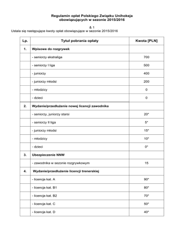 Regulamin opłat Polskiego Związku Unihokeja obowiązujących w sezonie 2015/2016 &1 Ustala się następujące kwoty opłat obowiązujące w sezonie 2015/2016 Lp. 1. 2. 3. Tytuł pobrania opłaty Wpisowe do rozgrywek - seniorzy ekstraliga 700 - seniorzy I liga 500 - juniorzy 400 - juniorzy młodsi 200 - młodzicy 0 - dzieci 0 Wydanie/przedłużenie nowej licencji zawodnika - seniorzy, juniorzy starsi 20* - seniorzy II liga 5* - juniorzy młodsi 15* - młodzicy 10* - dzieci 0* Ubezpieczenie NNW - zawodnika w sezonie rozgrywkowym 4. Kwota [PLN] 15 Wydanie/przedłużenie licencji trenerskiej - licencja kat. A 90* - licencja kat. B1 80* - licencja kat. B2 70* - licencja kat. C 50* - licencja kat. D 40* Lp. 5. 6. 7. Tytuł pobrania opłaty Kwota [PLN] Wydanie/przedłużenie licencji sędziowskiej - licencja A 150** - licencja B 100** - licencja C 75** - licencja D 50** Zmiana barw klubowych - seniorzy 100 - juniorzy 50 - umowa szkoleniowa pomiędzy dwoma klubami 100 Kaucja odwoławcza - odwołanie od decyzji organu I instancji 200 - odwołanie w sprawie przynależności klubowej 200 - protest dotyczący meczu 200 8. Wydanie legitymacji klasy sportowej zawodnika 30 9. Wydanie zaświadczenia 10. - trenerowi 30 - zawodnikowi 30 Wydanie dyplomu ukończenia kursu - asystenta instruktora unihokeja 30 - instruktora unihokeja 30 - trenera unihokeja 30 * - kwota nie zawiera ubezpieczenia, ** - kwota zawiera ubezpieczenie. §2 1. Na podstawie zgłoszenia biuro Polskiego Związku Unihokeja wystawia rachunek wg tabeli zgodnej z §1 z terminem płatności 7 dni. 2. Klub wystawiający drużyny w kilku kategoriach wiekowych, uiszcza opłatę wpisową w pełnej wysokości dla drużyn wystawionych w dwóch najwyższych kategoriach). Opłata wpisowego za pozostałe zgłoszone drużyny uiszcza się w wysokości 50 % opłaty określonej w tabeli, o której mowa w § 1, obowiązującej za każdą kategorię. 3. Nie uiszcza się opłaty za zmianę barw klubowych w przypadku, gdy: • Zawodnik podjął naukę w innym mieście niż miejsce zamieszkania i zdecydował się na grę w danym klubie. • W związku z zakończeniem nauki, zawodnik powraca do klubu, w którym występował bezpośrednio przed zmianą klubu w związku z podjęciem nauki, • W klubie, który zawodnik opuszcza nie prowadzi się drużyny, w której zawodnik będzie występował. 4. W przypadkach określonych w ust. 3 klub, do którego przechodzi zawodnik, przedstawia na piśmie warunki przejścia zawodnika Zarządowi Związku. 5. W przypadku rozgrywek młodzików/młodziczek 50% opłaty licencji przeznaczone jest na działalność Okręgowego Związku, który organizuje regionalne rozgrywki w danym rejonie. §3 1. Prawo wykładni niniejszego regulaminu przysługuje Zarządowi Polskiego Związku Unihokeja. 2. Wszelkie zmiany w treści regulaminu podejmuje Zarząd Polskiego Związku Unihokeja. &4 Niniejszy regulamin został przyjęty Uchwałą Nr 16/2015 Zarządu Polskiego Związku Unihokeja w dniu 20.06.2015 roku