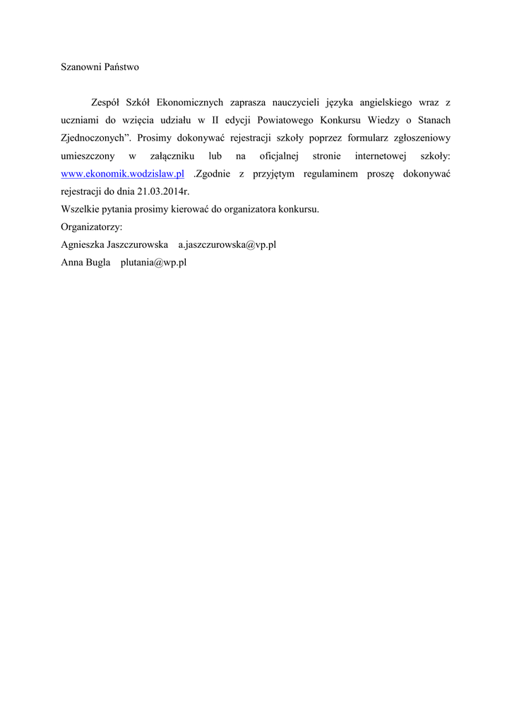 Szanowni Państwo Zespół Szkół Ekonomicznych zaprasza nauczycieli języka angielskiego wraz z uczniami do wzięcia udziału w II edycji Powiatowego Konkursu Wiedzy o Stanach Zjednoczonych”. Prosimy dokonywać rejestracji szkoły poprzez formularz zgłoszeniowy umieszczony w załączniku lub na oficjalnej stronie internetowej szkoły: www.ekonomik.wodzislaw.pl .Zgodnie z przyjętym regulaminem proszę dokonywać rejestracji do dnia 21.03.2014r. Wszelkie pytania prosimy kierować do organizatora konkursu. Organizatorzy: Agnieszka Jaszczurowska [email protected] Anna Bugla [email protected] Regulamin Powiatowego Konkursu Wiedzy o Stanach Zjednoczonych I. Organizatorem konkursu jest Zespół Szkół Ekonomicznych przy współpracy z PODN w Wodzisławiu Śląskim w osobie doradcy metodycznego języka angielskiego II. Cele konkursu: 1. Popularyzacja języka angielskiego. 2. Poszerzanie wiedzy na temat Stanów Zjednoczonych. 3. Rozwijanie zainteresowań językowych uczniów. II. Obowiązujący zakres materiału: 1. Znajomość języka angielskiego na poziomie min. średniozaawansowanym niższym (preintermediate). 2. Znajomość zagadnień z zakresu kultury, historii, geografii, literatury oraz życia codziennego Stanów Zjednoczonych. IV. Warunki uczestnictwa: 1. W konkursie biorą udział uczniowie klas III gimnazjum oraz uczniowie szkół ponadgimnazjalnych powiatu wodzisławskiego. 2. Szkoła może być reprezentowana przez maksymalnie dwóch uczniów V. Przebieg konkursu: 1. Etap szkolny – odbywa się na terenie szkół biorących udział w konkursie. Za przygotowanie etapu szkolnego są odpowiedzialni nauczyciele języka angielskiego danej szkoły. Dwóch najlepszych uczniów weźmie udział w etapie powiatowym. Zgłoszenia do etapu powiatowego (formularz zgłoszeniowy) należy przesłać na adres organizatora Zespół Szkół Ekonomicznych im Oskara Langego ul. Szkolna 1, 44-300 Wodzisław Śląski, faxem 32 4554056 lub pocztą elektroniczną [email protected] do dnia 21 marca 2014 2. Etap powiatowy – odbędzie się w Zespole Szkół Ekonomicznych w Wodzisławiu Śląskim dnia 8 kwietnia 2014 (wtorek) o godzinie 9.00 i będzie miał formę testu pisemnego zawierającego pytania otwarte i zamknięte w języku angielskim. Czas trwania testu to około 60 minut. VI. Etap powiatowy przygotowuje i przeprowadza komisja składająca się z doradcy metodycznego języka angielskiego oraz nauczycieli języka angielskiego Zespołu Szkół Ekonomicznych. O kolejności zdobytych miejsc decyduje ilość punktów zdobytych w teście etapu powiatowego. VII. Uczestnicy etapu powiatowego otrzymują zaświadczenie o uczestnictwie, a laureaci indywidualne nagrody oraz dyplomy. VIII. W przypadku nieprzewidzianych sytuacji, nie ujętych regulaminem, decyzję podejmuje przewodniczący komisji. IX. Uczestnicy konkursu wyrażają zgodę na umieszczenie ich nazwisk na stronie internetowej organizatora konkursu X. Podanie wyników etapu finałowego oraz wręczenie nagród nastąpi w dniu przeprowadzania konkursu po sprawdzeniu prac. XI. Nauczyciele zaangażowani w organizację konkursu nie mogą przygotowywać uczniów do tegoż konkursu. FORMULARZ ZGŁOSZENIOWY DO KONKURSU II Powiatowy Konkurs wiedzy o Stanach Zjednoczonych Nazwa i adres szkoły…………………………………………………………............................... …………………………………………………………………………………… ……………………………………………………………………………………. Telefon …………………………………………………………………............... Fax ………………………………………………………………………………. Email …………………………………………………………………………….. L.p Imię i nazwisko uczestnika konkursu Klasa Imię i nazwisko opiekuna uczestnika