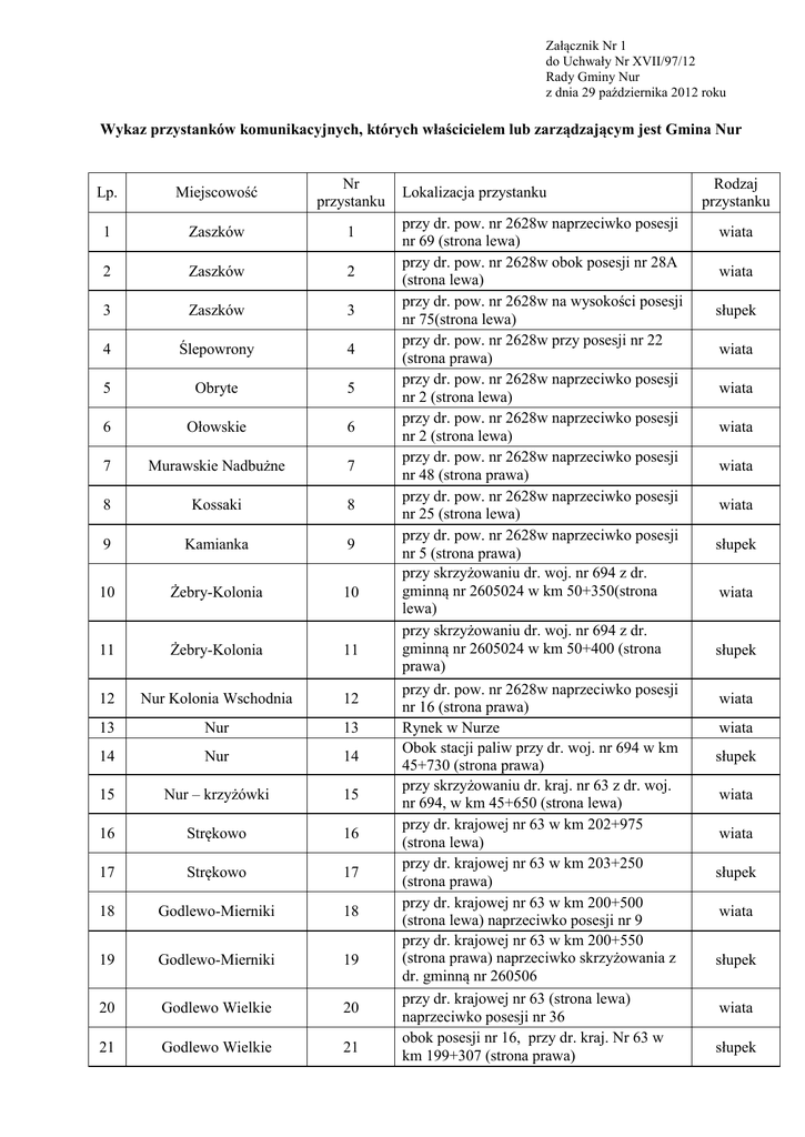 Załącznik Nr 1 do Uchwały Nr XVII/97/12 Rady Gminy Nur z dnia 29 października 2012 roku Wykaz przystanków komunikacyjnych, których właścicielem lub zarządzającym jest Gmina Nur Lp. Miejscowość Nr przystanku 1 Zaszków 1 2 Zaszków 2 3 Zaszków 3 4 Ślepowrony 4 5 Obryte 5 6 Ołowskie 6 7 Murawskie Nadbużne 7 8 Kossaki 8 9 Kamianka 9 10 Żebry-Kolonia 10 11 Żebry-Kolonia 11 12 Nur Kolonia Wschodnia 12 13 Nur 13 14 Nur 14 15 Nur – krzyżówki 15 16 Strękowo 16 17 Strękowo 17 18 Godlewo-Mierniki 18 19 Godlewo-Mierniki 19 20 Godlewo Wielkie 20 21 Godlewo Wielkie 21 Lokalizacja przystanku przy dr. pow. nr 2628w naprzeciwko posesji nr 69 (strona lewa) przy dr. pow. nr 2628w obok posesji nr 28A (strona lewa) przy dr. pow. nr 2628w na wysokości posesji nr 75(strona lewa) przy dr. pow. nr 2628w przy posesji nr 22 (strona prawa) przy dr. pow. nr 2628w naprzeciwko posesji nr 2 (strona lewa) przy dr. pow. nr 2628w naprzeciwko posesji nr 2 (strona lewa) przy dr. pow. nr 2628w naprzeciwko posesji nr 48 (strona prawa) przy dr. pow. nr 2628w naprzeciwko posesji nr 25 (strona lewa) przy dr. pow. nr 2628w naprzeciwko posesji nr 5 (strona prawa) przy skrzyżowaniu dr. woj. nr 694 z dr. gminną nr 2605024 w km 50+350(strona lewa) przy skrzyżowaniu dr. woj. nr 694 z dr. gminną nr 2605024 w km 50+400 (strona prawa) przy dr. pow. nr 2628w naprzeciwko posesji nr 16 (strona prawa) Rynek w Nurze Obok stacji paliw przy dr. woj. nr 694 w km 45+730 (strona prawa) przy skrzyżowaniu dr. kraj. nr 63 z dr. woj. nr 694, w km 45+650 (strona lewa) przy dr. krajowej nr 63 w km 202+975 (strona lewa) przy dr. krajowej nr 63 w km 203+250 (strona prawa) przy dr. krajowej nr 63 w km 200+500 (strona lewa) naprzeciwko posesji nr 9 przy dr. krajowej nr 63 w km 200+550 (strona prawa) naprzeciwko skrzyżowania z dr. gminną nr 260506 przy dr. krajowej nr 63 (strona lewa) naprzeciwko posesji nr 36 obok posesji nr 16, przy dr. kraj. Nr 63 w km 199+307 (strona prawa) Rodzaj przystanku wiata wiata słupek wiata wiata wiata wiata wiata słupek wiata słupek wiata wiata słupek wiata wiata słupek wiata słupek wiata słupek 22 Ołtarze-Gołacze 22 23 Ołtarze-Gołacze 23 24 Zuzela 24 25 Zuzela 25 26 Zakrzewo-Słomy 26 27 Zakrzewo-Słomy 27 przy skrzyżowaniu dr. woj. nr 694 z dr. gminną nr 260510ww km 43+310 (strona lewa) przy dr. woj. nr 694 w km 43+400 (strona prawa) przy dr. woj. nr 694 naprzeciwko posesji nr 30 w km 41+200 (strona lewa) przy dr. woj. nr 694 naprzeciwko posesji nr 25 w km 41+350 (strona prawa) przy dr. woj. nr 694 naprzeciwko posesji nr 11 w km 40+070 (strona lewa) przy dr. woj. nr 694 naprzeciwko posesji nr 3 w km 40+200 (strona prawa) wiata słupek wiata wiata wiata słupek