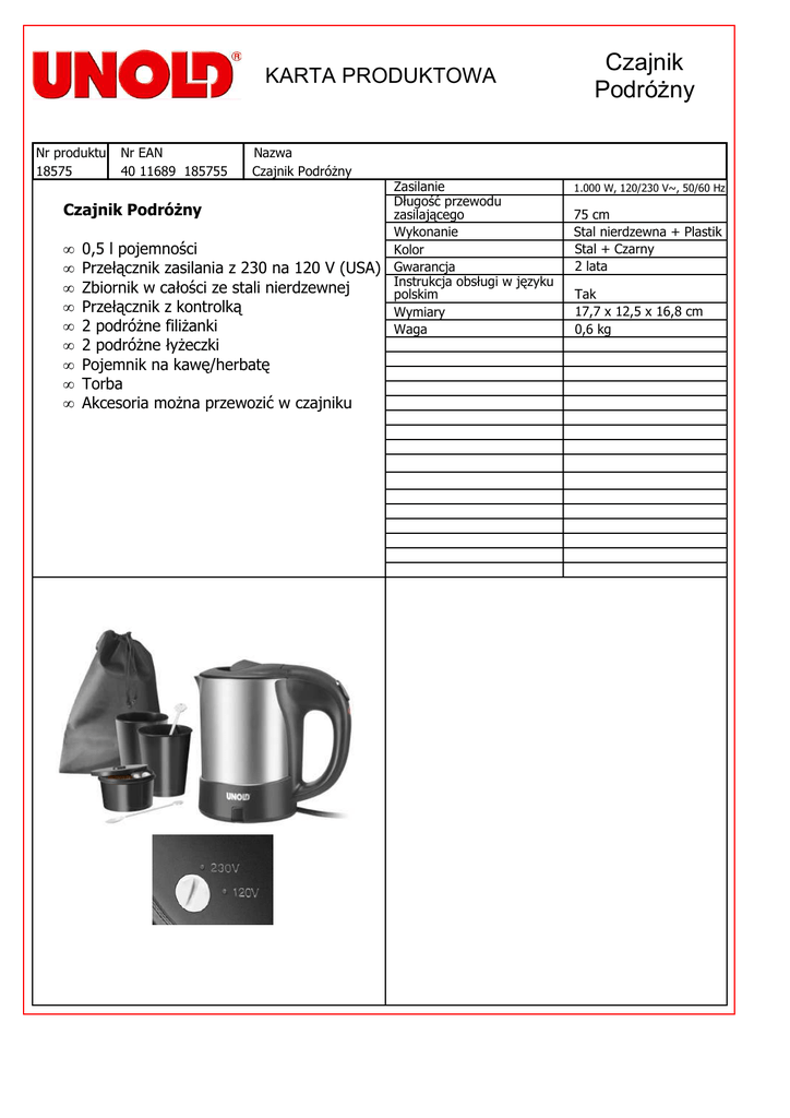 KARTA PRODUKTOWA Nr produktu 18575 Nr EAN 40 11689 185755 Nazwa Czajnik Podróżny Czajnik Podróżny • • • • • • • • • 0,5 l pojemności Przełącznik zasilania z 230 na 120 V (USA) Zbiornik w całości ze stali nierdzewnej Przełącznik z kontrolką 2 podróżne filiżanki 2 podróżne łyżeczki Pojemnik na kawę/herbatę Torba Akcesoria można przewozić w czajniku 1 2 Czajnik Podróżny Zasilanie Długość przewodu zasilającego Wykonanie Kolor Gwarancja Instrukcja obsługi w języku polskim Wymiary Waga 1.000 W, 120/230 V~, 50/60 Hz 75 cm Stal nierdzewna + Plastik Stal + Czarny 2 lata Tak 17,7 x 12,5 x 16,8 cm 0,6 kg