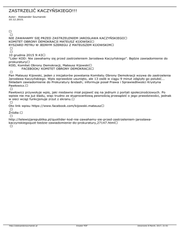 ZASTRZELIĆ KACZYŃSKIEGO!!! Autor: Aleksander Szumanski 10.12.2015. NIE ZAWAHAMY SIĘ PRZED ZASTRZELENIEM JAROSLAWA KACZYŃSKIEGO KOMITET OBRONY DEMOKRACJI MATEUSZ KIJOWSKI RYSZARD PETRU W JEDNYM SZEREGU Z MATEUSZEM KIJOWSKIM 10 grudnia 2015 9:43 "Lider KOD: Nie zawahamy się przed zastrzeleniem Jarosława Kaczyńskiego". Będzie zawiadomienie do prokuratury KOD, Komitet Obrony Demokracji, Mateusz Kijowski FACEBOOK/ KOMITET OBRONY DEMOKRACJI Pan Mateusz Kijowski, jeden z inicjatorów powstania Komitetu Obrony Demokracji wzywa do zastrzelenia Jarosława Kaczyńskiego. Wpis wprawdzie usunięto, ale 13 osób w ciągu 9 minut zdążyło go polubić... Składam zawiadomienie do Prokuratury – informuje poseł Prawa i Sprawiedliwości Krystyna Pawłowicz. Pawłowicz przywołuje wpis, jaki niedawno miał pojawić się na jednym z portali społecznościowych. Po wpisie nie ma już śladu, więc trudno ze stuprocentową pewnością przesądzić o jego prawdziwości, jednak w sieci wciąż funkcjonuje zrzut z ekranu. Oto link wpisu https://www.facebook.com/kijowski.mateusz Źródła: http://telewizjarepublika.pl/quotlider-kod-nie-zawahamy-sie-przed-zastrzeleniem-jaroslawakaczynskiegoquot-bedzie-zawiadomienie-do-prokuratury,27147.html http://aleksanderszumanski.pl Kreator PDF Utworzono 8 March, 2017, 21:01