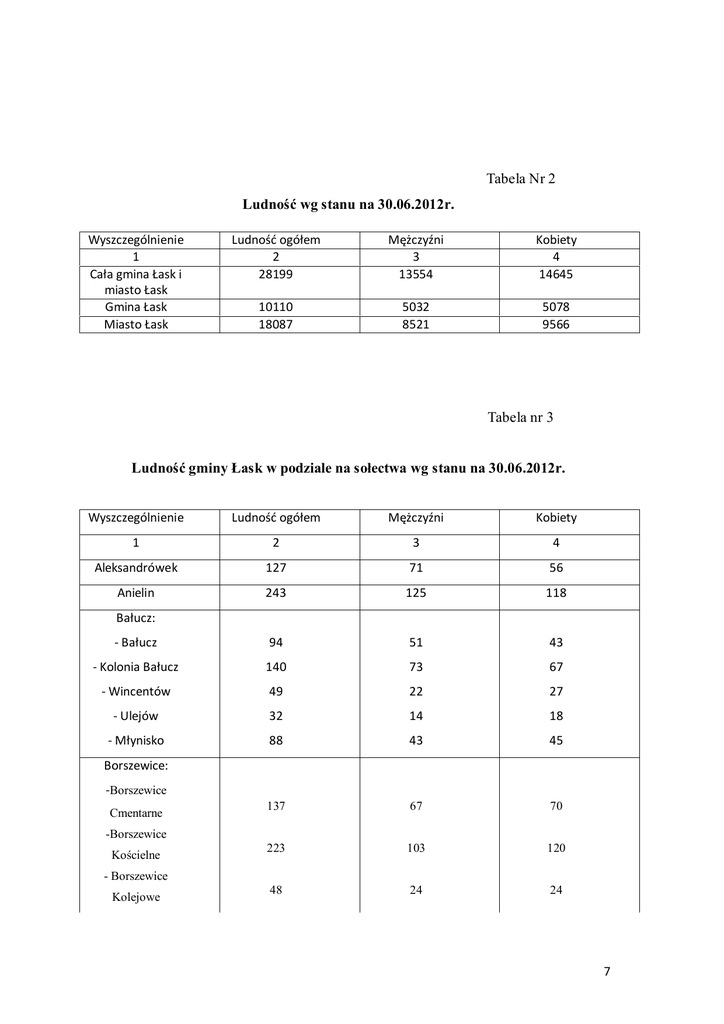 Tabela Nr 2 Ludność wg stanu na 30.06.2012r. Wyszczególnienie 1 Cała gmina Łask i miasto Łask Gmina Łask Miasto Łask Ludność ogółem 2 28199 Mężczyźni 3 13554 Kobiety 4 14645 10110 18087 5032 8521 5078 9566 Tabela nr 3 Ludność gminy Łask w podziale na sołectwa wg stanu na 30.06.2012r. Wyszczególnienie Ludność ogółem Mężczyźni Kobiety 1 2 3 4 Aleksandrówek 127 71 56 Anielin 243 125 118 - Bałucz 94 51 43 - Kolonia Bałucz 140 73 67 - Wincentów 49 22 27 - Ulejów 32 14 18 - Młynisko 88 43 45 137 67 70 223 103 120 48 24 24 Bałucz: Borszewice: -Borszewice Cmentarne -Borszewice Kościelne - Borszewice Kolejowe 7 Budy Stryjewskie 124 64 60 Gorczyn 406 199 207 Karszew 139 67 72 -Kopyść 272 130 142 -Mikołajówek 54 24 30 Krzucz 113 57 56 431 215 216 Cegielnia 98 49 49 - Podłaszcze 114 54 60 Mauryca 101 51 50 Okup Mały 635 307 328 - Okup Wielki 232 109 123 - Grabina 64 32 32 - Kolonia Bilew 91 43 48 750 375 375 14 9 5 - Ostrów 394 197 197 - Ostrów-Osiedle 277 143 134 Rembów 55 29 26 Remiszew 105 53 52 Rokitnica 253 131 122 Sięganów 281 157 124 141 70 71 Kopyść: Łopatki: - Łopatki - Łopatki- Okup Wielki: Orchów: - Orchów - OrchówWesółka Ostrów: Stryje Księże: - Stryje Księże 8 - Jabłonki 53 24 29 Stryje Paskowe 144 77 67 - Teodory 422 201 221 - Teodory-Osiedle 64 34 30 Wiewiórczyn 729 350 379 Wola Bałucka 180 86 94 Wola Łask 459 230 229 Wola Stryjewska 145 74 71 Wronowice 793 399 394 -Wrzeszczewice 147 62 85 - Wrzeszczewice- 134 69 65 38 19 19 Nowe 59 29 30 Wydrzyn 331 168 163 Zielęcice 87 52 35 Teodory: Wrzeszczewice: Skrejnia - WrzeszczewiceTomaszew Wrzeszczewice 9