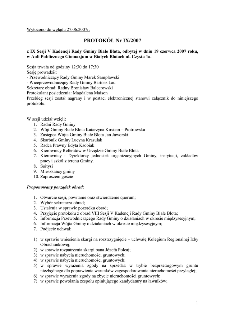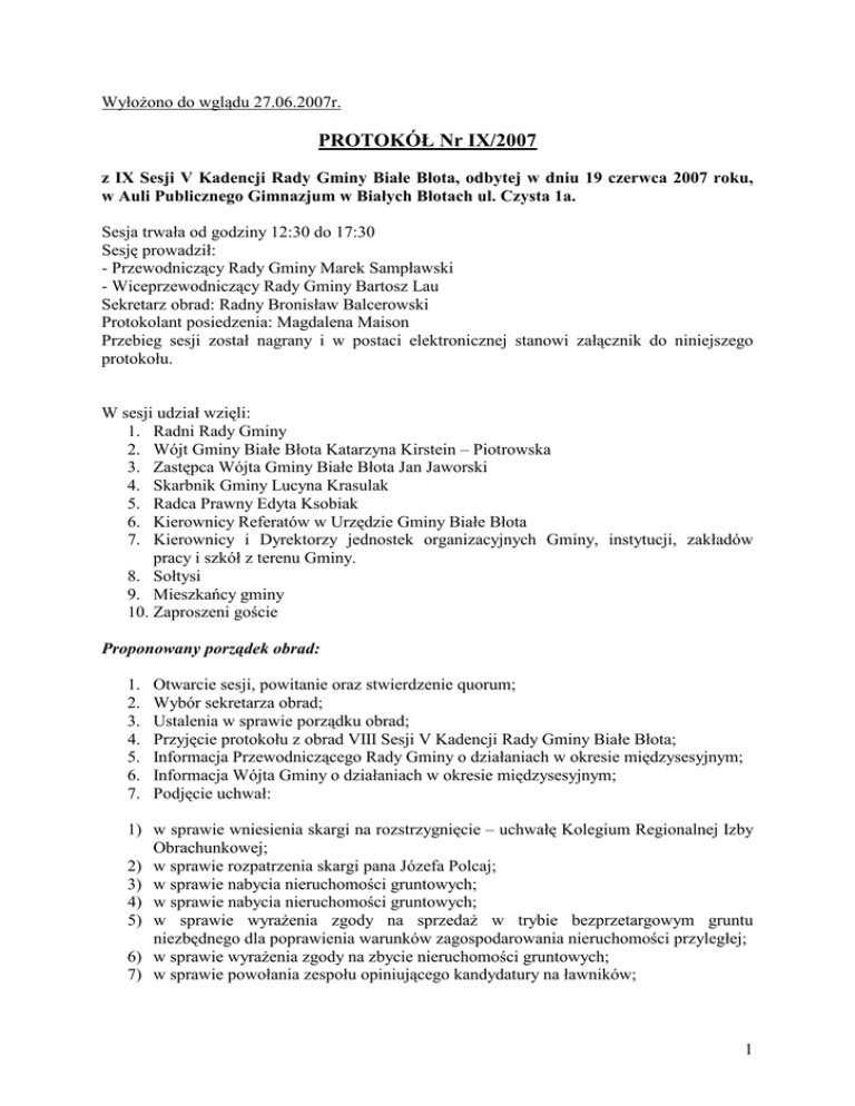 WyłoŜono do wglądu 27.06.2007r. PROTOKÓŁ Nr IX/2007 z IX Sesji V Kadencji Rady Gminy Białe Błota, odbytej w dniu 19 czerwca 2007 roku, w Auli Publicznego Gimnazjum w Białych Błotach ul. Czysta 1a. Sesja trwała od godziny 12:30 do 17:30 Sesję prowadził: - Przewodniczący Rady Gminy Marek Sampławski - Wiceprzewodniczący Rady Gminy Bartosz Lau Sekretarz obrad: Radny Bronisław Balcerowski Protokolant posiedzenia: Magdalena Maison Przebieg sesji został nagrany i w postaci elektronicznej stanowi załącznik do niniejszego protokołu. W sesji udział wzięli: 1. Radni Rady Gminy 2. Wójt Gminy Białe Błota Katarzyna Kirstein – Piotrowska 3. Zastępca Wójta Gminy Białe Błota Jan Jaworski 4. Skarbnik Gminy Lucyna Krasulak 5. Radca Prawny Edyta Ksobiak 6. Kierownicy Referatów w Urzędzie Gminy Białe Błota 7. Kierownicy i Dyrektorzy jednostek organizacyjnych Gminy, instytucji, zakładów pracy i szkół z terenu Gminy. 8. Sołtysi 9. Mieszkańcy gminy 10. Zaproszeni goście Proponowany porządek obrad: 1. 2. 3. 4. 5. 6. 7. Otwarcie sesji, powitanie oraz stwierdzenie quorum; Wybór sekretarza obrad; Ustalenia w sprawie porządku obrad; Przyjęcie protokołu z obrad VIII Sesji V Kadencji Rady Gminy Białe Błota; Informacja Przewodniczącego Rady Gminy o działaniach w okresie międzysesyjnym; Informacja Wójta Gminy o działaniach w okresie międzysesyjnym; Podjęcie uchwał: 1) w sprawie wniesienia skargi na rozstrzygnięcie – uchwałę Kolegium Regionalnej Izby Obrachunkowej; 2) w sprawie rozpatrzenia skargi pana Józefa Polcaj; 3) w sprawie nabycia nieruchomości gruntowych; 4) w sprawie nabycia nieruchomości gruntowych; 5) w sprawie wyraŜenia zgody na sprzedaŜ w trybie bezprzetargowym gruntu niezbędnego dla poprawienia warunków zagospodarowania nieruchomości przyległej; 6) w sprawie wyraŜenia zgody na zbycie nieruchomości gruntowych; 7) w sprawie powołania zespołu opiniującego kandydatury na ławników; 1 8) w sprawie zatwierdzenia Regulaminu Działania Kolegium Redakcyjnego Głosu Białych Błot; 9) w sprawie zatwierdzenia planów prac Komisji Stałych Rady Gminy Białe Błota; 10) zmieniającą uchwałę w sprawie regulaminu wynagradzania nauczycieli i zasad przyznawania nauczycielskiego dodatku mieszkaniowego; 11) w sprawie zmian w budŜecie gminy na 2007r.; 12) w sprawie określenia zakresu i formy informacji o przebiegu wykonania budŜetu Gminy Białe Błota oraz informacji o przebiegu wykonania planów finansów samorządowych instytucji kultury i samodzielnego publicznego zakładu opieki zdrowotnej za I półrocze 2007r. 13) w sprawie zaliczenia dróg do kategorii dróg gminnych; 14) w sprawie stanowienia o kierunkach działania Wójta Gminy zamierzających do przejęcia gruntów; 15) w sprawie przystąpienia do sporządzenia zmiany miejscowego planu zagospodarowania przestrzennego osiedla „Murowaniec”; 16) w sprawie przystąpienia do sporządzenia zmiany miejscowego planu zagospodarowania przestrzennego osiedla „Murowaniec”; 17) w sprawie przystąpienia do sporządzenia zmiany miejscowego planu zagospodarowania przestrzennego osiedla „Murowaniec”; 18) w sprawie przystąpienia do sporządzenia miejscowego planu zagospodarowania przestrzennego dla terenu w Zielonce; 19) w sprawie przystąpienia do sporządzenia miejscowego planu zagospodarowania przestrzennego dla terenu w Kruszynie Krajeńskim; 20) w sprawie przystąpienia do sporządzenia miejscowego planu zagospodarowania przestrzennego dla terenu w Białych Błotach; 21) w sprawie przystąpienia do sporządzenia zmiany miejscowego planu zagospodarowania przestrzennego dla terenu w Białych Błotach; 22) w sprawie przystąpienia do sporządzenia zmiany miejscowego planu zagospodarowania przestrzennego dla terenu w Przyłękach; 23) w sprawie stanowienia o kierunkach działania Wójta Gminy zmierzających do przeprowadzenia na terenie Gminy Białe Błota sondaŜu; 24) w sprawie korespondencji w tym pism, wniosków, skarg itd., które wpływają do Rady Gminy pomiędzy sesjami Rady Gminy. 8. Składanie interpelacji i zapytań przez radnych 9. Odpowiedzi na wnioski i interpelacje oraz zapytania radnych. 10. Wolne wnioski i zapytania. 11. Udzielanie odpowiedzi na zapytania. 12. Zakończenie obrad IX Sesji V Kadencji. Ad. 1. Otwarcie sesji i powitanie. Otwarcia IX Sesji dokonał Przewodniczący Rady Gminy Białe Błota Marek Sampławski wypowiadając słowa cyt. „Otwieram IX sesję V Kadencji Rady Gminy Białe Błota”. Przywitał wszystkich obecnych gości. Przewodniczący RG stwierdził obecność na Sesji wszystkich 15 radnych, co wobec ustawowego składu Rady wynoszącego 15 radnych stanowi quorum, więc radni byli władni podejmować uchwały. 2 Ad.2. Wybór sekretarza obrad. Przewodniczący RG złoŜył wniosek o powołanie na sekretarza obrad Radnego Bronisława Balcerowskiego. Wniosek został zatwierdzony stosunkiem głosów 14 za, 1 głos wstrzymujący się, przy 15 obecnych radnych. Ad.3. Ustalenia w sprawie porządku obrad. Przewodniczący RG poinformował, Ŝe Wójt Gminy wystąpiła z wnioskiem o wykreślenie z porządku obrad projektu uchwały w sprawie zaliczenia dróg do kategorii dróg gminnych. Wójt Gminy wyjaśniła, Ŝe są prawne przeszkody w podjęciu uchwały, a mianowicie brak opinii Zarządu Powiatu w sprawie projektu uchwały. Radni w głosowaniu jawnym 15 głosami za, przy 15 obecnych radnych, przyjęli zaproponowaną zmianę. Ad.4. Przyjęcie protokołu z obrad VIII Sesji V Kadencji Rady Gminy Białe Błota. Przewodniczący RG poddał pod głosowanie przyjęcie protokółu z VIII Sesji Rady Gminy Białe Błota odbytej w dniu 16 maja 2007r. Radni w głosowaniu jawnym 15 głosami za, przy 15 obecnych radnych, przyjęli protokół z VIII Sesji Rady Gminy Białe Błota. Ad.5. Informacja Przewodniczącego Rady Gminy o działaniach w okresie międzysesyjnym. Przewodniczący RG poinformował, iŜ w okresie międzysesyjnym zbierały się następujące Komisje: -Komisj