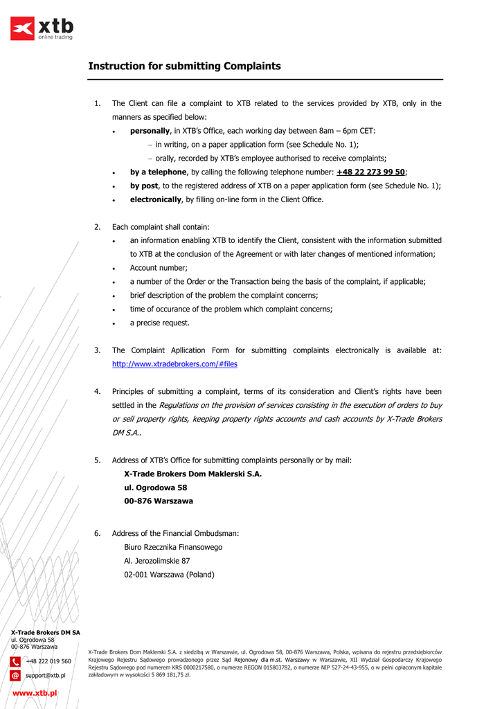 Instruction for submitting Complaints 1. The Client can file a complaint to XTB related to the services provided by XTB, only in the manners as specified below: personally, in XTB’s Office, each working day between 8am – 6pm CET: in writing, on a paper application form (see Schedule No. 1); orally, recorded by XTB’s employee authorised to receive complaints; 2. by a telephone, by calling the following telephone number: +48 22 273 99 50; by post, to the registered address of XTB on a paper application form (see Schedule No. 1); electronically, by filling on-line form in the Client Office. Each complaint shall contain: an information enabling XTB to identify the Client, consistent with the information submitted to XTB at the conclusion of the Agreement or with later changes of mentioned information; 3. Account number; a number of the Order or the Transaction being the basis of the complaint, if applicable; brief description of the problem the complaint concerns; time of occurance of the problem which complaint concerns; a precise request. The Complaint Apllication Form for submitting complaints electronically is available at: http://www.xtradebrokers.com/#files 4. Principles of submitting a complaint, terms of its consideration and Client’s rights have been settled in the Regulations on the provision of services consisting in the execution of orders to buy or sell property rights, keeping property rights accounts and cash accounts by X-Trade Brokers DM S.A.. 5. Address of XTB’s Office for submitting complaints personally or by mail: X-Trade Brokers Dom Maklerski S.A. ul. Ogrodowa 58 00-876 Warszawa 6. Address of the Financial Ombudsman: Biuro Rzecznika Finansowego Al. Jerozolimskie 87 02-001 Warszawa (Poland) X-Trade Brokers DM SA ul. Ogrodowa 58 00-876 Warszawa +48 222 019 560 [email protected] www.xtb.pl X-Trade Brokers Dom Maklerski S.A. z siedzibą w Warszawie, ul. Ogrodowa 58, 00-876 Warszawa, Polska, wpisana do rejestru przedsiębiorców Krajowego Rejestru Sądowego prowadzonego przez Sąd Rejonowy dla m.st. Warszawy w Warszawie, XII Wydział Gospodarczy Krajowego Rejestru Sądowego pod numerem KRS 0000217580, o numerze REGON 015803782, o numerze NIP 527-24-43-955, o w pełni opłaconym kapitale zakładowym w wysokości 5 869 181,75 zł. Schedule No. 1 COMPLAINT FORM Name and surname / name of the company: ID number / register number / tax identification number: Account number concerns: the complaint Order ID/ Position ID/Transaction ID connected with the complaint: Date/time the problem occurred: Description of the complaint: Client’s demands: Please send the answer electronically, to my e-mail address (YES/NO): Date and signature: X-Trade Brokers DM SA ul. Ogrodowa 58 00-876 Warszawa +48 222 019 560 [email protected] www.xtb.pl X-Trade Brokers Dom Maklerski S.A. z siedzibą w Warszawie, ul. Ogrodowa 58, 00-876 Warszawa, Polska, wpisana do rejestru przedsiębiorców Krajowego Rejestru Sądowego prowadzonego przez Sąd Rejonowy dla m.st. Warszawy w Warszawie, XII Wydział Gospodarczy Krajowego Rejestru Sądowego pod numerem KRS 0000217580, o numerze REGON 015803782, o numerze NIP 527-24-43-955, o w pełni opłaconym kapitale zakładowym w wysokości 5 869 181,75 zł.