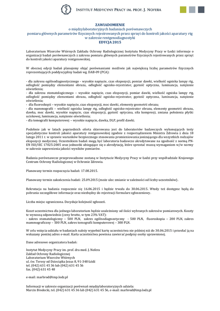 ZAWIADOMIENIE o międzylaboratoryjnych badaniach porównawczych pomiaru głównych parametrów fizycznych rejestrowanych przez sprzęt do kontroli jakości aparatury rtg w zakresie rentgenodiagnostyki EDYCJA 2015 Laboratorium Wzorców Wtórnych Zakładu Ochrony Radiologicznej Instytutu Medycyny Pracy w Łodzi informuje o organizacji badań porównawczych z zakresu pomiaru głównych parametrów fizycznych rejestrowanych przez sprzęt do kontroli jakości aparatury rentgenowskiej. W obecnej edycji badań planujemy objąć porównaniami możliwie jak największą liczbę parametrów fizycznych reprezentujących poddyscypliny badań wg. DAB-09 (PCA): - dla zakresu ogólnodiagnostycznego - wysokie napięcie, czas ekspozycji, pomiar dawki, wielkość ogniska lampy rtg, odległość pomiędzy elementami obrazu, odległość ognisko-rejestrator, gęstość optyczna, luminancja, natężenie oświetlenia; - dla zakresu stomatologicznego – wysokie napięcie, czas ekspozycji, pomiar dawki, wielkość ogniska lampy rtg, odległość pomiędzy elementami obrazu, odległość ognisko-rejestrator, gęstość optyczna, luminancja, natężenie oświetlenia; - dla fluoroskopii – wysokie napięcie, czas ekspozycji, moc dawki, elementy geometrii obrazu; - dla mammografii – wielkość ogniska lampy rtg, odległość ognisko-rejestrator obrazu, elementy geometrii obrazu, dawka, moc dawki, wysokie napięcie, czas ekspozycji, gęstość optyczna, siła kompresji, zmiana położenia płytki uciskowej, luminancja, natężenie oświetlenia; - dla tomografii komputerowej – wysokie napięcie, dawka, DLP, profil dawki. Podobnie jak w latach poprzednich oferta skierowana jest do laboratoriów badawczych wykonujących testy specjalistyczne kontroli jakości aparatury rentgenowskiej zgodnie z rozporządzeniem Ministra Zdrowia z dnia 18 lutego 2011 r. w sprawie warunków bezpiecznego stosowania promieniowania jonizującego dla wszystkich rodzajów ekspozycji medycznej. Uczestnikiem badań mogą być laboratoria badawcze akredytowane na zgodność z normą PNEN ISO/IEC 17025:2005 oraz jednostki ubiegające się o akredytację, które sprostać muszą wymaganiom w/w normy w zakresie zapewnienia jakości wyników pomiarów. Badania porównawcze przeprowadzone zostaną w Instytucie Medycyny Pracy w Łodzi przy współudziale Krajowego Centrum Ochrony Radiologicznej w Ochronie Zdrowia. Planowany termin rozpoczęcia badań: 17.08.2015. Planowany termin zakończenia badań: 25.09.2015 (może ulec zmianie w zależności od liczby uczestników). Rekrutacja na badania rozpocznie się 16.06.2015 i będzie trwała do 30.06.2015. Wtedy też dostępne będą do pobrania szczegółowe informacje oraz niezbędny do rejestracji formularz zgłoszeniowy. Liczba miejsc ograniczona. Decyduje kolejność zgłoszeń. Koszt uczestnictwa dla jednego laboratorium będzie uzależniony od ilości wybranych zakresów pomiarowych. Koszty te wynoszą odpowiednio (ceny brutto, w tym 23% VAT): - zakres stomatologiczny – 500 PLN, zakres ogólnodiagnostyczny - 500 PLN, fluoroskopia – 200 PLN, zakres mammograficzny – 500 PLN, zakres tomografii komputerowej – 300 PLN. W celu wzięcia udziału w badaniach należy wypełnić kartę uczestnictwa nie później niż do 30.06.2015 i przesłać ją na wskazany poniżej adres e-mail. Karta uczestnictwa powinna zawierać podpisy osoby uprawnionej. Dane adresowe organizatora badań: Instytut Medycyny Pracy im. prof. dra med. J. Nofera Zakład Ochrony Radiologicznej Laboratorium Wzorców Wtórnych ul. św. Teresy od Dzieciątka Jezus 8, 91-348 Łódź tel. (042) 631 45 36 lub (042) 631 45 56 fax. (042) 631 45 48 e-mail: [email protected] Informacji w zakresie organizacji porównań międzylaboratoryjnych udziela: Marcin Brodecki, tel. (042) 631 45 36 lub (042) 631 45 56, e-mail: [email protected]