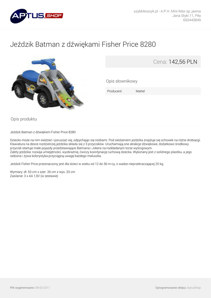 szybkikoszyk.pl - A.P.H. Mini-Max sp, jawna Jana Styki 11, Piła 693443849 Jeździk Batman z dźwiękami Fisher Price 8280 Cena: 142,56 PLN Opis słownikowy Producent Mattel Opis produktu Jeździk Batman z dźwiękiem Fisher Price 8280 Dziecko może na nim siedzieć i poruszać się, odpychając się nóżkami. Pod siedzeniem jeździka znajduje się schowek na różne drobiazgi. Klawiatura na desce rozdzielczej jeździka składa się z 3 przycisków. Uruchamiają one atrakcje dźwiękowe, dodatkowo środkowy przycisk startuje małe pojazdy przedstawiające Batmana i Jokera na rozkładanym torze wyścigowym. Zalety jeździka: rozwija umiejętności, wyobraźnię, ćwiczy koordynację ruchową dziecka. Wykonany jest z solidnego plastiku, a jego radosna i żywa kolorystyka przyciągną uwagę każdego maluszka. Jeździk Fisher Price przeznaczony jest dla dzieci w wieku od 12 do 36 m-cy, o wadze nieprzekraczającej 20 kg. Wymiary: dł. 53 cm x szer. 26 cm x wys. 33 cm Zasilanie: 3 x AA 1,5V (w zestawie) Plik wygenerowano: 08-03-2017 Powered by TCPDF (www.tcpdf.org) Oprogramowanie sklepu: AptusShop