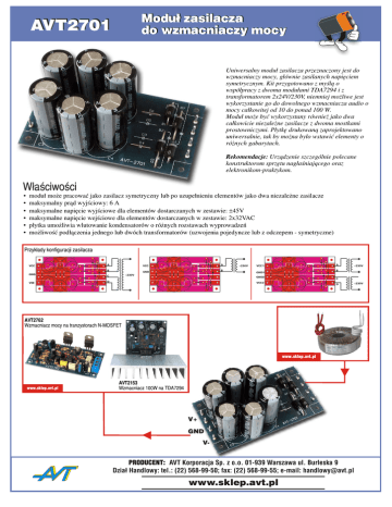 Modu³ zasilacza do wzmacniaczy mocy AVT2701 Uniwersalny modu³ zasilacza przeznaczony jest do wzmacniaczy mocy, g³ównie zasilanych napiêciem symetrycznym. Kit przygotowano z myœl¹ o wspó³pracy z dwoma modu³ami TDA7294 i z transformatorem 2x24V/230V, niemniej mo¿liwe jest wykorzystanie go do dowolnego wzmacniacza audio o mocy ca³kowitej od 10 do ponad 100 W. Modu³ mo¿e byæ wykorzystany równie¿ jako dwa ca³kowicie niezale¿ne zasilacze z dwoma mostkami prostowniczymi. P³ytkê drukowan¹ zaprojektowano uniwersalnie, tak by mo¿na by³o wstawiæ elementy o ró¿nych gabarytach. Rekomendacje: Urz¹dzenie szczególnie polecane konstruktorom sprzêtu nag³aœniaj¹cego oraz elektronikom-praktykom. W³aœciwoœci • • • • • • modu³ mo¿e pracowaæ jako zasilacz symetryczny lub po uzupe³nieniu elementów jako dwa niezale¿ne zasilacze maksymalny pr¹d wyjœciowy: 6 A maksymalne napiêcie wyjœciowe dla elementów dostarczanych w zestawie: ±45V maksymalne napiêcie wejœciowe dla elementów dostarczanych w zestawie: 2x32VAC p³ytka umo¿liwia wlutowanie kondensatorów o ró¿nych rozstawach wyprowadzeñ mo¿liwoœæ pod³¹czenia jednego lub dwóch transformatorów (uzwojenia pojedyncze lub z odczepem - symetryczne) Przyk³ady konfiguracji zasilacza AVT2762 Wzmacniacz mocy na tranzystorach N-MOSFET www.sklep.avt.pl www.sklep.avt.pl AVT2153 Wzmacniacz 100W na TDA7294 V+ GND V- PRODUCENT: AVT Korporacja Sp. z o.o. 01-939 Warszawa ul. Burleska 9 Dzia³ Handlowy: tel.: (22) 568-99-50; fax: (22) 568-99-55; e-mail: [email protected] www.sklep.avt.pl