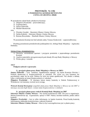 PROTOKÓŁ Nr 2/06 Z POSIEDZENIA KOMISJI REWIZYJNE Z DNIA 20 GRUDNIA 2006R W posiedzeniu udział brali członkowie Komisji: 1) Zbigniew Przybylski – przewodniczący, 2) Zygmunt Bury, 3) Janusz Paliwoda, 4) Michał Okoniewski oraz 1) Wiesław Gozdek – Burmistrz Miasta i Gminy Mrocza, 2) Stefan Kubicki – Sekretarz Miasta i Gminy Mrocza, 3) Bożena Brzezińska – Skarbnik Miasta i Gminy Mrocza W posiedzeniu Komisji nie brał udziału radny Tomasz Krakowski – usprawiedliwiony. Przebieg posiedzenia protokołowała podinspektor ds. obsługi Rady Miejskiej – Agnieszka Dulińska. TEMATYKA POSIEDZENIA 1) Otwarcie, stwierdzenie quorum i przyjęcia protokołu z poprzedniego posiedzenia Komisji 2) Analiza materiałów przygotowanych pod obrady III sesji Rady Miejskiej w Mroczy 3) Wolne głosy i wnioski Ad.2/ Podjęcie uchwał w sprawach: 1) przyjęcie planu pracy Rady Miejskiej w Mroczy na 2007r Janusz Paliwoda – Tym tematem, zagadnieniem zajmuje się chyba Komisja Oświaty i Polityki Społecznej tj. bezpieczeństwem w szkołach. Nie wiem czy tym tematem nie powinniśmy zająć się na sesji. Dobrze by było ten temat upublicznić. Nie chodzi o debatę tylko o informację na temat bezpieczeństwa w szkołach. Zbigniew Przybylski – W miesiącu lutym mamy kontrolę w Szkole Podstawowej w Witosławiu i też możemy zwrócić na to uwagę. Wniosek Komisji Rewizyjnej: uzupełnić plam pracy Rady Miejskiej w Mroczy na rok 2007 w miesiącu styczniu bądź lutym o temat stanu bezpieczeństwa w szkołach. 2) przyjęcie planu pracy stałych Komisji Rady Miejskiej na 2007 Sekretarz Miasta i Gminy Mrocza – Nie można kontrolować OSP. Nie jest to organizacja. Można kontrolować np. wyposażenie, sprzęt w OSP. Należy uściślać kontrole, podać zakres kontroli. Zbigniew Przybylski – Jest to tylko informacja, że będzie kontrola. Przed każdą kontrolą informujemy jednostkę kontrolowaną o zakresie kontroli. Sekretarz Miasta i Gminy Mrocza – Musi to być uszczegółowione już w planie pracy. 1 Burmistrz Miasta i Gminy Mrocza – Plan kontroli zatwierdza Rada Miejska, dlatego należy dokładnie sprecyzować cel. Zbigniew Przybylski – W Regulaminie Rady Miejskiej nic o tym nie ma. Burmistrz Miasta i Gminy Mrocza – Musi być podany termin kontroli, kogo będziemy kontrolować i w jakim zakresie. Zbigniew Przybylski – W Regulaminie pisze, że ma być podany termin kontroli i jaką jednostkę będziemy kontrolować. Burmistrz Miasta i Gminy Mrocza – Wy musicie mieć upoważnienie do przeprowadzenia kontroli i zakres tej kontroli. Zbigniew Przybylski – To się mija z celem. Jeśli ktoś będzie dokładnie znał zakres kontroli to już wcześniej się do niej przygotuje. W Regulaminie Rady Miejskiej wyczytałem, że w planie kontroli mamy podać tylko kogo będzie dotyczyła kontrola. Później o zakresie kontroli informujemy. Burmistrz Miasta i Gminy Mrocza – Musi to być podane już w palnie kontroli. Zbigniew Przybylski – W dwóch poprzednich kadencjach tak było i było dobrze. Janusz Paliwoda – Później, jak ma się odbyć kontrola, podajemy dokładny zakres kontroli. Sekretarz Miasta i Gminy Mrocza – Zgodnie z ustawą o samorządzie Komisja Rewizyjna musi być, pozostałe niekoniecznie. Plan kontroli Komisji Rewizyjnej określa Rada Miejska. Zbigniew Przybylski – Uważam, że tak jak mamy jest dobrze. Plan kontroli Komisji Rewizyjnej stanowi załącznik do niniejszego protokołu. 3) „Programu współpracy Gminy Mrocza z organizacjami pozarządowymi oraz innymi podmiotami prowadzącymi działalność pożytku publicznego, których mowa w art.3 ust.3 ustawy z dnia 24 kwietnia 2003r o działalności pożytku publicznego i wolontariacie na rok 2007” Sekretarz Miasta i Gminy Mrocza – Co roku należy opracować taki Program. Ten Program może nie jest doskonały. Wychodzimy z założenia, że lepiej, aby był szerszy. Zbigniew Przybylski – W § 4 ust. 7 pkt.1 jest mowa o zorganizowaniu gminnego forum organizacji pozarządowych. Kiedy takie forum powstanie? Sekretarz Miasta i Gminy Mrocza – Forum Organizacji Pozarządowych już działa. Jego przewodniczącą jest pani Maria Nowacka. Janusz Paliwoda - W § 4 mowa jest o sferach współpracy obejmują, czy nie należy dopisać młodzieży szczególnie uzdolnionej np. aby mogła bezpłatnie korzystać z sali? Sekretarz Miasta i Gminy Mrocza – Tylko czy jakaś organizacja się tym zajmuje? Czy któraś z organizacji ma zapisane wspieranie młodzieży? Janusz Paliwoda – Teraz nie mamy takiej osoby, ale później może się pojawić. Burmistrz Miasta i Gminy Mrocza – Jest to oferta bardzo szeroka. Czy nie powinien być to Program tylko na to, na co dajemy pieniądze? Dajemy pieniądze tylko na to, co jest zaplanowane w budżecie. Może w przyszłości będą większe pieniądze. To powinien być bardzo konkretny dokument, powinno być dokładnie napisane, co nas interesuje i na co mamy pieniądze. Janusz Paliwoda – Jeśli ta sugestia nie ma państwa aprobaty, to nie będę się przy niej opierał. Burmistrz Miasta i Gminy Mrocza – U nas organizacje nie są aktywne. Sekretarz Miasta i Gminy Mrocza - Lepiej aby ten Program był szerszy bo nie wiadomo na co „przyjdą” pieniądze z zewnątrz. Komisja nie wniosła więcej uwag i jest za przyjęciem projektu uchwały. 4) przyjęcia „Strategii Rozwiązywania Problemów Społecznych w Gminie Mrocza” 2 Sekretarz Miasta i Gminy Mrocza – Ustawa o pomocy społecznej nakłada obowiązek opracowania takiego dokumentu. Burmistrz Miasta i Gminy Mrocza – Każdy dokument, który jest przyjmowany przez Radę może być zmieniany, w razie potrzeby. Ja, przestudiowałem go i mam wiele uwag do niego. Zbigniew Przybylski – Jak czytałem Strategie to zwróciłem uwagę na dostęp do usług medycznych. Niby mamy, ale jeśli chcemy pójść do specjalisty musimy się dużo wcześniej zapisać lub pójść prywatnie. Burmistrz Miasta i Gminy Mrocza – Ochrona zdrowia ni