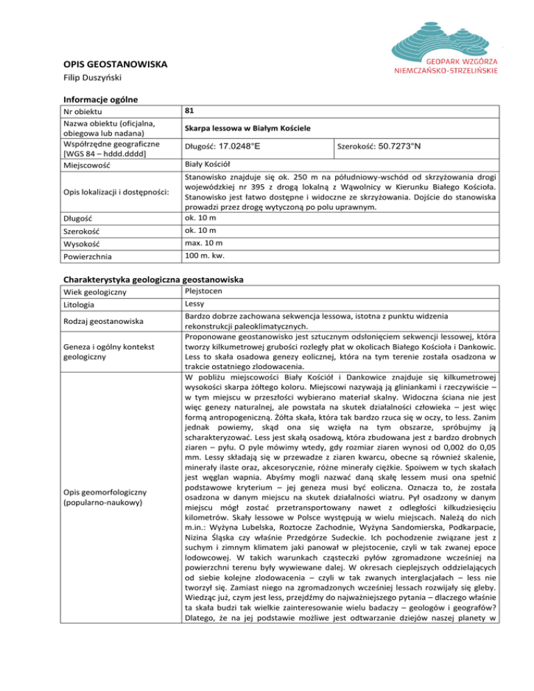 OPIS GEOSTANOWISKA Filip Duszyński Informacje ogólne Nr obiektu Nazwa obiektu (oficjalna, obiegowa lub nadana) Współrzędne geograficzne [WGS 84 – hddd.dddd] Miejscowość 81 Skarpa lessowa w Białym Kościele Długość: 17.0248°E Szerokość: 50.7273°N Biały Kościół Długość Stanowisko znajduje się ok. 250 m na półudniowy-wschód od skrzyżowania drogi wojewódzkiej nr 395 z drogą lokalną z Wąwolnicy w Kierunku Białego Kościoła. Stanowisko jest łatwo dostępne i widoczne ze skrzyżowania. Dojście do stanowiska prowadzi przez drogę wytyczoną po polu uprawnym. ok. 10 m Szerokość ok. 10 m Wysokość max. 10 m Powierzchnia 100 m. kw. Opis lokalizacji i dostępności: Charakterystyka geologiczna geostanowiska Wiek geologiczny Plejstocen Litologia Lessy Rodzaj geostanowiska Geneza i ogólny kontekst geologiczny Opis geomorfologiczny (popularno-naukowy) Bardzo dobrze zachowana sekwencja lessowa, istotna z punktu widzenia rekonstrukcji paleoklimatycznych. Proponowane geostanowisko jest sztucznym odsłonięciem sekwencji lessowej, która tworzy kilkumetrowej grubości rozległy płat w okolicach Białego Kościoła i Dankowic. Less to skała osadowa genezy eolicznej, która na tym terenie została osadzona w trakcie ostatniego zlodowacenia. W pobliżu miejscowości Biały Kościół i Dankowice znajduje się kilkumetrowej wysokości skarpa żółtego koloru. Miejscowi nazywają ją gliniankami i rzeczywiście – w tym miejscu w przeszłości wybierano materiał skalny. Widoczna ściana nie jest więc genezy naturalnej, ale powstała na skutek działalności człowieka – jest więc formą antropogeniczną. Żółta skała, która tak bardzo rzuca się w oczy, to less. Zanim jednak powiemy, skąd ona się wzięła na tym obszarze, spróbujmy ją scharakteryzować. Less jest skałą osadową, która zbudowana jest z bardzo drobnych ziaren – pyłu. O pyle mówimy wtedy, gdy rozmiar ziaren wynosi od 0,002 do 0,05 mm. Lessy składają się w przewadze z ziaren kwarcu, obecne są również skalenie, minerały ilaste oraz, akcesorycznie, różne minerały ciężkie. Spoiwem w tych skałach jest węglan wapnia. Abyśmy mogli nazwać daną skałę lessem musi ona spełnić podstawowe kryterium – jej geneza musi być eoliczna. Oznacza to, że została osadzona w danym miejscu na skutek działalności wiatru. Pył osadzony w danym miejscu mógł zostać przetransportowany nawet z odległości kilkudziesięciu kilometrów. Skały lessowe w Polsce występują w wielu miejscach. Należą do nich m.in.: Wyżyna Lubelska, Roztocze Zachodnie, Wyżyna Sandomierska, Podkarpacie, Nizina Śląska czy właśnie Przedgórze Sudeckie. Ich pochodzenie związane jest z suchym i zimnym klimatem jaki panował w plejstocenie, czyli w tak zwanej epoce lodowcowej. W takich warunkach cząsteczki pyłów zgromadzone wcześniej na powierzchni terenu były wywiewane dalej. W okresach cieplejszych oddzielających od siebie kolejne zlodowacenia – czyli w tak zwanych interglacjałach – less nie tworzył się. Zamiast niego na zgromadzonych wcześniej lessach rozwijały się gleby. Wiedząc już, czym jest less, przejdźmy do najważniejszego pytania – dlaczego właśnie ta skała budzi tak wielkie zainteresowanie wielu badaczy – geologów i geografów? Dlatego, że na jej podstawie możliwe jest odtwarzanie dziejów naszej planety w Historia badań naukowych Bibliografia (format Lithos) okresie plejstocenu – a więc nawet 2 mln lat. Sekwencje lessowe, takie jak ta, prezentowana na niniejszym geostanowisku, zawierają mniej lub bardziej precyzyjny zapis tego, co działo się tysiące lat temu. Na podstawie różnych cech poszczególnych warstewek można wnosić, jak zmieniał się klimat. Sekwencja obserwowana na stanowisku pomiędzy Białym Kościołem a Dankowicami prezentuje na przykład zapis ponad 100 tys. lat. Grubość lessów w tym miejscu wynosi ok. 8 metrów. Z sekwencji tej badacze odczytali na przykład, że kilkanaście tysięcy lat temu miała tutaj miejsce soliflukcja, co jest jednym ze świadectw klimatu peryglacjalnego. Pokrywy lessowe są jednym z najbardziej charakterystycznych komponentów rzeźby Wzgórz Niemczańsko-Strzelińskich. Chociaż wzgórza te zbudowane są ze starych skał, które powstały setki milionów lat temu w erze paleozoicznej, w trakcie epoki lodowcowej znaczna ich część została przykryta płatami lessu. Może więc powiedzieć, że stara rzeźba, która ewoluowała na skutek różnic w odporności skał na procesy wietrzeniowe przez miliony lat, została ukryta pod płaszczem bardzo młodych, w geologicznej skali czasu, utworów wieku plejstoceńskiego. Konsekwencją tego jest fakt, że na Wzgórzach Niemczańsko-Strzelińskich możemy spotkać się z licznym przykładami tzw. erozji wąwozowej. Lessy łatwo poddają się rozcinaniu przez spływającą wodę i w trakcie katastrofalnych opadów dochodzi do ich upłynnienia i usunięcia. W efekcie, w licznych miejscach spotykamy się z głębokimi, suchymi dolinami, o bardzo stromych zboczach. Liczne badania w obrębie opisywanego stanowiska prowadził Z. Jary z zespołem. Na podstawie sekwencji lessowej określano zapis zmian klimatu w okresie plejstoceńskim. 1. Komar M., Jary Z., Ciszek D., Kida J., 2004, Palynology of aeolian sediments of the Late Pleistocene at Biały Kościół, Niemcza-Strzelin Hills (preliminary results), [w:] Z. Jary (red.), Zmiany klimatu zapisane w sekwencjach lessowych, IV Seminarium Lessowe, Strzelin 13-16 października 2004, Instytut Geografii i Rozwoju Regionalnego Uniwersytetu Wrocławskiego, s. 63-64. 2. Jary Z., Ciszek D., Kida J., 2004, Odsłonięcie lessów w Białym Kościele koło Strzelina, [w:] Z. Jary (red.), Zmiany klimaty zapisane w sekwencjach lessowych, IV Seminarium Lessowe, Strzelin 13-16 października 2004, Instytut Geografii i Rozwoju Regionalnego Uniwersytetu Wrocławskiego, s. 97-101. 3. Jary Z., 2007, Zapis zmian klimatu w górnoplejstoceńsk