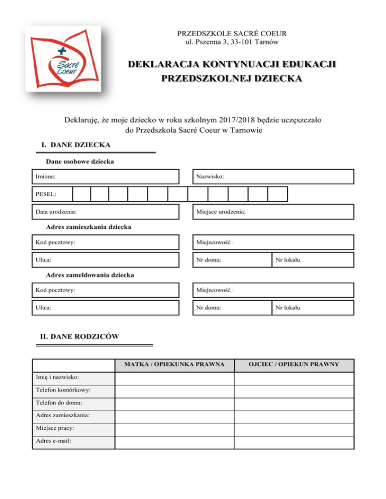 PRZEDSZKOLE SACRÉ COEUR ul. Pszenna 3, 33-101 Tarnów DEKLARACJA KONTYNUACJI EDUKACJI PRZEDSZKOLNEJ DZIECKA Deklaruję, że moje dziecko w roku szkolnym 2017/2018 będzie uczęszczało do Przedszkola Sacré Coeur w Tarnowie I. DANE DZIECKA Dane osobowe dziecka Imiona: Nazwisko: PESEL: Data urodzenia: Miejsce urodzenia: Adres zamieszkania dziecka Kod pocztowy: Miejscowość : Ulica: Nr domu: Nr lokalu Adres zameldowania dziecka Kod pocztowy: Miejscowość : Ulica: Nr domu: Nr lokalu II. DANE RODZICÓW MATKA / OPIEKUNKA PRAWNA Imię i nazwisko: Telefon komórkowy: Telefon do domu: Adres zamieszkania: Miejsce pracy: Adres e-mail: OJCIEC / OPIEKUN PRAWNY III. OŚWIADCZENIE RODZICÓW ZOBOWIĄZUJEMY SIĘ DO: przestrzegania postanowień statutu przedszkola; podawania do wiadomości przedszkola jakichkolwiek zmian w podanych wyżej informacjach; regularnego uiszczania opłat za przedszkole w wyznaczonym terminie Za dzień zapłaty uznaje się dzień uznania rachunku bankowego przedszkola lub wpływ gotówki do rąk uprawnionej osoby. W przypadku opóźnienia w zapłacie przysługują odsetki ustawowe. Zapłata będzie regulowana od miesiąca września, płatna do 10 dnia miesiąca. punktualnego przyprowadzania i odbierania dziecka z przedszkola osobiście lub przez osobę dorosłą, zgłoszoną w upoważnieniu; przyprowadzania do przedszkola tylko zdrowego dziecka; uczestniczenia w spotkaniach informacyjnych, formacyjnych i szkoleniowych dla rodziców. INFORMACJE DOTYCZĄCE DANYCH OSOBOWYCH DZIECKA I JEGO RODZINY: Uprzedzeni o odpowiedzialności karnej z art. 233 k.k. oświadczamy, że podane powyżej dane są zgodne ze stanem faktycznym (za podanie nieprawdziwych danych mogą być wyciągnięte odpowiednie konsekwencje włącznie ze skreśleniem dziecka z listy przedszkolaków); Zgodnie z art. 23 Ustawy z dnia 29 sierpnia 1997 r. o ochronie danych osobowych (Dz. U. z 2002 r. Nr 101, poz. 926 ze zm.) wyrażamy zgodę na zbieranie, przetwarzanie i wykorzystywanie ww. danych osobowych przez Przedszkole Sacré Coeur w Tarnowie dla potrzeb działalności oświatowo – wychowawczej; Wyrażamy zgodę na publikacje wizerunku naszej rodziny z imprez i uroczystości przedszkolnych na stronie internetowej oraz portalu społecznościowym dokumentujących działalność naszego Przedszkola Data i podpis maki/ opiekunki prawnej: Data i podpis ojca/ opiekuna prawnego: PRZYJĘCIE POTWIERDZENIA DEKLARACJI KONTYNUACJI EDUKACJI DZIECKA data wpływu podpis przyjmującego