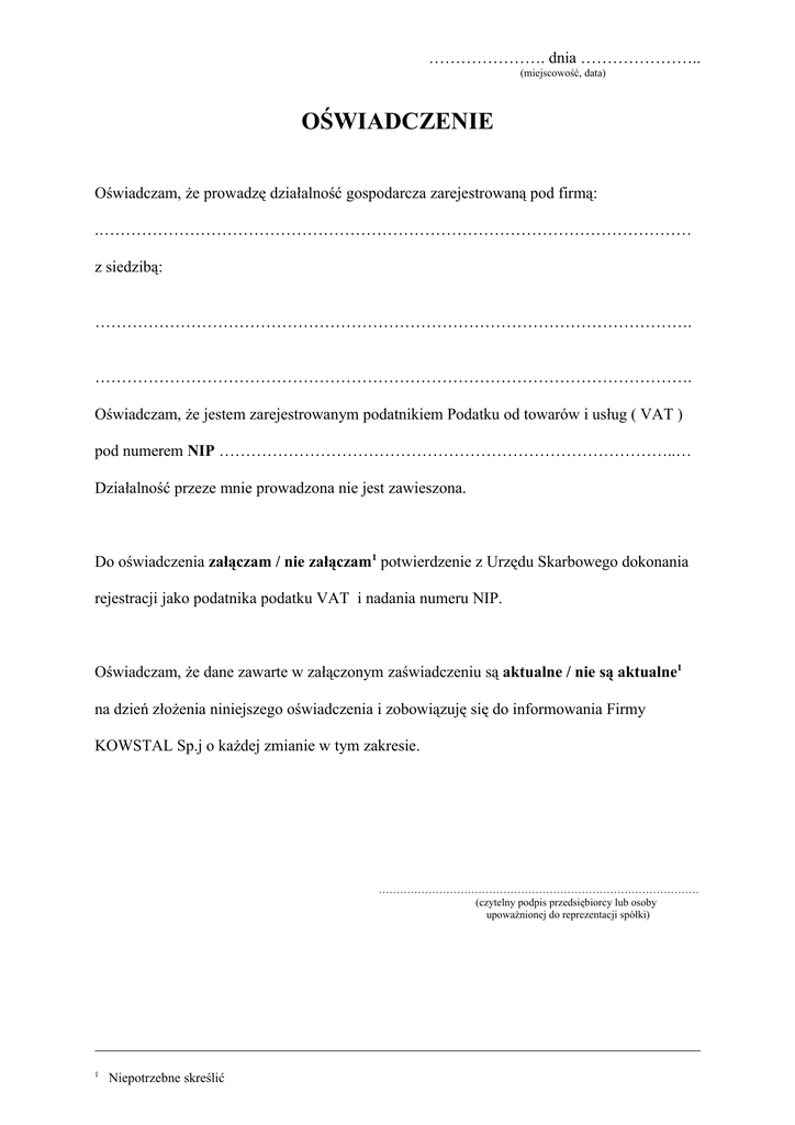 …………………. dnia ………………….. (miejscowość, data) OŚWIADCZENIE Oświadczam, że prowadzę działalność gospodarcza zarejestrowaną pod firmą: .………………………………………………………………………………………………… z siedzibą: …………………………………………………………………………………………………. …………………………………………………………………………………………………. Oświadczam, że jestem zarejestrowanym podatnikiem Podatku od towarów i usług ( VAT ) pod numerem NIP …………………………………………………………………………..… Działalność przeze mnie prowadzona nie jest zawieszona. Do oświadczenia załączam / nie załączam1 potwierdzenie z Urzędu Skarbowego dokonania rejestracji jako podatnika podatku VAT i nadania numeru NIP. Oświadczam, że dane zawarte w załączonym zaświadczeniu są aktualne / nie są aktualne1 na dzień złożenia niniejszego oświadczenia i zobowiązuję się do informowania Firmy KOWSTAL Sp.j o każdej zmianie w tym zakresie. ……………………………………………………………………………… (czytelny podpis przedsiębiorcy lub osoby upoważnionej do reprezentacji spółki) 1 Niepotrzebne skreślić