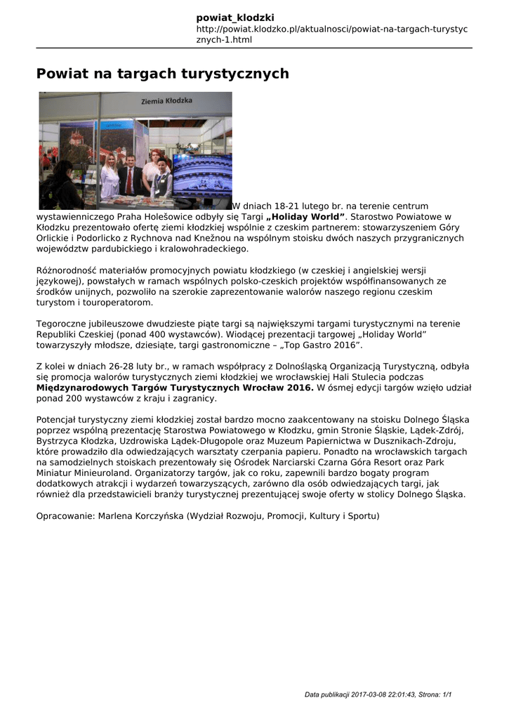 powiat_klodzki http://powiat.klodzko.pl/aktualnosci/powiat-na-targach-turystyc znych-1.html Powiat na targach turystycznych W dniach 18-21 lutego br. na terenie centrum wystawienniczego Praha Holešowice odbyły się Targi „Holiday World”. Starostwo Powiatowe w Kłodzku prezentowało ofertę ziemi kłodzkiej wspólnie z czeskim partnerem: stowarzyszeniem Góry Orlickie i Podorlicko z Rychnova nad Knežnou na wspólnym stoisku dwóch naszych przygranicznych województw pardubickiego i kralowohradeckiego. Różnorodność materiałów promocyjnych powiatu kłodzkiego (w czeskiej i angielskiej wersji językowej), powstałych w ramach wspólnych polsko-czeskich projektów współfinansowanych ze środków unijnych, pozwoliło na szerokie zaprezentowanie walorów naszego regionu czeskim turystom i touroperatorom. Tegoroczne jubileuszowe dwudzieste piąte targi są największymi targami turystycznymi na terenie Republiki Czeskiej (ponad 400 wystawców). Wiodącej prezentacji targowej „Holiday World” towarzyszyły młodsze, dziesiąte, targi gastronomiczne – „Top Gastro 2016”. Z kolei w dniach 26-28 luty br., w ramach współpracy z Dolnośląską Organizacją Turystyczną, odbyła się promocja walorów turystycznych ziemi kłodzkiej we wrocławskiej Hali Stulecia podczas Międzynarodowych Targów Turystycznych Wrocław 2016. W ósmej edycji targów wzięło udział ponad 200 wystawców z kraju i zagranicy. Potencjał turystyczny ziemi kłodzkiej został bardzo mocno zaakcentowany na stoisku Dolnego Śląska poprzez wspólną prezentację Starostwa Powiatowego w Kłodzku, gmin Stronie Śląskie, Lądek-Zdrój, Bystrzyca Kłodzka, Uzdrowiska Lądek-Długopole oraz Muzeum Papiernictwa w Dusznikach-Zdroju, które prowadziło dla odwiedzających warsztaty czerpania papieru. Ponadto na wrocławskich targach na samodzielnych stoiskach prezentowały się Ośrodek Narciarski Czarna Góra Resort oraz Park Miniatur Minieuroland. Organizatorzy targów, jak co roku, zapewnili bardzo bogaty program dodatkowych atrakcji i wydarzeń towarzyszących, zarówno dla osób odwiedzających targi, jak również dla przedstawicieli branży turystycznej prezentującej swoje oferty w stolicy Dolnego Śląska. Opracowanie: Marlena Korczyńska (Wydział Rozwoju, Promocji, Kultury i Sportu) Data publikacji 2017-03-08 22:01:43, Strona: 1/1