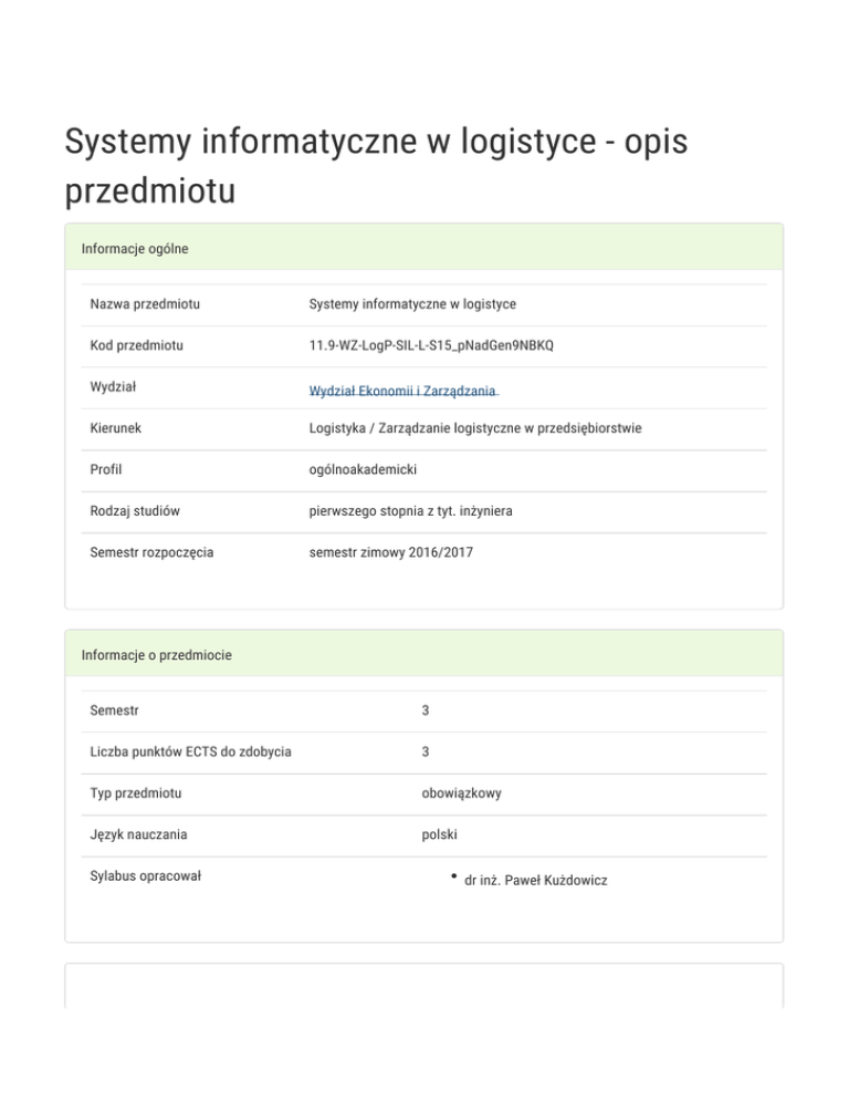 Systemy informatyczne w logistyce - opis przedmiotu Informacje ogólne Nazwa przedmiotu Systemy informatyczne w logistyce Kod przedmiotu 11.9-WZ-LogP-SIL-L-S15_pNadGen9NBKQ Wydział Wydział Ekonomii i Zarządzania Kierunek Logistyka / Zarządzanie logistyczne w przedsiębiorstwie Profil ogólnoakademicki Rodzaj studiów pierwszego stopnia z tyt. inżyniera Semestr rozpoczęcia semestr zimowy 2016/2017 Informacje o przedmiocie Semestr 3 Liczba punktów ECTS do zdobycia 3 Typ przedmiotu obowiązkowy Język nauczania polski Sylabus opracował dr inż. Paweł Kużdowicz Formy zajęć Forma zajęć Laboratorium Liczba godzin Liczba godzin Liczba godzin w Liczba godzin w Forma w semestrze w tygodniu semestrze tygodniu zaliczenia (stacjonarne) (stacjonarne) (niestacjonarne) (niestacjonarne) 30 2 18 1,2 Zaliczenie na ocenę Wykład 15 1 9 ,6 Zaliczenie na ocenę Cel przedmiotu Zapoznanie studenta ze zintegrowanymi systemami informatycznymi klasy ERP (ang. Enterprise Resource Planning) w sferze logistyki przedsiębiorstw produkcyjnych, kierunkami rozwoju tych systemów oraz metodami budowy ich wdrażania. Po ukończeniu zajęć student powinien umieć dokonać oceny oraz wyboru rozwiązania informatycznego wspierającego funkcjonowanie danej organizacji z uwzględnieniem najnowszych trendów z zakresu technologii i koncepcji wspomagania zarzadzania w sferze logistyki przedsiębiorstw produkcyjnych. Wymagania wstępne Podstawy logistyki, Zarządzanie łańcuchem dostaw, Rachunkowość i finanse. Zakres tematyczny Wykład: Wprowadzenie do systemów informacyjnych w organizacji; przegląd systemów informatycznych zarządzania, warunki ramowe wykorzystania systemów klasy ERP (Enterprise Resource Planning). Dane podstawowe i transakcyjne w systemie klasy ERP. Przepływy strumieni ilościowych i wartościowych – integracja logistyki i finansów (księgowości finansowej oraz rachunku kosztów). Wybór i wdrażanie systemu klasy ERP. Laboratorium: Typowy obieg dokumentów w przedsiębiorstwie produkcyjnym: oferta i zlecenie klienta, dyspozycja materiałowa i produkcyjna, zamówienie (do dostawcy), przyjęcie towaru, rejestracja i kontrola rachunków, realizacja zlecenia produkcyjnego: planowanie i harmonogramowane, dokument dostawy, faktura sprzedaży, zarządzanie płatnościami, prognoza płynności finansowej. Metody kształcenia Wykład: wykład z prezentacjami multimedialnymi, pokaz (prezentacja oprogramowania). Ćwiczenia laboratoryjne: w pracowni komputerowej, metoda projektu. Efekty kształcenia i metody weryfikacji osiągania efektów kształcenia Opis efektu Symbole Metody weryfikacji Forma zajęć efektów Student rozpoznaje i charakteryzuje K_W09 zaliczenie - ustne, różne klasy systemów informatycznych opisowe, testowe i wspomagających zarządzanie inne Wykład organizacją. Student jest otwarty na nowe nurty w K_K01 zaliczenie - ustne, wykorzystaniu narzędzi opisowe, testowe i informatycznych do wspomagania inne Wykład zarządzania przedsiębiorstwem. Wykorzystuje standardowe oprogramowanie (system klasy ERP) do realizacji typowego obiegu dokumentów w przedsiębiorstwie produkcyjnym. K_U08 przygotowanie projektu Laboratorium Opis efektu Prezentuje zasady integracji obszarów logistyki i finansów w zintegrowanym Symboleefektów K_U09 Metody weryfikacji Forma zajęć przygotowanie Laboratorium projektu systemie wspomagającym zarządzanie przedsiębiorstwem. Warunki zaliczenia Egzamin obejmuje problematykę systemów informatycznych wspomagających zarządzanie przedsiębiorstwem, ich cechy i rozróżnienie oraz korzyści ich stosowania (K_W09, K_K01). Egzamin jest w formie pisemnej. Zasady ustalania oceny końcowej: 0-10 pkt. „ndst”, 11-12 pkt. „dst”, 13-14 pkt. „dst+”, 15-16 pkt. „db”, 17-18 pkt. „db+”, 19-20 pkt. „bdb”. Na zajęciach laboratoryjnych wykorzystywane jest standardowe oprogramowanie do wspomagania zarządzania przedsiębiorstwem (system klasy ERP). W ramach zajęć studenci realizują poszczególne etapy projektu. Realizacja projektu obejmuje wykorzystanie oprogramowania do przeprowadzenia typowego obiegu dokumentów w przedsiębiorstwie produkcyjnym, a także analizy przepływów strumieni ilościowych oraz wartościowych. Ocena jest uzależniona od: poprawności wprowadzonych dokumentów (np. zlecenia klienta, rejestracji i kontroli rachunków) z uwzględnieniem różnego rodzaju danych w systemie klasy ERP (np. danych ogólnego zastosowania, danych i parametrów sterujących integracją, służących racjonalizacji czy przygotowaniu informacji) (K_U08) – 40% oceny końcowej, uwzględnienia zasad integracji w obszarze logistyki i finansów, z uwzględnieniem wygenerowanych księgowań (K_U09) – 40% oceny końcowej, aktywnego udziału w zajęciach (10% oceny końcowej) oraz systematycznej pracy studenta podczas całego semestru (10% oceny końcowej). Warunek zaliczenia zajęć laboratoryjnych: oddanie pracy zaliczeniowej (projektu) w postaci wydruku. Warunkiem przystąpienia do egzaminu jest pozytywna ocena z laboratorium. Na ocenę z przedmiotu składa się ocena z laboratorium (50%) i z egzaminu (50%). Warunkiem zaliczenia przedmiotu są pozytywne oceny z laboratorium i egzaminu. Obciążenie pracą Obciążenie pracą Studiastacjonarne Studia niestacjonarne (w godz.) (w godz.) Godziny kontaktowe (udział w zajęciach; konsultacjach; egzaminie, itp.) 51 34 Samodzielna praca studenta (przygotowanie do: zajęć, kolokwium, 39 56 Łącznie 90 90 Punkty ECTS Studia Studia niestacjonarne egzaminu; studiowanie literatury przygotowanie: pracy pisemnej, projektu, prezentacji, raportu, wystąpienia; itp.) stacjonarne Zajęcia z udziałem nauczyciela akademickiego 2 2 Zajęcia bez udziału nauczyciela akademickiego 1 1 Łącznie 3 3 Literatura podstawowa 1. Banaszak Z., Kłos S., Mleczko J., Zintegrowane systemy zarzadzania, PWE, Warszawa 2011. 2. Januszewski A., Funkcjonalność informatycznych systemów zarządzania, t. 1 i 2, Wydawnictwo Na