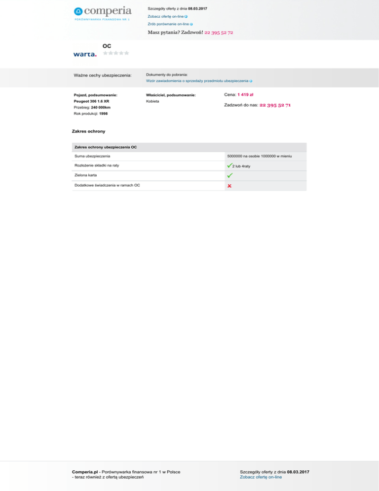 Szczegóły oferty z dnia 08.03.2017 Zobacz ofertę on-line Zrób porównanie on-line Masz pytania? Zadzwoń! 22 395 52 72 OC Ważne cechy ubezpieczenia: Dokumenty do pobrania: Wzór zawiadomienia o sprzedaży przedmiotu ubezpieczenia Pojazd, podsumowanie: Właściciel, podsumowanie: Peugeot 306 1.6 XR Kobieta Przebieg: 240 000km Cena: 1 419 zł Zadzwoń do nas: 22 395 52 71 Rok produkcji: 1998 Zakres ochrony Zakres ochrony ubezpieczenia OC Suma ubezpieczenia Rozłożenie składki na raty 5000000 na osobie 1000000 w mieniu 2 lub 4raty Zielona karta Dodatkowe świadczenia w ramach OC Comperia.pl - Porównywarka finansowa nr 1 w Polsce - teraz również z ofertą ubezpieczeń Powered by TCPDF (www.tcpdf.org) Szczegóły oferty z dnia 08.03.2017 Zobacz ofertę on-line