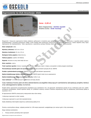 Informacje o produkcie Utworzono 08-03-2017 Zaproszenia na ślub Anastazja: złote Cena : 2,95 zł o" Stan magazynowy : bardzo wysoki Średnia ocena : brak recenzji ud i Eleganckie i klasyczne zaproszenie ślubne zdobione aplikacjami w kształcie pary gołąbków oraz serduszek. Wykonane z wysokiej jakości papieru wizytówkowego o wysokiej gramaturze (246g). Uroku dodają złote kwiatuszki umieszczone na satynowej wstążeczce. Całość dopełnia złoty napis: Zaproszenie lub Zawiadomienie. Takie zaproszenia z pewnością zachęcą Państwa Gości do przybycia na uroczystość. Kolor wstążeczki: złota Wymiary (złożone): 10,5 cm x 15 cm Wymiary (rozłożone): 21 cm z 15 cm Faktura papieru: Leather 134 (Skóra) Koperta: wliczona w cenę, kolor biały lub ecru Kolor wydruku: czarny St Dostępne kolory papieru: biały lub ecru. S- Treść wydruku (gratis): Imiona i nazwiska Pary Młodej, informacje o dacie i miejscu uroczystości a także przyjęcia weselnego Personalizacja nazwisk gości (na życzenie): 0,35zł / szt; dla zamówień powyżej 50 szt. GRATIS Prośba o potwierdzenie przybycia: GRATIS (umieszczana pod tekstem zaproszenia) "A Nadruk dodatkowego tekstu z prośbą o prezenty: GRATIS (jeżeli mieści się na zaproszeniu) Nadruk dodatkowego tekstu na osobnym bileciku: 0,40 zł / szt. Czas realizacji*: 2-10 dni roboczych (uzależnione od liczby zleceń). Czas realizacji liczony jest od dnia zatwierdzenia szczegółów dotyczących zamówienia (akceptacja projektu tekstu) oraz zaksięgowania wpłaty na koncie. Projekt tekstu zaproszenia przygotowujemy bezpłatnie przy zamówieniu min. 10 zaproszeń. Zamówienia poniżej 10 szt. traktujemy jako tzw. próbkidrukujemy przykładowe, losowo wybrane teksty. W "próbkach możemy umieścić Państwa indywidualny tekst za dodatkową, jednorazową opłatą w wysokości 10 zł. W zaproszeniach GRATIS umieszczamy maksymalnie dwa różne teksty: 1 dotyczące zaproszeń na ślub i wesele, 2 dotyczące zaproszeń na sam ślub (zawiadomienia). Każdy dodatkowy tekst będzie wiązał się z jednorazową opłatą 10 zł. Prosimy o przemyślane zakupy najlepiej zamówić ok. 10% więcej zaproszeń, uwzględniając tym samym gości z listy rezerwowej. Etapy realizacji zamówienia: 1. Proszę zamówić potrzebną ilość zaproszeń Wygenerowano w programie www.oscGold.com 2. Prosimy o zapoznanie się z wzornikiem (w zakładce "Linki" na karcie produktu - "Kliknij aby pobrać specyfikację produktu PDF") oraz wybór: a. Wzoru czcionki użytej do wydruku tekstu zaproszenia b. Wzoru czcionki użytej do wydruku imion i nazwisk Pary Młodej (jeżeli inna niż użyta do tekstu zaproszenia) c. Tekstu zaproszenia d. Cytatu / sentencji e. Wierszyka z prośbą o prezenty (na życzenie) 3. Do 24h prześlemy formularz zamówienia (czas ten może ulec wydłużeniu jeżeli zamówienie zostało złożone w dniu wolnym od pracy) 4. Należy uzupełnić i odesłać "Formularz zamówienia", w którym znajdują się wszystkie niezbędne informacje potrzebne do sporządzenia projektu. Jeżeli decydują się Państwo na personalizację nazwisk gości prosimy o przesłanie kompletnej listy gości. Lista gości powinna zawierać wypunktowane i odmienione imiona i nazwiska gości tak by pasowały do formy gramatycznej treści zaproszenia np. 1) Janinę i Karola Nowickich 2) Katarzynę i Mariusza Dobrowolskich z dziećmi 3) Lucjana Martyniuka z osobą towarzyszącą Zalecamy zapisywanie listy gości w pliku w formacie .pdf. Na podstawie otrzymanego "Formularza zamówień" wykonujemy projekt tekstu a następnie przesyłamy go Państwu do wglądu w formacie .pdf (do 2 dni roboczych) ud i 6. o" 5. 7. Czekamy na informację od Państwa czy projekt został zaakceptowany czy też wymaga wprowadzenia poprawek 8. Po akceptacji projektu oraz zaksięgowaniu wpłaty należności przystępujemy do pracy "A S- St Wysyłkę zamówionych produktów potwierdzamy e-mailem bądź telefonicznie.