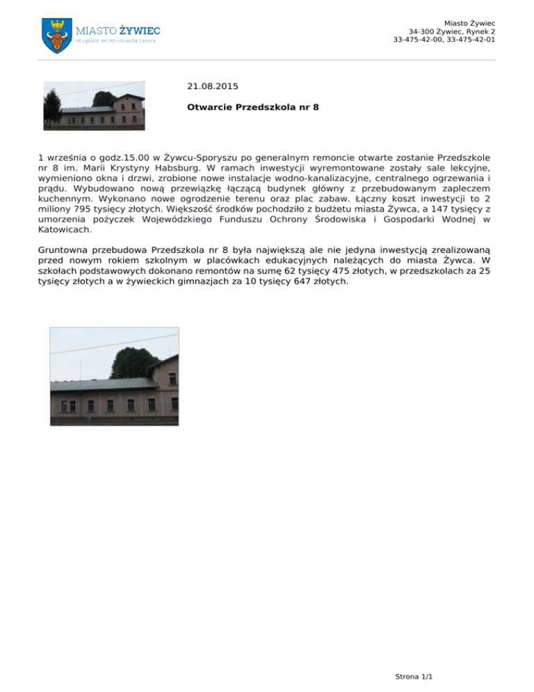 Miasto Żywiec 34-300 Żywiec, Rynek 2 33-475-42-00, 33-475-42-01 21.08.2015 Otwarcie Przedszkola nr 8 1 września o godz.15.00 w Żywcu-Sporyszu po generalnym remoncie otwarte zostanie Przedszkole nr 8 im. Marii Krystyny Habsburg. W ramach inwestycji wyremontowane zostały sale lekcyjne, wymieniono okna i drzwi, zrobione nowe instalacje wodno-kanalizacyjne, centralnego ogrzewania i prądu. Wybudowano nową przewiązkę łączącą budynek główny z przebudowanym zapleczem kuchennym. Wykonano nowe ogrodzenie terenu oraz plac zabaw. Łączny koszt inwestycji to 2 miliony 795 tysięcy złotych. Większość środków pochodziło z budżetu miasta Żywca, a 147 tysięcy z umorzenia pożyczek Wojewódzkiego Funduszu Ochrony Środowiska i Gospodarki Wodnej w Katowicach. Gruntowna przebudowa Przedszkola nr 8 była największą ale nie jedyna inwestycją zrealizowaną przed nowym rokiem szkolnym w placówkach edukacyjnych należących do miasta Żywca. W szkołach podstawowych dokonano remontów na sumę 62 tysięcy 475 złotych, w przedszkolach za 25 tysięcy złotych a w żywieckich gimnazjach za 10 tysięcy 647 złotych. Strona 1/1 Powered by TCPDF (www.tcpdf.org)
