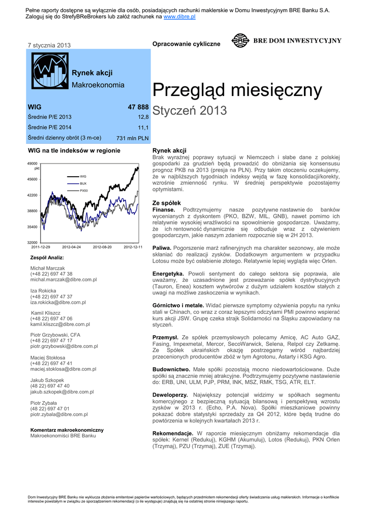 Pełne raporty dostępne są wyłącznie dla osób, posiadających rachunki maklerskie w Domu Inwestycyjnym BRE Banku S.A. Zaloguj się do StrefyBReBrokers lub załóż rachunek na www.dibre.pl Przegląd miesięczny BRE Bank Securities BRE Bank Securities Opracowanie cykliczne 7 stycznia 2013 Rynek akcji Makroekonomia WIG Przegląd miesięczny 47 888 Średnie P/E 2013 12,8 Średnie P/E 2014 11,1 Średni dzienny obrót (3 m-ce) 731 mln PLN WIG na tle indeksów w regionie Rynek akcji Brak wyraźnej poprawy sytuacji w Niemczech i słabe dane z polskiej gospodarki za grudzień będą prowadzić do obniżania się konsensusu prognoz PKB na 2013 (presja na PLN). Przy takim otoczeniu oczekujemy, że w najbliższych tygodniach indeksy wejdą w fazę konsolidacji/korekty, wzrośnie zmienność rynku. W średniej perspektywie pozostajemy optymistami. 49000 pkt WIG 45600 Styczeń 2013 BUX PX50 42200 Ze spółek Finanse. Podtrzymujemy nasze pozytywne nastawnie do banków wycenianych z dyskontem (PKO, BZW, MIL, GNB), nawet pomimo ich relatywnie wysokiej wrażliwości na spowolnienie gospodarcze. Uważamy, że ich rentowność dynamicznie się odbuduje wraz z ożywieniem gospodarczym, jakie naszym zdaniem rozpocznie się w 2H 2013. 38800 35400 32000 2011-12-29 2012-04-24 2012-08-20 Zespół Analiz: Michał Marczak (+48 22) 697 47 38 [email protected] Iza Rokicka (+48 22) 697 47 37 [email protected] Kamil Kliszcz (+48 22) 697 47 06 [email protected] Piotr Grzybowski, CFA (+48 22) 697 47 17 [email protected] Maciej Stokłosa (+48 22) 697 47 41 [email protected] Jakub Szkopek (48 22) 697 47 40 [email protected] Piotr Zybała (48 22) 697 47 01 [email protected] Komentarz makroekonomiczny Makroekonomiści BRE Banku 2012-12-11 Paliwa. Pogorszenie marż rafineryjnych ma charakter sezonowy, ale może skłaniać do realizacji zysków. Dodatkowym argumentem w przypadku Lotosu może być osłabienie złotego. Relatywnie lepiej wygląda więc Orlen. Energetyka. Powoli sentyment do całego sektora się poprawia, ale uważamy, że uzasadnione jest przeważanie spółek dystrybucyjnych (Tauron, Enea) kosztem wytwórców z dużym udziałem kosztów stałych z uwagi na możliwe zaskoczenia w wynikach. Górnictwo i metale. Widać pierwsze symptomy ożywienia popytu na rynku stali w Chinach, co wraz z coraz lepszymi odczytami PMI powinno wspierać kurs akcji JSW. Grupę czeka strajk Solidarności na Śląsku zapowiadany na styczeń. Przemysł. Ze spółek przemysłowych polecamy Amicę, AC Auto GAZ, Fasing, Impexmetal, Mercor, SecoWarwick, Selena, Relpol czy Zetkamę. Ze Spółek ukraińskich okazję postrzegamy wśród najbardziej przecenionych producentów zbóż w tym Agrotonu, Astarty i KSG Agro. Budownictwo. Małe spółki pozostają mocno niedowartościowane. Duże spółki są znacznie mniej atrakcyjne. Podtrzymujemy pozytywne nastawienie do: ERB, UNI, ULM, PJP, PRM, INK, MSZ, RMK, TSG, ATR, ELT. Deweloperzy. Największy potencjał widzimy w spółkach segmentu komercyjnego z bezpieczną sytuacją bilansową i perspektywą wzrostu zysków w 2013 r. (Echo, P.A. Nova). Spółki mieszkaniowe powinny pokazać dobre statystyki sprzedaży za Q4 2012, które będą trudne do powtórzenia w kolejnych kwartałach 2013 r. Rekomendacje. W raporcie miesięcznym obniżamy rekomendacje dla spółek: Kernel (Redukuj), KGHM (Akumuluj), Lotos (Redukuj), PKN Orlen (Trzymaj), PZU (Trzymaj), ZUE (Trzymaj). Dom Inwestycyjny BRE Banku nie wyklucza złożenia emitentowi papierów wartościowych, będących przedmiotem rekomendacji oferty świadczenia usług maklerskich. Informacje o konflikcie 7 stycznia 2013 interesów powstałym w związku ze sporządzeniem rekomendacji (o ile występuje) znajdują się na ostatniej stronie niniejszego raportu. Przegląd miesięczny BRE Bank Securities Rynek akcji Grudzień był bardzo udanym miesiącem dla inwestorów posiadających akcje spółek europejskich oraz krajów azjatyckich, ze szczególnym uwzględnieniem – dotychczas słabego - rynku chińskiego. Spośród głównych giełd jedynie rynek amerykański nie zaliczył wyraźnych wzrostów, co można tłumaczyć niepewnością i oczekiwaniem inwestorów na finalizację negocjacji ws. zacieśnienia fiskalnego. To pojawiło się w ostatniej chwili i pozwoliło rynkom na dalsze wzrosty na początku stycznia. Czy jednak nie zbyt optymistycznie? Porozumienie demokratów i republikanów odkłada problem na dwa miesiące. Przed nami tygodnie, w których toczyć się będzie debata, która jak pokazał grudzień nie będzie pomagała rynkowi amerykańskiemu. W Polsce, po październiku i listopadzie kiedy liczba dni roboczych była wyższa niż przed rokiem, dane makro nie zachwycały, ale również mocno nie rozczarowały. W grudniu 2012 liczba dni roboczych była niższa o 2 (r/r), co powinno skutkować słabymi danymi przed odsezonowaniem. To, wraz z brakiem wyraźnej poprawy sytuacji w Niemczech powinno prowadzić do obniżania się konsensusu prognoz PKB na 2013. Przy takim otoczeniu oczekujemy, że w najbliższych tygodniach indeksy wejdą w fazę konsolidacji/korekty, wzrośnie zmienność rynku. W średniej perspektywie pozostajemy optymistami. Pozytywny wpływ na indeksy będzie mieć napływ oszczędności do funduszy akcyjnych zarówno w skali globalnej jak również w Polsce. W najbliższych tygodniach banki wyraźnie obniża oprocentowanie lokat, co przyspieszy ten proces. Fiscal cliff rozwiązany zdeterminuje zachowania inwestorów, problem nadal nie Zgodnie z oczekiwaniami republikanie i demokraci porozumieli się przed końcem roku ws. zacieśnienia fiskalnego, przy czym forma porozumienia (w głównie mierze przesunięcie automatycznego cięcia wydatków o dwa miesiące) nie niweluje czynnika niepewności. To z kolei może nadal blokować firmy przed inwestycjami. Oczekiwane przez nas odreagowanie ISM po tym jak przedsiębiorcy poznają w jakim otoczeniu będą funkcjonować powinno również przesuną się w czasie. Osiągnięty k