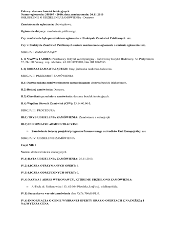 Puławy: dostawa butelek iniekcyjnych Numer ogłoszenia: 338007 - 2010; data zamieszczenia: 26.11.2010 OGŁOSZENIE O UDZIELENIU ZAMÓWIENIA - Dostawy Zamieszczanie ogłoszenia: obowiązkowe. Ogłoszenie dotyczy: zamówienia publicznego. Czy zamówienie było przedmiotem ogłoszenia w Biuletynie Zamówień Publicznych: nie. Czy w Biuletynie Zamówień Publicznych zostało zamieszczone ogłoszenie o zmianie ogłoszenia: nie. SEKCJA I: ZAMAWIAJĄCY I. 1) NAZWA I ADRES: Państwowy Instytut Weterynaryjny - Państwowy Instytut Badawczy, Al. Partyzantów 57, 24-100 Puławy, woj. lubelskie, tel. 081 8893000, faks 081 8862595. I. 2) RODZAJ ZAMAWIAJĄCEGO: Inny: jednostka naukowo-badawcza. SEKCJA II: PRZEDMIOT ZAMÓWIENIA II.1) Nazwa nadana zamówieniu przez zamawiającego: dostawa butelek iniekcyjnych. II.2) Rodzaj zamówienia: Dostawy. II.3) Określenie przedmiotu zamówienia: dostawa butelek iniekcyjnych. II.4) Wspólny Słownik Zamówień (CPV): 33.14.00.00-3. SEKCJA III: PROCEDURA III.1) TRYB UDZIELENIA ZAMÓWIENIA: Zamówienie z wolnej ręki III.2) INFORMACJE ADMINISTRACYJNE • Zamówienie dotyczy projektu/programu finansowanego ze środków Unii Europejskiej: nie SEKCJA IV: UDZIELENIE ZAMÓWIENIA Część NR: 1 Nazwa: dostawa butelek iniekcyjnych IV.1) DATA UDZIELENIA ZAMÓWIENIA: 26.11.2010. IV.2) LICZBA OTRZYMANYCH OFERT: 1. IV.3) LICZBA ODRZUCONYCH OFERT: 0. IV.4) NAZWA I ADRES WYKONAWCY, KTÓREMU UDZIELONO ZAMÓWIENIA: • A-Tech, ul. Fabianowska 113, 62-064 Plewiska, kraj/woj. wielkopolskie. IV.5) Szacunkowa wartość zamówienia (bez VAT): 700,00 PLN. IV.6) INFORMACJA O CENIE WYBRANEJ OFERTY ORAZ O OFERTACH Z NAJNIśSZĄ I NAJWYśSZĄ CENĄ • • • Cena wybranej oferty: 762,40 Oferta z najniŜszą ceną: 762,40 / Oferta z najwyŜszą ceną: 762,40 Waluta: PLN. ZAŁĄCZNIK I Uzasadnienie udzielenia zamówienia w trybie negocjacji bez ogłoszenia, zamówienia z wolnej ręki albo zapytania o cenę • 1. Podstawa prawna Postępowanie prowadzone jest w trybie zamówienie z wolnej ręki na podstawie art. 67 ust. 1 pkt 4 ustawy z dnia 29 stycznia 2004r. - Prawo zamówień publicznych. • 2. Uzasadnienia wyboru trybu NaleŜy podać uzasadnienie faktyczne i prawne wyboru trybu oraz wyjaśnić, dlaczego udzielenie zamówienia jest zgodne z przepisami. Zgodnie z art. 67 ust. 1 pkt 4 Zamawiający moŜe udzielić zamówienia z wolnej ręki, jeŜeli w prowadzonych kolejno postępowaniach o udzielenie zamówienia, z których co najmniej jedno prowadzone było w trybie przetargu nieograniczonego albo przetargu ograniczonego, nie zostały złoŜone Ŝadne oferty, a pierwotne warunki zamówienia nie zostały w istotny sposób zmienione. PowyŜsze przesłanki wyczerpuje procedura zakupu butelek iniekcyjnych. W prowadzonych kolejno postępowaniach w trybie przetargu nieograniczonego nie wpłynęła Ŝadna oferta na dostawę butelek.