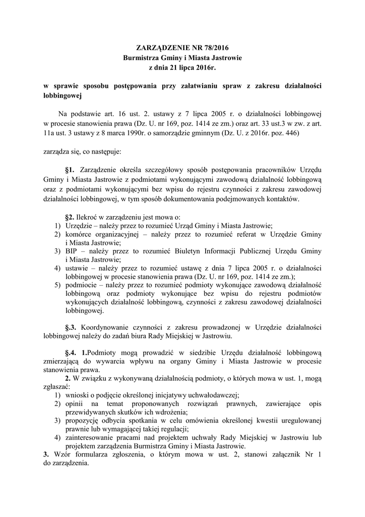 ZARZĄDZENIE NR 78/2016 Burmistrza Gminy i Miasta Jastrowie z dnia 21 lipca 2016r. w sprawie sposobu postępowania przy załatwianiu spraw z zakresu działalności lobbingowej Na podstawie art. 16 ust. 2. ustawy z 7 lipca 2005 r. o działalności lobbingowej w procesie stanowienia prawa (Dz. U. nr 169, poz. 1414 ze zm.) oraz art. 33 ust.3 w zw. z art. 11a ust. 3 ustawy z 8 marca 1990r. o samorządzie gminnym (Dz. U. z 2016r. poz. 446) zarządza się, co następuje: §1. Zarządzenie określa szczegółowy sposób postępowania pracowników Urzędu Gminy i Miasta Jastrowie z podmiotami wykonującymi zawodową działalność lobbingową oraz z podmiotami wykonującymi bez wpisu do rejestru czynności z zakresu zawodowej działalności lobbingowej, w tym sposób dokumentowania podejmowanych kontaktów. §2. Ilekroć w zarządzeniu jest mowa o: 1) Urzędzie – należy przez to rozumieć Urząd Gminy i Miasta Jastrowie; 2) komórce organizacyjnej – należy przez to rozumieć referat w Urzędzie Gminy i Miasta Jastrowie; 3) BIP – należy przez to rozumieć Biuletyn Informacji Publicznej Urzędu Gminy i Miasta Jastrowie; 4) ustawie – należy przez to rozumieć ustawę z dnia 7 lipca 2005 r. o działalności lobbingowej w procesie stanowienia prawa (Dz. U. nr 169, poz. 1414 ze zm.); 5) podmiocie – należy przez to rozumieć podmioty wykonujące zawodową działalność lobbingową oraz podmioty wykonujące bez wpisu do rejestru podmiotów wykonujących działalność lobbingową, czynności z zakresu zawodowej działalności lobbingowej. §.3. Koordynowanie czynności z zakresu prowadzonej w Urzędzie działalności lobbingowej należy do zadań biura Rady Miejskiej w Jastrowiu. §.4. 1.Podmioty mogą prowadzić w siedzibie Urzędu działalność lobbingową zmierzającą do wywarcia wpływu na organy Gminy i Miasta Jastrowie w procesie stanowienia prawa. 2. W związku z wykonywaną działalnością podmioty, o których mowa w ust. 1, mogą zgłaszać: 1) wnioski o podjęcie określonej inicjatywy uchwałodawczej; 2) opinii na temat proponowanych rozwiązań prawnych, zawierające opis przewidywanych skutków ich wdrożenia; 3) propozycję odbycia spotkania w celu omówienia określonej kwestii uregulowanej prawnie lub wymagającej takiej regulacji; 4) zainteresowanie pracami nad projektem uchwały Rady Miejskiej w Jastrowiu lub projektem zarządzenia Burmistrza Gminy i Miasta Jastrowie. 3. Wzór formularza zgłoszenia, o którym mowa w ust. 2, stanowi załącznik Nr 1 do zarządzenia. §.5. 1. Wpływające do Urzędu zgłoszenie, o którym mowa w §4 ust. 2 i 3, przekazywane jest niezwłocznie do Biura Rady Miejskiej w Jastrowiu. 2. Po otrzymaniu zgłoszenia pracownik ds. obsługi biura Rady Miejskiej w Jastrowiu podejmuje następujące czynności: 1) rejestruje zgłoszenie w ewidencji, o której mowa w §8; 2) sprawdza poprawność wypełnienia formularza zgłoszenia oraz załączniki, w tym dołączenie zaświadczenia lub oświadczenia o wpisie do rejestru podmiotów wykonujących zawodową działalność lobbingową oraz pisemnego oświadczenia zawierającego wskazanie podmiotów, na rzecz których zawodowa działalność lobbingowa jest wykonywana; 3) wzywa podmiot jeśli stwierdzi braki formalne zgłoszenia lub niedołączenie któregokolwiek z wymaganych załączników, o których mowa w pkt 2, do uzupełnienia braków, wyznaczając podmiotowi termin nie dłuższy niż 7 dni. Nieuzupełnienie braków w wyznaczonym terminie przyjmuje się za rezygnację podmiotu ze zgłoszenia; 4) weryfikuje, czy podmiot, który wniósł zgłoszenie, jest wpisany do rejestru podmiotów wykonujących zawodową działalność lobbingową, prowadzonego przez ministra właściwego do spraw administracji publicznej, zgodnie z art. 10 ustawy; 5) bada zgłoszenie z punktu widzenia właściwości organów Gminy i Miasta Jastrowie i jeśli uzna taką właściwość przekazuje zgłoszenie pracownikowi właściwej merytorycznie komórki organizacyjnej w celu jego rozpatrzenia, w przypadku stwierdzenia braku właściwości zawiadamia o tym podmiot, który wniósł zgłoszenie; 6) zamieszcza treść zgłoszenia w BIP, za wskazaniem podmiotu od którego pochodzi oraz nazwy podmiotu, na rzecz którego jest ono realizowane, z wyjątkiem adresów osób fizycznych. 3. W przypadku stwierdzenia wykonywania czynności wchodzących w zakres zawodowej działalności lobbingowej przez podmiot niewpisany do rejestru, o którym mowa w art. 10 ustawy, pracownik ds. obsługi biura Rady Miejskiej przygotowuje projekt pisma informującego o tym ministra właściwego do spraw administracji publicznej. §.6. 1. Komórki organizacyjne rozpatrują zgłoszenia podmiotów zgodnie z właściwością rzeczową wynikającą z Regulaminu organizacyjnego Urzędu Gminy i Miasta Jastrowie. 2. Pracownik właściwej komórki organizacyjnej, któremu przekazano do załatwienia zgłoszenie podmiotu, w uzgodnieniu z kierownikiem nadzorującym pracę tej komórki: 1) przygotowuje projekt odpowiedzi na zgłoszenie; 2) wyznacza, w razie potrzeby, termin spotkanie w celu omówienia zagadnień zawartych w zgłoszeniu. 3. Projekt odpowiedzi, o którym mowa w ust. 2 pkt 1, opiniuje pod względem prawnym radca prawny Urzędu a podpisuje Burmistrz Gminy i Miasta Jastrowie lub osoba przez niego upoważniona. Kopia udzielonej odpowiedzi przekazywana jest do pracownika ds. obsługi biura Rady Miejskiej w Jastrowiu. 4. Przebieg spotkania, o którym w ust. 2 pkt 2, wyznaczony pracownik komórki organizacyjnej dokumentuje w formie notatki służbowej, zawierającej w szczególności. 1) datę spotkania; 2) temat spotkania; 3) dane podmiot wykonującego działalność lobbingową; 4) imiona i nazwiska oraz stanowiska pracowników Urzędu, biorących udział w spotkaniu; 5) informację o przebiegu spotkania; 6) podpis pracownika sporządzającego notatkę. 5. Właściwa merytorycznie komórka organizacyjna obowiązana jest zawrzeć w uzasadnieniu do projektu uc