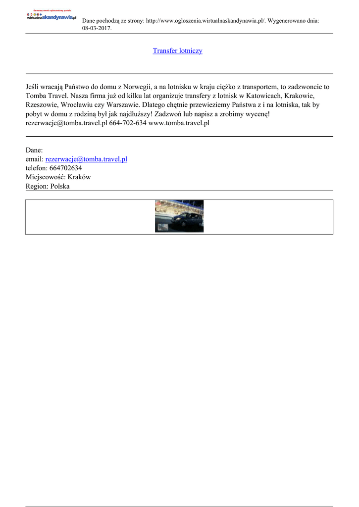Dane pochodzą ze strony: http://www.ogloszenia.wirtualnaskandynawia.pl/. Wygenerowano dnia: 08-03-2017. Transfer lotniczy Jeśli wracają Państwo do domu z Norwegii, a na lotnisku w kraju ciężko z transportem, to zadzwoncie to Tomba Travel. Nasza firma już od kilku lat organizuje transfery z lotnisk w Katowicach, Krakowie, Rzeszowie, Wrocławiu czy Warszawie. Dlatego chętnie przewieziemy Państwa z i na lotniska, tak by pobyt w domu z rodziną był jak najdłuższy! Zadzwoń lub napisz a zrobimy wycenę! [email protected] 664-702-634 www.tomba.travel.pl Dane: email: [email protected] telefon: 664702634 Miejscowość: Kraków Region: Polska