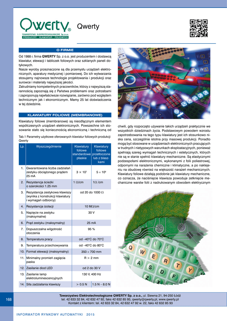 Qwerty O FIRMIE Od 1988 r. firma QWERTY Sp. z o.o. jest producentem i dostawcą klawiatur, elewacji i tabliczek foliowych oraz szklanych paneli dotykowych. Nasze wyroby przeznaczone są dla przemysłu urządzeń elektronicznych, aparatury medycznej i pomiarowej. Do ich wytwarzania stosujemy najnowsze technologie projektowania i produkcji oraz surowce i materiały najwyższej jakości. Zatrudniamy kompetentnych pracowników, którzy z najwyższą starannością zapoznają się z Państwa problemami oraz potrzebami i zaproponują najwłaściwsze rozwiązanie, zarówno pod względem technicznym jak i ekonomicznym. Mamy 25 lat doświadczenia w tej dziedzinie. KLAWIATURY FOLIOWE (MEMBRANOWE) Klawiatury foliowe (membranowe) są nieodłącznym elementem współczesnych urządzeń elektronicznych. Powszechne ich stosowanie stało się koniecznością ekonomiczną i techniczną od Tab.1 Parametry użytkowe oferowanych klawiatur foliowych produkcji Qwerty Lp. Wyszczególnienie 1. Gwarantowana liczba zadziałań zestyku obciążonego prądem 25 mA Klawiatury Klawiatury foliowe foliowe standardowe przetłoczone płaskie lub z blaszkami 5 × 106 3 × 107 1 Ω/cm 2. Rezystancja ścieżki o szerokości 1.25 mm 3. Rezystancja zestykowa klawiszy (wynika z konstrukcji klawiatury i wymagań odbiorcy) 1Ω /cm od 20 do 1000 Ω 4. Rezystancja izolacji 10 MΩ/cm 5. Napięcie na zestyku (maksymalne) 30 V 6. Prąd zestyku (maksymalny) 25 mA 7. Dopuszczalna wilgotność otoczenia 95 % 8. Temperatura pracy od –40°C do 70°C 9. Temperatura przechowywania od –40°C do 80°C 10. Format elewacji (maksymalny) 350 × 700 mm 11. Minimalny promień zagięcia paska 168 R > 2 mm 12. Zasilanie diod LED od 2 do 30 V 13. Zasilanie lamp elektroluminescencyjnych 130 V, 400 Hz 14. Siła zadziałania klawiszy chwili, gdy rozpoczęto używanie takich urządzeń praktycznie we wszystkich dziedzinach życia. Podstawowym powodem wzrostu zapotrzebowania na tego typu klawiatury jest ich stosunkowo niska cena, szczególnie istotna przy masowej produkcji. Ponadto mogą być stosowane w urządzeniach elektronicznych pracujących w trudnych i nietypowych warunkach eksploatacyjnych, ponieważ spełniają szereg wymagań technicznych i estetycznych, których nie są w stanie spełnić klawiatury mechaniczne. Są elastycznymi podzespołami elektronicznymi, wykonanymi z folii poliestrowej, odpornymi na narażenia chemiczne i klimatyczne, a po naklejeniu na obudowę również na większość narażeń mechanicznych. Klawiatury foliowe działają podobnie jak klawiatury mechaniczne, co oznacza, że naciśnięcie klawisza powoduje zetknięcie mechaniczne warstw folii z nadrukowanym obwodem elektrycznym > 0.5 N 1.5 N – 8.0 N Towarzystwo Elektrotechnologiczne QWERTY Sp. z o.o., ul. Siewna 21, 94-250 Łódź tel. 42 633 32 84, 42 632 47 92, faks 42 632 85 93, [email protected], www.qwerty.pl Kontakt z klientem: tel. 42 633 32 84, 42 632 47 92 w. 22, faks 42 632 85 93 I N F O R M AT O R R Y N KO W Y AU T O M AT Y K I 2015 i jego galwaniczne zwarcie. Grafika elewacji jest nadrukowana na spodniej stronie folii frontowej i w związku z tym jest całkowicie odporna na zniszczenie mechaniczne. Ze względu na zastosowanie technologii druku cyfrowego, jej forma ograniczona jest jedynie wyobraźnią zamawiającego. Ponadto klawiatura zawiera zestyki foliowe i zintegrowane diody LED, co umożliwia jej w pełni funkcjonalne sterowanie elektroniką bez konieczności współpracy z dodatkowymi wyświetlaczami lub panelami LCD. Ścieżki połączeń elektrycznych drukowane są lakierem przewodzącym prąd elektryczny. Opisany sposób produkcji umożliwia wykonanie klawiatury z dowolną grafiką i połączeniami elektrycznymi zaprojektowanymi na indywidualne życzenie klienta. SZKLANE PANELE DOTYKOWE We współczesnych sterownikach elektronicznych, modnym i nowoczesnym rozwiązaniem jest zastosowane szklanej elewacji frontowej połączonej z pojemnościowym panelem sterującym. Elewacja frontowa wykonana ze szkła jest odporna na działanie czynników chemicznych i klimatycznych. Może być bardzo elegancTab.2 Porównanie klawiatur foliowych wykonanych sitodrukowo i drukiem cyfrowym Lp. Wyszczególnienie 1. Szerokość linii graficznych Klawiatury foliowe wykonane sitodrukiem Klawiatury foliowe wykonane drukiem cyfrowym > 0.3 mm > 0.2 mm 2. Dokładność druku zgodnie z ISO 2768-1 < 120 mm od 120 do 400 mm > 400 mm 3. Dopuszczalne odchylenie równomierności linii 4. Gładkość powierzchni poza przetłoczeniami 5. Krycie kolorem ± 0.15 ± 0.20 ± 0.30 < 10% < 5% Gładkie na całej powierzchni z wyjątkiem miejsca wyprowadzenia paska Wystarczające, jeżeli niewidoczne są warstwy poniżej 6. Odwzorowanie koloru 7. Zanieczyszczenie – wielkość maksymalna ΔE 3 ΔE 6 0.25 mm2 0.25 mm2 8. Odległość pomiędzy zanieczyszczeniami minimalna 50 mm 9. Zanieczyszczenia w okienkach < 1 dm2 1 10. Zanieczyszczenia w okienkach 1 dm2 OFEROWANE PRODUKTY I USŁUGI Podzespoły elektromechaniczne: klawiatury foliowe, szklane panele dotykowe. Różne akcesoria elektroniczne: elewacje i tabliczki foliowe, płyty podkładowe z tworzyw sztucznych i metalu. OBSŁUGA KLIENTÓW 2 / dcm2 11. Nachodzenie na siebie kolorów (zalewki) Z powodów technologicznych zjawisko takie jest konieczne i dopuszczalne. 12. Kolory (bez ograniczeń) RAL, PANTONE 13. Forma graficzna ka, a wykonana z odpowiedniej jakości materiału, będzie również odporna na zadrapania i inne narażenia mechaniczne. Grafika jest nadrukowywana na spodniej stronie płyty szklanej. Jej forma ograniczona jest jedynie wyobraźnią zamawiającego, a ze względu na sposób nadruku, jest całkowicie odporna na zniszczenie mechaniczne. Integralną częścią takiego panelu jest ekran dotykowy, który zastępuje klawisze i umożliwia adaptacyjne sterowanie elektroniką urządzenia. Moduł panelu pojemnościowego w postaci cienkiej przeźroczystej warstwy, służącej do kontaktowania się z palcem, jest zakończony el