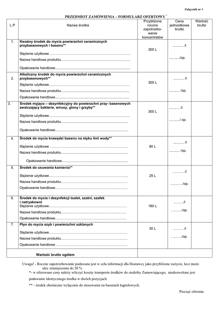 Załącznik nr 1 PRZEDMIOT ZAMÓWIENIA – FORMULARZ OFERTOWY * L.P 1. Nazwa środka PrzybliŜone roczne zapotrzebowanie koncentratów Kwaśny środek do mycia powierzchni ceramicznych przybasenowych i basenu** Cena jednostkowa brutto Wartość brutto ........... /l 300 L StęŜenie uŜytkowe …………………………………………………………… .........../op. Nazwa handlowa produktu....................................................................... Opakowanie handlowe............................................................................. 2. Alkaliczny środek do mycia powierzchni ceramicznych przybasenowych** StęŜenie uŜytkowe…………………………………………………………… ........... /l 300 L ........... /op. Nazwa handlowa produktu...................................................................... Opakowanie handlowe............................................................................ Środek myjąco – dezynfekcyjny do powierzchni przy- basenowych zwalczający bakterie, wirusy, glony i grzyby** 3. ........... /l 300 L StęŜenie uŜytkowe…………………………………………………………… .........../ op. Nazwa handlowa produktu..................................................................... Opakowanie handlowe........................................................................... 4. Środek do mycia krawędzi basenu na styku linii wody** ........... /l StęŜenie uŜytkowe …………………………………………………………. 80 L ........... /op. Nazwa handlowa produktu..................................................................... Opakowanie handlowe.................................................................... 5. Środek do usuwania kamienia** ………../l StęŜenie uŜytkowe………………………………………………………….. 25 L Nazwa handlowa produktu………………………………………………… …..……/op. Opakowanie handlowe…………………………………………………….. 6. Środek do mycia i dezynfekcji toalet, szatni, szafek i natryskowni StęŜenie uŜytkowe…………………………………………………………. .……../l 180 L ………/op. Nazwa handlowa produktu……………………………………………….. Opakowanie handlowe……………………………………………………. 7. Płyn do mycia szyb i powierzchni szklanych 30 L ………./l StęŜenie uŜytkowe…………………………………………………………. Nazwa handlowa produktu………………………………………………… ………/op. Opakowanie handlowe ……………………………………………………. Wartość brutto ogółem Uwaga! - Roczne zapotrzebowanie podawane jest w celu informacji dla Dostawcy jako przybliŜone zuŜycie, lecz moŜe ulec zmniejszeniu do 20 % *- w oferowane ceny naleŜy wliczyć koszty transportu środków do siedziby Zamawiającego, niedozwolone jest podawanie identycznego środka w dwóch pozycjach ** - środek chemiczne wyłącznie do stosowania na basenach kąpielowych. Pieczęć oferenta