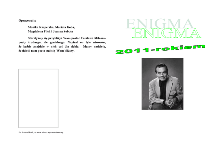 Opracowały: Monika Kasperska, Mariola Koba, Magdalena Pilch i Joanna Sobota Starałyśmy się przybliżyć Wam postać Czesława Miłoszapoety trudnego, ale genialnego. Napisał on tyle utworów, że każdy znajdzie w nich coś dla siebie. Mamy nadzieję, że dzięki nam poeta stał się Wam bliższy. Fot. Erazm Ciołek, za www.miłosz.wydawnictwoemg. www.gpaulbishop.com 1951 r.-porzucenie pracy w ambasadzie w Paryżu ; status emigranta; druk słynnego oświadczenia pt. : ,,Nie na łamach kultury” 1953 r.-„Zniewolony umysł” grudzień 2011r. Kalendarium 1955 r.-„Dolina Issy” 1974 r.-tom wierszy: „Gdzie słońce wschodzi i kędy zapada” 1911 r.-narodziny w Szetejniach na Litwie 1977 r.-eseje :„Ziemia Ulro” 1930 r.-debiut na łamach studenckiego pisma 1980 r.-otrzymanie literackiej nagrody Nobla 1931 r.-pierwszy numer czasopisma ,,Żagary'' i powstanie grupy poetyckiej o tej nazwie 1981 r.-pierwsza od lat wizyta poety w Polsce 1933 r.-książkowy debiut Miłosza- ,,Poemat o czasie zastygłym” 1989 r.-kolejna wizyta poety w Polsce 1986 r.- śmierć pierwszej żony Miłosza- Janiny 1936 r.-„Trzy zimy” 1992 r.-wizyta na Litwie ; ślub z Carol Thigpen 1940 r.-tomik: „Wiersze” wydany w podziemnym wydawnictwie pod pseudonimem Jan Syruć 1998 r.- nagroda „Nike” za tom „Piasek przydrożny” 1945 r.-tom: ,,Ocalenie” z wierszami wojennymi 2002 r.- śmierć drugiej żony poety – Carol 2004 r.- śmierć Miłoszasierpnia 2004. www.culture.pl w emigracyjnym wydawnictwie paryskiej ,,Kultury" i w Polsce poza cenzurą. W 1989r. wrócił do Polski. Mieszkał w Krakowie. W 2000r. z okazji jubileuszu dziewięćdziesiątych urodzin Uniwersytet Jagielloński wyróżnił go srebrnym medalem 600lecia odnowienia Akademii Krakowskiej. Zmarł w 2004r. w Berkeley i w Krakowie. Zmarł 14 sierpnia 2004 Za: www.milosz365.pl/biografia. Biografia Czesław Miłosz urodził się 30 czerwca 1911 r. w Szetejniach na Litwie. Poeta, prozaik, eseista, tłumacz. Laureat nagrody Nobla w roku 1980 i wielu innych prestiżowych nagród literackich, tłumaczony na czterdzieści dwa języki. Doktor honoris causa wielu uniwersytetów w USA i w Polsce, honorowy obywatel Litwy i miasta Krakowa. Szkolną i uniwersytecką młodość Miłosz spędził w Wilnie, gdzie również debiutował jako poeta. Okupację niemiecką przetrwał w Warszawie. Po wojnie pracował w służbie dyplomatycznej PRL-u w USA i we Francji do roku 1951, kiedy to zwrócił się w Paryżu o azyl polityczny. W roku 1960 wyjechał do Kalifornii, gdzie przez dwadzieścia lat jako profesor języków i literatur słowiańskich wykładał na uniwersytecie w Berkeley. Do roku 1989 publikował głównie Złote myśli Jest taka cierpienia granica, za którą się uśmiech pogody zaczyna . A więc pamiętaj – w trudną porę marzeń masz być ambasadorem. Nadziei każdy musi szukać sam dla siebie. Nie ma żadnej powszechnej recepty. Zaiste wariat na swobodzie największą klęską jest w przyrodzie. Żeby napisać mądry wiersz , trzeba wiedzieć więcej niż jest w nim zawarte . I ten żal, że zostajemy w pamięci ludzi głupszymi niż byliśmy w naszych chwilach ostrego zrozumienia . Bo więcej waży jedna dobra strofa niż ciężar wielu pracowitych stronic. W chwili dziejowej, gdy nic nie zależy od człowieka, wszystko zależy od człowieka . Poezja- wzruszenie i powiew, który w trzech kropkach mieszka za przecinkiem. na ten temat stanęła między nami niepisana umowa, za każdym razem, gdy zachodziła konieczność pilnej hospitalizacji, trzeba było trudnych perswazji, by uzyskać na nią zgodę. Gdy tylko jednak kryzys mijał, w klinice – jeszcze słaby, jeszcze przykuty do łóżka – zaczynał od razu czytać, słuchać lektury, pisać lub dyktować. „ Czy pan uważa, że jestem anomalią natury”? – spytał mnie, gdy skończył 91. rok życia. A ja myślałem, że jest jak dąb litewski, szumiący poezją. Za: www.milosz365.pl Inni o Czesławie Miłoszu Aleksander Fiut : - ,,Mistrz”: tak właśnie, spontanicznie, nazywaliśmy z żoną Czesława Milosza, próbując nieudolnie wyrazić przepełniające nas uczucia: podziwu, szacunku, onieśmielenia, uwielbienia i wdzięczności, olśnieni tyleż dziełem, poezją zwłaszcza, co osobą. Andrzej Szczeklik: - W chorobie chciał umrzeć w domu, pośród najbliższych, a nie w szpitalu. Przyjąłem to do wiadomości wiele lat temu, kiedy jeszcze poważnych zagrożeń nie było. I choć Ewa Bieńkowska: Stary poeta. Jeszcze w urodzinowym numerze „TP” pisano o nim jak o mieszkańcu naszego świata. Już nie mógł przyjmować wizyt, z trudem odpowiadał na telefony, ale był. Jego wybrane miejsce na starość – to dom. Za: www.milosz365.pl www.culture.pl Ciekawostki o Miłoszu -Ojciec Miłosza był inżynierem drogowym. Czesława Miłosz studiował na wydziale prawa Uniwersytetu Stefana Batorego w Wilnie. - Nagrodę Nobla otrzymał w 1980 roku. za tomik „Poemat o czasie zastygłym”, uznawany jako debiut książkowy. - Otrzymał nagrodę pieniężną Związku Zawodowego Literatów Polskich, dzięki czemu mógł przez rok mieszkać i tworzyć w Paryżu . - Pod pseudonimem Jan Syruć wydał w 1941r. tomik „Wiersze”. - W 1942r. podjął pracę woźnego w Bibliotece Uniwersytetu Warszawskiego. - Utwory Czesława Miłosza zostały przetłumaczone na 42 języki. - Pisarz otrzymał tytuł Honorowego Obywatela Litwy i Miasta Krakowa. - W swoim życiu Miłosz pracował jako dyplomata, wykładowca akademicki, pisarz, tłumacz, wydawca, historyk. - W 1989r. otrzymał tytuł honoris causa Katolickiego Uniwersytetu Lubelskiego i Uniwersytetu Jagiellońskiego. Podczas wizyty na rodzinnej Litwie w 1992r. otrzymał tytuł doktora honoris causa Uniwersytetu Witolda Wielkiego w Kamie. - Jeden z jego krewnych-Andrzej Miłosz – walczył i był ciężko ranny w bitwie pod Kircholmem w 1605r. - Miłosz zyskał miano Sprawiedliwego wśród Narodów świata. -W PRL- u był uznany