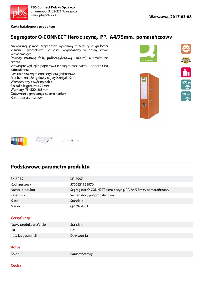 PBS Connect Polska Sp. z o.o. ul. Annopol 3, 03-236 Warszawa www.pbspolska.eu Warszawa, 2017-03-08 Karta katalogowa produktu: Segregator Q-CONNECT Hero z szyną, PP, A4/75mm, pomarańczowy Najwyższej jakości segregator wykonany z tektury o grubości 2,1mm i gramaturze 1290gsm, wyposażony w dolną listwę wzmacniającą Pokryty matową folią polipropylenową (100μm) o strukturze płótna Wewnątrz wyklejka papierowa o szarym zabarwieniu odporna na zabrudzenia Dwustronna, wymienna etykieta grzbietowa Mechanizm dźwigniowy najwyższej jakości Wzmocniony otwór na palec Szerokość grzbietu: 75mm Wymiary: 75x320x285mm Dożywotnia gwarancja na mechanizm Kolor pomarańczowy Podstawowe parametry produktu SKU PBS KF15997 Kod kreskowy 5705831159976 Nazwa produktu Segregator Q-CONNECT Hero z szyną, PP, A4/75mm, pomarańczowy Kategoria Segregatory polipropylenowe Klasa Standard Marka Q-CONNECT Certyfikaty Nowy produkt w ofercie Standard Hit Hit Ilość lat gwarancji Dożywotnia Kolor Kolor Cecha Pomarańczowy PBS Connect Polska Sp. z o.o. ul. Annopol 3, 03-236 Warszawa www.pbspolska.eu Warszawa, 2017-03-08 Karta katalogowa produktu cd. Segregator Q-CONNECT Hero z szyną, PP, A4/75mm, pomarańczowy Podstawowe parametry produktu Produkt Segregator Typ A4/75 Rodzaj Okleinowane Kieszenie Na grzbiecie Materiał Tektura/pp Listwa wzmacniająca Z listwą W ofercie od 2013-01 Etykieta Dwustronna Okleina Jednostronna Wymiary Gramatura (g/m2) 1290 Grubość (mm) 100µm Karton (mm) 2,1 Szerokość (mm) 75 Wymiary (mm) 75x320x285 Format A4 Wspólny słownik zamówień CPV 30199500-5 Segregatory, pudełka na listy, pudełka do przechowywania i podobne wyroby Jednostki logistyczne Opakowanie 1 25 szt Opakowanie 2 600 szt